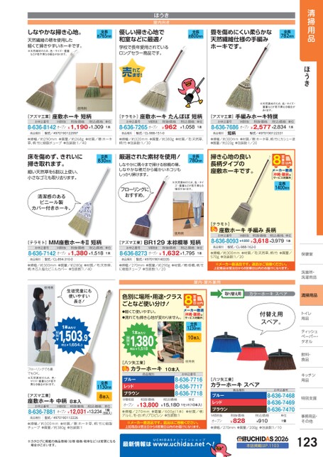 屋内・屋外兼用取り替え用カラーホーキスペア沖縄・離島はサービス対象外全長1230mm10本入使用例お申込番号8-636-77168-636-77178-636-7718付替え用スペア。お申込番号8-636-74688-636-74698-636-7470[八ツ矢工業]カラーホーキスペア商品種別ブルーレッドブラウン税抜価格M価税抜オープン●掃幅/270mm●質量/200g●包装数:1/10税込価格¥910¥828単位1個洗面所・面所・洗濯用品濯用品清掃用品トイレイ用品品ティッシュシュペーパー・パー・タオルタオル飲料・飲料・食品品キッチンキッチン用品品特別支援別支援事務用品・事務用品・その他その他清掃用品ほうきほうき屋内向き全長約765mm優しい掃き心地で和室などに最適!学校で長年愛用されているロングセラー商品です。全長約800mm畳を傷めにくい柔らかな天然繊維仕様の手編みホーキです。全長782mmしなやかな掃き心地。天然繊維の穂を使用した軽くて掃きやすいホーキです。※天然素材のため重量、色・サイズ・などが若干異なる場合があります。使用例※天然素材重量などあります。のため、色・サイズ・が若干異なる場合が[アズマ工業]お申込番号]座敷ホーキ短柄[テラモト]座敷ホーキたんぽぽ短柄[アズマ工業]手編みホーキ特撰8-636-8142オープン¥1,190¥1,309M価税抜税抜価格税込価格単位1本お申込番号M価税抜8-636-7265オープン税抜価格¥962税込価格¥1,058単位1本お申込番号M価税抜税抜価格税込価格8-636-7686オープン¥2,577¥2,834単位1本商品種別型式/4970190122997商品種別型式/CL-988-151-0商品種別型式/4970190122331短柄●掃幅/約290mm草、柄:竹に樹脂チューブ●包装数:1/40●質量/約268g●材質/穂:ホーキ●掃幅/約320mm●質量/約380g●材質/毛:天然草、柄:竹●包装数:1/30●掃幅/約300mm●質量/約320g●包装数:1/20●材質/穂:ホーキ草、柄:竹にカシュー塗床を傷めず、きれいに掃き取れます。細い天然草を6割以上使い、小さなゴミも取り去ります。清潔感のあるビニール製カバー付きホーキ。全長830mm厳選された素材を使用!しなやかに隅々まで掃ける棕櫚の箒。しなやかな穂だから細かいホコリもしっかり掃けます。全長780mm掃き心地の良い長柄タイプの座敷ホーキです。フローリングにおすすめ。※天然素材のため、色・サイズ・重量などが若干異なる場合があります。沖縄・離島はサービス対象外全長1400mm[テラモト]MM座敷ホーキⅡ短柄お申込番号M価税抜8-636-7142オープン税抜価格税込価格¥1,380¥1,518単位1本使用例[アズマ工業]BR129本棕櫚箒短柄お申込番号M価税抜税抜価格税込価格8-636-8273オープン¥1,632¥1,795単位1本商品種別型式/CL-894-310-0商品種別型式/4970190140335●掃幅/約300mm●質量/約280g●材質/毛:天然草、柄:木芯入塩化ビニルカバー●包装数:1/40●掃幅/270mm●質量/約290g●材質/穂:棕櫚、柄:竹に樹脂チューブ●包装数:1/20[テラモト]座敷ホーキ手編み長柄お申込番号M価税抜税抜価格税込価格8-636-8093¥4,850¥3,618¥3,979単位1本商品種別型式/CL-988-162-0●掃幅/約300mm●材質/毛:天然草、柄:竹●質量/570g●包装数:1/20保健室保健室※メーカー直送品です。返品はご容赦ください。上記商品は受注日から8営業日以内のお届けになります。使用例生徒児童にも使いやすい長さ!色別に場所・用途・クラスごとなど使い分け!●軽くて使いやすい。●濡れても掃き心地が変わりません。1本あたり1,380税込¥1,518税抜¥1本あたり1,503.9税込¥1,654.3税抜¥フローリングでも畳でもOK。※天然素材のため、色・サイズ・重量などが若干異なる場合があります。[八ツ矢工業]カラーホーキ10本入商品種別全長1130mm8本入ブルーレッドブラウン[アズマ工業]座敷ホーキ中柄8本入お申込番号M価税抜税抜価格税込価格8-636-7881オープン¥12,031¥13,234単位1組(8本入)商品種別型式/4970190112226●掃幅/約300mm●材質/穂:ホーキ草、柄:竹に樹脂チューブ●質量/約380g●包装数:1税込価格税抜価格¥13,800M価税抜オープン●掃幅/270mmアルミ、毛・台:ポリプロピレン●包装数:1¥15,1801セット(10本入)●質量/600g(1本)●材質/柄:単位※メーカー直送品です。返品はご容赦ください。上記商品は受注日から8営業日以内のお届けになります。※カタログに掲載の商品情報(仕様・価格・税率など)は変更になる場合がございます。最新情報はUCHIDASww.uchidas.netwへ!2026本誌掲載はP.1103123