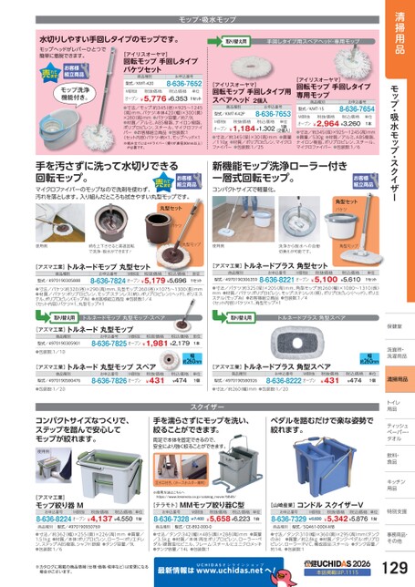 清掃用品モップ・吸水モップ・スクイザー水切りしやすい手回しタイプのモップです。取り替え用手回しタイプ用スペアヘッド・専用モップモップ・吸水モップモップヘッドがレバーひとつで簡単に着脱できます。モップ洗浄機能付き。[アイリスオーヤマ]回転モップ手回しタイプバケツセット商品種別型式/KMT-420お申込番号8-636-7652M価税抜税抜価格税込価格オープン¥5,776¥6,353単位1セット●寸法/モップ:約345(径)×925〜1245●バケツ容量/約7.9L(高)mm、バケツ:本体420(幅)×300(奥)×280(高)mm●材質/アルミ、ABS樹脂、ナイロン樹脂、ポリプロピレン、スチール、マイクロファイバー●お客様組立商品●包装数:1〈セット内容〉バケツ・柄×1、モップヘッド×1※組み立てには+ドライバー(握りが直径30mm以上)が必要です。ヤオ[アイリスーマ]回転モップ手回しタイプ用スペアヘッド2個入商品種別型式/KMT-K42Pお申込番号8-636-7653M価税抜税抜価格税込価格オープン¥1,184¥1,302(2個入)●寸法/約345(径)×30(高)mm●質量/110g●材質/ポリプロピレン、マイクロファイバー●包装数:1/25単位1袋[アイリスオーヤマ]回転モップ手回しタイプ専用モップ商品種別型式/KMT-15お申込番号8-636-7654M価税抜税抜価格税込価格オープン¥2,964¥3,260単位1本●寸法/約345径)×925〜1245(高)mm●質量/530g●材質/アルミ、ABS樹脂、ナイロン樹脂、ポリプロピレン、スチール、マイクロファイバー●包装数:1/6手を汚さずに洗って水切りできる回転モップ。マイクロファイバーのモップなので洗剤を使わず、汚れを落とします。入り組んだところも拭きやすい丸型モップです。丸型セットバケツ新機能モップ洗浄ローラー付き一層式回転モップ。コンパクトサイズで軽量化。角型セットバケツ使用例柄を上下させると高速回転で洗浄・脱水ができます!丸型モップ使用例洗浄から脱水への自動切換えが可能です。角型モップ[アズマ工業]トルネードモップ丸型セット商品種別型式/4970190305888お申込番号M価税抜税抜価格税込価格8-636-7824オープン¥5,179¥5,696単位1セット●寸法/バケツ:約320径)×290(高)mm、丸型モップ:260径)×1075〜1300(長)mm●材質/バケツ:ポリプロピレン、モップ:ステンレス(柄)、ポリプロピレン(ヘッド)、ポリエステル、ポリプロピレン(モップ糸)●お客様組立商品●包装数:1/4〈セット内容〉バケツ×1、丸型モップ×1[アズマ工業]トルネードプラス角型セット商品種別型式/4970190306359お申込番号M価税抜税抜価格8-636-8221オープン¥5,100税込価格¥5,610単位1セット●材質/バケツ:ポリプロピレン、モップ:ステンレス(柄)、ポリプロピレン(ヘッド)、ポリエ●寸法/バケツ:約325径)×205(高)mm、角型モップ:約260幅)×1080〜1310(長)mmステル(モップ糸)●お客様組立商品●包装数:1/4〈セット内容〉バケツ×1、角型モップ×1取り替え用トルネードモップ丸型モップ・スペア取り替え用トルネードプラス角型スペア[アズマ工業]トルネード丸型モップお申込番号M価税抜税抜価格税込価格8-636-7825オープン¥1,981¥2,179単位1本商品種別型式/4970190305901●包装数:1/10商品種別型式/4970190580476●包装数:1/20[アズマ工業]トルネード丸型モップスペアお申込番号M価税抜8-636-7826オープン税抜価格¥431幅約260mm税込価格¥474単位1個[アズマ工業]トルネードプラス角型スペア商品種別型式/4970190580926お申込番号M価税抜8-636-8222オープン税抜価格¥431●寸法/約260(幅)mm●包装数:1/20スクイザー保健室保健室洗面所・面所・洗濯用品濯用品幅約260mm税込価格¥474単位1個清掃用品コンパクトサイズなつくりで、ステップを踏んで安心してモップが絞れます。使用例手を濡らさずにモップを洗い、絞ることができます。ペダルを踏むだけで楽な姿勢で絞れます。両足で本体を固定できるので、固安全により強く絞ることができます。[アズマ工業]モップ絞り器Mお申込番号M価税抜税抜価格税込価格8-636-8224オープン¥4,137¥4,550単位1台注水口付き。(ホースホルダー兼用)※使用方法はこちらへhttps://www.teramoto.co.jp/catalog_movie/5845/[テラモト]MMモップ絞り器C型お申込番号8-636-7328M価税抜¥7,400税抜価格税込価格¥5,658¥6,223単位1台[山崎産業]コンドルスクイザーVお申込番号8-636-7329M価税抜¥6,600税抜価格税込価格¥5,342¥5,876特別支援別支援単位1台商品種別型式/4970190930769商品種別型式/CE-892-000-0商品種別型式/SQ461-000X-MB●寸法/約362(幅)×255(奥)×226(高)mm●質量/1.51kg●材質/本体:ポリプロピレン、ローラー:ポリエチレン、ステップ:ABS樹脂、シャフト:鉄線●タンク容量/9L●包装数:1/6●寸法/タンク:342(幅)×485(奥)×288(高)mm●質量/3.5kg●材質/本体:再生ポリプロピレン、ローラー・ペダル:硬質塩化ビニル、フレーム:スチールにユニクロメッキ●タンク容量/14L●包装数:1●寸法/タンク:310(幅)×360(奥)×295(高)mm(タンクのみ)●質量/約2.8kg●材質/タンク・ペダル:ポリプロピレン、ローラー:PVC、構成部品:スチール●タンク容量/約14L●包装数:1※カタログに掲載の商品情報(仕様・価格・税率など)は変更になる場合がございます。最新情報はUCHIDASww.uchidas.netwへ!2026本誌掲載はP.1115事務用品・事務用品・その他