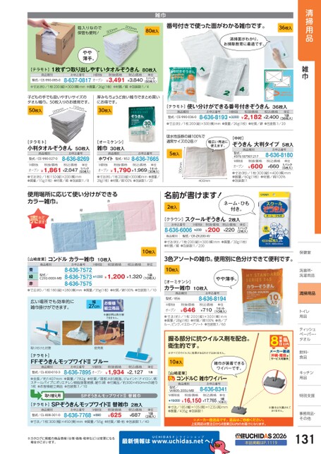 清掃用品雑巾保健室保健室洗面所・面所・洗濯用品濯用品清掃用品トイレイ用品品ティッシュシュペーパー・パー・タオルタオル飲料・飲料・食品品キッチンキッチン用品品特別支援別支援事務用品・事務用品・その他その他[テラモト]使い分けができる番号付きぞうきん36枚入商品種別型式/CE-990-036-0お申込番号M価税抜8-636-8193¥3,000税抜価格税込価格¥2,182¥2,400単位1袋(36枚入)[中村]ぞうきん大判タイプ5枚入商品種別お申込番号税抜価格8-636-8180型式/4976187901217M価税抜オープン●寸法(約)/1枚:300(縦)×400(横)mm●質量/60g1枚)●材質/綿100%●包装数:1税込価格¥660¥6001パック単位(5枚入)吸水性抜群の綿100%で通常サイズの2倍!!幅広い用途に使えます。400mm300mm5枚入●寸法(約)/1枚:200(縦)×300(横)mm●質量/26g1枚)●材質/綿●包装数:1/20名前が書けます!2枚入ネーム・ひも付き。[クラウン]スクールぞうきん2枚入お申込番号8-636-6006M価税抜¥230税抜価格¥200商品種別型式/CR-ZK200-W●寸法(約)/1枚:200(縦)×300(横)mm●材質/綿●包装数:1/200税込価格¥220単位1パック(2枚入)●質量/30g1枚)3色アソートの雑巾。使用別に色分けできて便利です。10枚入やや薄手。[オーミケンシ]カラー雑巾10枚入商品種別型式/856お申込番号8-636-8194単位税抜価格¥646税込価格¥710M価税抜オープン(10枚入)●寸法(約)/1枚:200(縦)×300(横)mm●質量/28g1枚)●材質/綿100%●色/ブルー、ピンク、イエローアソート●包装数:1/601セット握る部分に抗ウイルス剤を配合。衛生的です。※すべてのウイルスに効果があるわけではありません。雑巾が装着できるワイパーです。10本入[山崎産業]コンドルC雑巾ワイパー商品種別型式/WI805-200U-MBM価税抜¥19,000税抜価格お申込番号8-636-8341税込価格単位1組¥16,150¥17,765(10本入)●寸法/185(幅)×105奥)×1235高)mm●質量/435g●包装数:1※メーカー直送品です。返品はご容赦ください。上記商品は受注日から8営業日以内のお届けになります。沖縄・離島はサービス対象外※雑巾は付属されておりません。UCHIDASww.uchidas.netwへ!2026本誌掲載はP.1119131雑巾箱入りなので保管も便利!mm003200mm80枚入やや薄手。番号付きで使った面がわかる雑巾です。36枚入清掃面がわかり、お掃除教育に最適です。[テラモト]1枚ずつ取り出しやすいタオルぞうきん80枚入商品種別型式/CE-990-085-0お申込番号M価税抜8-637-0817オープン税抜価格¥3,491税込価格¥3,840単位1パック(80枚入)●寸法(約)/1枚:200(縦)×300横)mm●質量/26g1枚)●材質/綿●包装数:1/4子どもの手でも扱いやすいサイズのタオル雑巾。50枚入りのお徳用です。50枚入150mmmm002厚みもちょうど良い雑巾でまとめ買いにお得です。30枚入[テラモト]小判タオルぞうきん50枚入[オーミケンシ]雑巾30枚入商品種別型式/CE-990-027-0お申込番号8-636-8269商品種別ホワイト型式/852お申込番号8-636-7665税込価格税抜価格¥1,861¥2,047M価税抜オープン●寸法(約)/1枚:150(縦)×200(横)mm●質量/15g1枚)●材質/綿●包装数:1/8単位1パック(50枚入)税抜価格税込価格¥1,790¥1,969M価税抜オープン(30枚入)●寸法(約)/1枚:200縦)×300(横)mm●質量/28g1枚)●材質/綿100%●包装数:1/20単位1セット使用場所に応じて使い分けができるカラー雑巾。赤緑青[山崎産業]コンドルカラー雑巾10枚入商品種別お申込番号M価税抜税抜価格10枚入税込価格単位型式/C292-000X-MB青緑赤●寸法(約)/1枚:180縦)×280横)mm8-636-75728-636-75738-636-7575¥1,550¥1,200¥1,3201袋(10枚入)●質量/35g(1枚)●材質/綿100%●包装数:1/10広い場所でも効率的に雑巾掛けができます。幅27cm※継ぎ柄は再分解できません。取り付けた状態使用例[テラモト]FFぞうきんモップワイドⅡブルー商品種別型式/CL-830-010-3お申込番号M価税抜8-636-7895オープン税抜価格¥1,934税込価格¥2,127単位1本●全長/約1407mm●質量/782g●材質/頭部:ABS樹脂、ジョイント:ナイロン、柄:スチールパイプにポリエチレン樹脂接着被膜、雑巾:綿●付属品/約300×450mmの雑巾1枚●お客様組立商品●包装数:1/10取り替え用SPぞうきんモップワイドⅡ替雑巾[テラモト]SPぞうきんモップワイドⅡ替雑巾2枚入商品種別型式/CL-808-301-0お申込番号8-636-7768M価税抜¥890税抜価格¥625税込価格¥687単位1袋(2枚入)●寸法/1枚:300(幅)×450(奥)mm●質量/55g●材質/綿・他●包装数:1/40※カタログに掲載の商品情報(仕様・価格・税率など)は変更になる場合がございます。最新情報は
