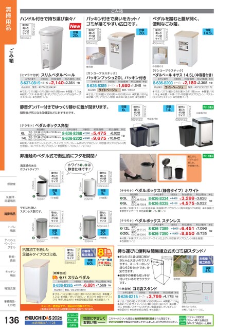 ごみ箱パッキン付きで臭いをカット!ゴミが捨てやすい広口です。ペダルを踏むと蓋が開く、便利なごみ箱。容量14.5L500mm以上取付に適したポリ袋サイズ450mm以上容量20L600mm以上取付に適したポリ袋サイズ500mm以上容量20Lハンドル付きで持ち運び楽々!600mm以上取付に適したポリ袋サイズ500mm以上[ヒマラヤ化学]お申込番号スリムペダルペールM価税抜税抜価格税込価格8-637-0819¥2,140¥2,140¥2,354単位1台商品種別型式/4977425304241●寸法/215(幅)×375(奥)×465(高)mm●材質/フタ・本体・取っ手:ポリプロピレン、ペダル他パーツ:スチロール●包装数:1/6●質量/1.3kg使用例[サンコープラスチック]パッキンプッシュ20Lパッキン付きお申込番号8-636-8389オープン¥1,680¥1,848M価税抜税抜価格税込価格単位1台商品種別ライトベージュ型式/03367●寸法/224幅)×306(奥)×420高)mm●質量/891g●材質/ポリプロピレン樹脂●本体に袋止め付●包装数:1中容器付き[サンコープラスチック]ペダルペールキサス14.5L(中容器付き)お申込番号8-636-8203オープン¥2,180¥2,398M価税抜税抜価格税込価格単位1台商品種別ライトベージュ型式/4973230220172●質量/約●寸法/273(幅)×288(奥)×381(高)mm1.4kg●材質/本体・フタ・中容器:ポリプロピレン、ペダル・ロッド:ポリスチレン●包装数:1/8中容器付き600mm以上取付に適したポリ袋サイズ500mm以上容量14L中容器付き500mm以上取付に適したポリ袋サイズ450mm以上容量6L静音ダンパー付きでゆっくり静かに蓋が閉まります。開閉音が気になる保健室などにおすすめです。[テラモト]ペダルボックス角型商品種別お申込番号M価税抜税抜価格寸法/200(幅)×270(奥)×290(高)mm、型式/DS-238-606-0寸法/275(幅)×350(奥)×435(高)mm、型式/DS-238-614-06L14L●材質/本体:ステンレス(ヘアーライン仕上げ)、フレーム枠:ポリプロピレン、中容器:ポリプロピレン(再生樹脂)、14Lペダル:ポリプロピレン●包装数:1/6(6L)、1/214L)8-636-8268¥7,300¥5,4758-636-8202¥12,900¥9,6751台単位税込価格¥6,022¥10,642衛生的なペダル式の屑入れ。中容器付き。使用例お申込番号8-636-83348-636-8335M価税抜¥4,400¥6,100税抜価格税込価格¥3,299¥3,628¥4,575¥5,032単位1台商品種別型式/DS-238-703-8型式/DS-238-705-83L5L●●[テラモト]ペダルボックス(静音タイプ)ホワイト●材質/本体:スチールに粉体塗装、中容器:ポリプロピレン(再生樹脂90%使用)●中容器付●静音ダンパー付●包装数:●1/6、●1/4お申込番号8-636-73898-636-7390M価税抜税抜価格税込価格¥8,600¥6,451¥7,096¥11,800¥8,850¥9,735単位1台商品種別型式/DS-238-512-0型式/DS-238-520-012L20L●●[テラモト]ペダルボックスステンレス●材質/本体:ステンレス(ヘアーライン仕上げ)、中容器:ポリプロピレン(再生樹脂)●包装数:1/2持ち運びに便利な簡易組立式のゴミ袋スタンド!●45Lのゴミ袋は開口部が30cmと大きいので入れやすく、スーパーのレジ袋なら2枚セットでき、分別できます。●使用中の移動も取っ手が付いているのでラクラクです。容量45L使用例[小林金物]ゴミ袋スタンドお申込番号M価税抜税抜価格税込価格単位8-636-8215オープン¥3,799¥4,1781台●寸法/390(幅)×310(奥)×590(高)mm●質量/1.5kg●適応ゴミ袋サイズ/650(幅)×800(高)mm●容量/45L●材質/スチール(カチオン電着塗装)、ポリエチレン●袋留め付●お客様組立商品●包装数:1使わないときは、分解して省スペースに。400mm以上取付に適したポリ袋サイズ350mm以上容量5L(中容器)600mm以上取付に適したポリ袋サイズ500mm以上容量20L(中容器)205mm305mm270mm●450mm●ホワイト❶、❷は静音仕様です!350mm以上取付に適したポリ袋サイズ300mm以上容量3L(中容器)550mm以上取付に適したポリ袋サイズ450mm以上容量12L(中容器)清潔感のあるホワイトタイプ!168mm235mm●サビにも強いステンレス製です。250mm395mm●非接触のペダル式で衛生的にフタを開閉!容量60L沖縄・離島はサービス対象外900mm以上取付に適したポリ袋サイズ800mm以上抗菌加工を施した足踏みタイプのゴミ箱。[新輝合成]セパスリムペダルお申込番号8-636-8385M価税抜¥8,200税抜価格¥6,881¥7,569税込価格単位1台商品種別型式/DS-240-660-0●質量/●材質/ポリプロピレン●コロ付●両サイドフッ●寸法/325(幅)×480(奥)×650(高)mm3.2kgク付●ポリ袋止め付●お客様組立商品●包装数:1/4※メーカー直送品です。返品はご容赦ください。上記商品は受注日から8営業日以内のお届けになります。清掃用品ごみ箱保健室保健室洗面所・洗面洗濯用品洗濯用清掃用品トイレトイ用品用ティッシュティッペーパー・タオルタオル飲料・飲料・食品食キッチンキッチン用品用特別支援特別支事務用品・事務用品・その他その他1362026本誌掲載はP.1128地球にやさしくお買い物このマークのついた商品は地球環境保護に配慮された商品です。グリーンの文字で商品の判別をしやすくしました。どうぞご利用ください。エコマーク認定品グリーン購入法適合品GPNエコ商品ねっと掲載