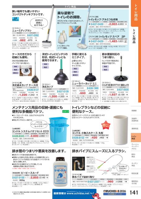 トイレ用品トイレ用品保健室保健室洗面所・面所・洗濯用品濯用品清掃用品清掃用品トイレ用品ティッシュシュペーパー・パー・タオルタオル飲料・飲料・食品品キッチンキッチン用品品使用例密接ワイヤーコシがあるのでラクに押し込むことができます。間隔ワイヤーパイプ曲部でもやわらかくしなって入り込みます。[アズマ工業]排水パイプ詰まり取り商品種別お申込番号M価税抜型式/49701904775858-637-2207オープンコシがあってやわらかいワイヤー。※適する排水パイプ十字栓、金属製パイプ、Sトラップ特別支援別支援税抜価格¥960税込価格¥1,056単位1個●寸法/約900(長)mm、ブラシ径40mmワイヤー:ステンレス、グリップ:ポリプロピレン●包装数:1/40●質量/60g●材質/ブラシ:ナイロン、UCHIDASww.uchidas.netwへ!2026本誌掲載はP.1133事務用品・事務用品・その他その他141トイレ用品楽な姿勢でトイレのお掃除。手を汚さず洗って絞れる丸形モップ。軽くてサビにくいアルミ柄。●[アズトイマ工業]レモップ・アルミつなぎ柄お申込番号M価税抜税抜価格税込価格8-637-0428オープン¥2,003¥2,203●商品種別法/約100(幅)×50(奥)×1010(全長)mm寸●210gポリエステル、レーヨン●質量/●材質/柄:アルミ、カバー:ポリエチレン、モップ糸:型式/4970190390310●包装数:1/20単位1本[アズマ工業]お申込番号トイレモップ・スペア2PM価税抜税抜価格税込価格8-637-0429オープン¥1,483¥1,631単位1セット(2個入)型式/4970190344566法/約230mm径レーヨン●包装数:1/30●質量/約58g●材質/ポリエステ●商品種別寸●ル、節水便器対応のつまり取り。トレイ付きで衛生的に保管が可能です。洋式和式●手軽に使えるミニタイプ。必要なときにサッと使いやすいサイズです。洋式和式排水口[テラモト]ニューラバーカップミニ商品種別型式/CL4210200お申込番号8-638-1900単位1個税抜価格¥600税込価格¥660M価税抜オープン●寸法/約130(幅)×130奥)×280(高)mm●質量/約215g●材質/柄:ポリプロピレン、頭:合成ゴム●洋式・和式・排水口●包装数:1/20[テラモト]トイレのつまり取りFITワイド短柄トレイ付商品種別型式/CL4210800お申込番号8-637-0500税込価格税抜価格¥1,937¥2,130M価税抜オープン●寸法/298(幅)×233(奥)×457(高)mm●質量/550g●和式・洋式●包装数:1/10※一部の便器にはご使用になれない場合があります。単位1本トイレブラシなどの収納に便利なケース。別売のインナーバスケット仕切り板ECOAで区切ったスペースにも入るサイズです。[山崎産業]コンドル小物入れケース丸型お申込番号8-636-8153M価税抜¥500税抜価格¥420税込価格¥462単位1個商品種別型式/FU723-000X-MB●寸法/92〜85(径)×170(高)mm●質量/108g●包装数:1/20排水パイプにスムーズに入るブラシ。狭い場所でも使いやすいコンパクトデッキブラシです。全長696mm水まわり清掃におすすめ![テラモト]ニューミディブラシ商品種別型式/CE-488-500-0お申込番号8-637-0282M価税抜¥1,200税抜価格¥882税込価格¥970単位1本●寸法/130(幅)×50奥)×696全長)mm●質量/210g●材質/柄:直径19.1mmスチールパイプにポリエチレン接着皮膜、毛:ポリエステル●包装数:1/20ケース付きだから収納にも便利。洋式・和式便器・排水パイプのつまり取りに。洋式和式排水口使用例[アズマ工業]洋式通水カップケース付商品種別お申込番号税抜価格8-636-8137型式/4970190479350M価税抜オープン●寸法/(収納時)175(幅)×640(高)mm●質量/458g●材質/ヘッド:合成ゴム、柄:スチール、ケース:ポリプロピレン●洋式・和式・排水口●包装数:1/12¥1,220¥1,342税込価格単位1本130mmトイレ用モップのスペア2個組。洋式トイレにピッタリの形状。和式トイレにも使用できます。洋式和式[テラモト]洋式カップ商品種別型式/CL-422-000-0お申込番号8-637-0109M価税抜¥1,600税抜価格税込価格¥1,200¥1,320単位1本●寸法/165(直径)×655(全長)mm約520g●洋式・和式●包装数:1/10●質量/メンテナンス用品の収納・運搬にも便利な多機能バケツ。●ホースキーパー付き、左右どちらも注げるそそぎ口付き。●再生ポリプロピレン製です。バケツとインナーバスケットのセットです![山崎産業]コンドルシステムバケツセットECOお申込番号M価税抜税抜価格税込価格単位8-636-8345¥3,100¥2,600¥2,8601セット商品種別型式/CL883-000X-MB●寸法/320(幅)×290奥)×300高)mm●質量/930g●容量/14L●材質/本体:再生ポリプロピレン、バスケット取っ手:スチール●包装数:1排水管のつまりや悪臭を改善します。●粉末タイプの排水管洗浄剤です。●発熱による軟化作用と発泡による剥離作用により、排水トラブルの原因となる油脂タンパク汚れを強力に溶解します。●粘性汚れを溶解することで付着している堆積物も同時に除去できます。※大便器・小便器への使用には適しておりません。[和協産業]ピーピースルーFお申込番号M価税抜税抜価格税込価格8-637-0156オープン¥2,855¥3,140単位1本商品種別600g●寸法/95(径)×190(高)mmケイ酸ナトリウム、水酸化ナトリウム、過炭酸塩、他●包装数:1/12●質量/600g●成分/※カタログに掲載の商品情報(仕様・価格・税率など)は変更になる場合がございます。最新情報は