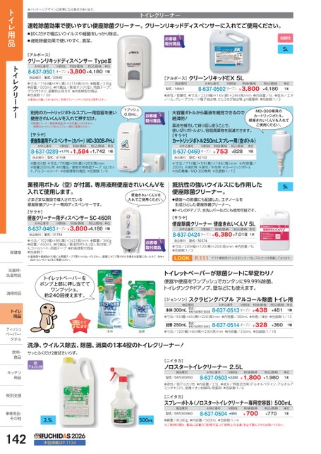 ※パッケージデザインは変更になる場合があります。トイレクリーナー速乾除菌効果で使いやすい便座除菌クリーナー。クリーンリキッドディスペンサーに入れてご使用ください。●拭くだけで幅広いウイルスや細菌をしっかり除去。●速乾除菌効果で使いやすく、清潔。弱酸性[アルボース]クリーンリキッドディスペンサーTypeⅢお申込番号M価税抜税抜価格税込価格8-637-0501オープン¥3,800¥4,180単位1個商品種別型式/33540●寸法/116(幅)×91(奥)×215(高)mm●容量/500mL●付属品/薬液タンク(空)、両面テープ、プラグ付ネジ、盗難防止用カギ●お客様取付商品●包装数:1/20※薬液は付属しておりません。別売のクリーンリキッドEXをご使用ください。●質量/330g別売のカートリッジボトルスプレー用容器を使い便座きれいくんVを入れて押すだけ。※除菌クリーナー薬液専用空ボトルは付属しておりません。別売のカートリッジボトルスプレー用をご使用ください。1プッシュ0.8mL。[サラヤ]便座除菌用ディスペンサー(カバー)MD-300B-PHJお申込番号M価税抜税抜価格税込価格8-637-0289¥1,770¥1,584¥1,742単位1個[アルボース]クリーンリキッドEX5L商品種別型式/14663お申込番号M価税抜8-637-0502オープン税抜価格¥3,8005L税込価格¥4,180単位1本●液性/弱酸性ノール、グレープフルーツ種子抽出物、さとうきび抽出物、pH調整剤●包装数:1/3●寸法/233(幅)×145(奥)×246(高)mm●内容量/5L●成分/エタMD-300専用のカートリッジボトル。便座きれいくんVを入れてご使用ください。大容量ボトルから薬液を補充できるので経済的!薬液を補充して繰り返し使うことで、使い切りボトルより、容器廃棄物を削減できます。[サラヤ]カートリッジボトル250mLスプレー用(空ボトル)お申込番号M価税抜8-637-0469オープン税抜価格¥753税込価格¥828単位1個商品種別型式/41938●壁付け型●寸法/79(幅)×99(奥)×203(高)mm●容量250mL用●付属品/壁取付用両面テープ、ねじセット、アルコールシート●お客様取付商品●包装数:1/6商品種別型式/42102●寸法/71(幅)×59(奥)×186(高)mm250mL●対応機種/MD-300専用●包装数:1/12●液状用●液性/中性用●カートリッジボトル●内容量/業務用ボトル(空)が付属、専用液剤便座きれいくんVを入れて使用します。便座きれいくんVを入れてご使用ください。さまざまな施設で導入されている便座除菌クリーナー専用ディスペンサーです。[サラヤ]便座クリーナー用ディスペンサーSC-460Rお申込番号M価税抜税抜価格税込価格8-637-0463オープン¥3,800¥4,180単位1個商品種別型式/41753抵抗性の強いウイルスにも作用した便座除菌クリーナー。5L●便座への影響にも配慮した、エタノールを主成分とした便座除菌クリーナー。●トイレのドアノブ、水洗レバーなどにも使用可能です。[サラヤ]便座除菌クリーナー便座きれいくんV5Lお申込番号M価税抜税抜価格税込価格8-637-0424オープン¥6,380¥7,018単位1本●寸法/102(幅)×88(奥)×242(高)mm●容量/450mLルコールシート、両面テープ●お客様取付商品●包装数:1※塗装面や壁紙貼りの壁には両面テープで取りつけないでください。壁面にネジで取り付ける場合は壁面に合ったネジ(M4×●付属品/薬液用ボトル(空)、取付板、ア●質量/360g25タッピンネジ)などをご用意ください。商品種別型式/50274●寸法/209幅)×120奥)×293高)mm●内容量/5L●包装数:1/3P.1149サラヤ業務用ボトル注ぎ口カップ&ノズルセットを掲載しております。サ務用トル注ぎ口カルセットを掲載しておま。トイレットペーパーをポンプ上部に押し当ててワンプッシュ。約240回使えます。トイレットペーパーが除菌シートに早変わり!便器や便座をワンプッシュでカンタンに99.99%除菌。トイレタンクやドアノブ、壁などにも使えます。[ジョンソン]スクラビングバブルアルコール除菌トイレ用商品種別本体300mL●寸法/93幅)×65(奥)×220(高)mm型式/4901609016538お申込番号M価税抜8-637-0513オープン税抜価格¥438税込価格¥481単位1個●内容量/300mL●状態/液状●包装数:1/12本体詰替詰替250mL●寸法/120(幅)×60(奥)×200(高)mm●内容量/250mL8-637-0514オープン型式/4901609016545¥328¥3601個●包装数:1/18洗浄、ウイルス除去、除菌、消臭の1本4役のトイレクリーナー!サッとふくだけ2度拭きいらず。弱アルカリ性2.5L500mL[ニイタカ]ノロスタートイレクリーナー2.5L商品種別型式/SW5303050お申込番号M価税抜8-637-0503¥2,250税抜価格¥1,800税込価格¥1,980単位1本●液性/弱アルカリ性●内容量/2.5L●成分/界面活性剤(アルキルベタイン、アルキルアミンオキシド)、金属イオン封鎖剤、除菌剤●包装数:1/6[ニイタカ]スプレーボトル(ノロスタートイレクリーナー専用空容器)500mL商品種別型式/SW5303060お申込番号8-637-0504M価税抜¥950税抜価格¥700税込価格¥770単位1本●質量/約380g※ご使用の際は、製品に記載の「使用方法」と「使用上の注意」を必ず読んでからお使いください。●内容量/500mL●包装数:1/4トイレ用品トイレクリーナー保健室保健室洗面所・洗面洗濯用品洗濯用清掃用品清掃用品トイレ用品ティッシュティッペーパー・タオルタオル飲料・飲料・食品食キッチンキッチン用