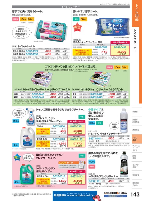 トイレ用品トイレクリーナーティッシュシュペーパー・パー・タオルタオル飲料・飲料・食品品キッチンキッチン用品品特別支援別支援事務用品・事務用品・その他その他厚手で丈夫!流せるシート。除菌と消臭のダブル効果。弱酸性10枚入20枚入(容器入)(詰替用)日常のお手入れに!便座の除菌もOKです。詰替用・20枚入※パッケージデザインは変更になる場合があります。トイレクリーナー使いやすい厚手シート。使用後、そのままトイレに流せます。中性30枚入※仕様が変わる場合があります。[花王]トイレクイックル商品種別お申込番号M価税抜容器入・10枚入8-637-0329オープン詰替用・20枚入8-637-0090税抜価格¥330¥459税込価格¥363¥504単位1個1袋(10枚入)(20枚入)●液性/弱酸性●寸法/容器:159(幅)×118(奥)×75(高)mm●シート寸法/310(横)×245縦)mm●材質/シート:パルプ●成分/界面活性剤、グリコールエーテル、安定化剤、除菌剤●包装数:1/121個(30枚入)8-637-0382オープンM価税抜税抜価格税込価格「まとめ買いパック」は、「1組」単位でお申し込みください。¥112¥123●液性/中性●寸法/200幅)×90奥)×50高)mm●質量/215gニウム、香料●30枚入●包装数:1/20[協和紙工]流せるトイレクリーナー厚手商品種別型式/15-054まとめ買いパック1組(20個入)8-637-0459ー¥2,000¥2,200●シート材質/パルプ●成分/水、エタノール、紙力強化剤、塩化ベンザルコ●シート寸法/約250×160mmゴシゴシ拭いても破れにくい!トイレに流せる。除菌99.9%&消臭&24時間抗菌・防臭。※メーカーの都合により商品仕様・パッケージなど変更する場合がございます。弱酸性10枚入20枚入(本体)(詰替)本体本体[大王製紙]キレキラ!トイレクリーナークリーンフローラル[大王製紙]キレキラ!トイレクリーナーシトラスミント商品種別お申込番号M価税抜税抜価格商品種別お申込番号M価税抜税抜価格型式/210005758-637-0440オープン型式/210005568-637-0441本体詰替(20枚入)●液性/弱酸性●寸法/容器:150(幅)×120(奥)×62(高)mm●シート寸法/330(横)×約225(縦)mm●材質/パルプ●成分/界面活性剤、グリコールエーテル、安定化剤、除菌剤、香料●本体:10枚入、詰替:20枚入●包装数:1/12●質量/本体:277g、詰替:403g¥360¥381(10枚入)1箱型式/210005778-637-0442オープン型式/210005608-637-0443本体詰替(20枚入)●液性/弱酸性●寸法/容器:150(幅)×120奥)×62(高)mm●シート寸法/330(横)×約225(縦)mm●質量/本体:277g、詰替:403g●材質/パルプ●成分/界面活性剤、グリコールエーテル、安定化剤、除菌剤、香料●本体:10枚入、詰替:20枚入●包装数:1/12¥360¥381(10枚入)1箱単位1箱税込価格¥396¥419単位1箱税込価格¥396¥419便座のおそうじにも使えます。350mL4.5Lトイレの消臭もおそうじもできるクリーナー。[花王]トイレマジックリン消臭・洗浄スプレーミント商品種別350mL「まとめ買いパック」は、「1組」単位でお申し込みください。商品種別業務用4.5L「まとめ買いパック」は、「1組」単位でお申し込みください。1本8-637-0450M価税抜税抜価格税込価格オープン¥299¥3281本8-637-0123オープンM価税抜税抜価格¥1,979¥2,176税込価格中性まとめ買いパック1組(12本入)8-637-0381ー¥3,588¥3,9461組(4本入)8-637-0125ー¥7,773¥8,550中性タイプは、高い安全性で安心して毎日使えます。800mL中性除菌・消臭。[リンレイ]R'SPRO中性トイレクリーナーお申込番号M価税抜8-637-0148オープン税抜価格¥530税込価格¥583商品種別中性型式/SW-988-203-0保健室保健室洗面所・面所・洗濯用品濯用品清掃用品清掃用品単位1本トイレ用品●液性/中性●内容量/800mL●成分/アルコール系溶剤・非イオン系界面活性剤・粘度調整剤・除菌剤・香料・染料・水●包装数:1/12※小分けキャップは別売です。●液性/中性●包装数:1/12(350mL)、1/4(業務用4.5L)安心の中性タイプ。黄ばみ・黒ずみスッキリ!クレンザータイプ。[花王]トイレマジックリン強力クレンザーP.1152花王業務用ボトル専用小分けキャップを掲載しております。中性黒ずみや尿石などの汚れをしっかり落とします。400g弱酸性4.5kg商品種別業務用4.5kg「まとめ買いパック」は、「1組」単位でお申し込みください。1本8-637-0010オープンM価税抜税抜価格¥1,530¥1,683税込価格※小分けキャップは別売です。●液性/中性●包装数:1/4※カタログに掲載の商品情報(仕様・価格・税率など)は変更になる場合がございます。最新情報はまとめ買いパック1組(4本入)8-637-0113ー¥6,100¥6,710[カネヨ]トイレ用セラミッククリーナーお申込番号8-638-1901400g商品種別M価税抜¥298税抜価格¥298税込価格¥327単位1本型式/4901329210865●液性/弱酸性●寸法/70幅)×42奥)×225高)mm●包装数:1/24UCHIDASww.uchidas.netwへ!2026本誌掲載はP.1135143