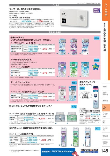 トイレ用品トイレ用品・芳香剤・消臭剤保健室保健室洗面所・面所・洗濯用品濯用品清掃用品清掃用品トイレ用品ティッシュシュペーパー・パー・タオルタオル飲料・飲料・食品品ずーっとニオわせない。ナノパウダーによる高い消臭効果とクエン酸によりクリアなトイレ空間をキープ。400mL信頼のロングセラー消臭スプレー。280mL税込価格単位¥4271個トイレ後の悪臭を瞬間消臭。●容量/400mL●成分/無機系消臭剤・クエン酸、●●お申込番号M価税抜税抜価格8-637-0465オープン¥389●●寸法/86(幅)×62(奥)×167(高)mm界面活性剤、香料(クリーンソープのみ)●液状●包装数:1/188-637-0466型式/4901070130535型式/4901070130528無香料クリーンソープ●商品種別[エステー]トイレの消臭力CLEARKEEP細かいクラッシュゲルが悪臭をすばやくキャッチ!1.7kgお申込番号8-637-00298-637-00308-637-0031M価税抜税抜価格税込価格単位オープン¥375¥4121個●●●●植物精油●包装数:1/18商品種別ラベンダーアップルミントアクアソープ●●●容量/400mL●[小林製薬]トイレその後に無香料280mL無香料商品種別型式/4987072036358税抜価格お申込番号8-637-0418¥328税込価格¥360M価税抜オープン●内容量/280mL●成分/脂肪酸塩系消臭剤、第四級アンモニウム塩、エタノール●包装数:1/28単位1本365mLキッチンキッチン用品品特別支援別支援事務用品・事務用品・その他その他●2026本誌掲載はP.1137145●へ!●成分/エタノール、植物抽●●消臭力業務用クラッシュゲルタイプトイレ用お申込番号M価税抜税抜価格税込価格単位8-637-0493オープン¥1,320¥1,4521個商品種別型式/4901070130405型式/4901070130412無香料森林❿●[エステーPRO]●寸法/155(幅)×140奥)×152(高)mm●内容量/1.7kg出消臭剤、吸水性樹脂●使用目安/4〜6カ月●包装数:1/68-637-04943D広角ジェット噴射で瞬時に空間をまるごと消臭。お申込番号型式/型式/49010701309628-637-050849010701309798-637-050949010701309558-637-0510型式/M価税抜税抜価格税込価格単位オープン¥430¥4731本●成分/植物抽出消臭剤、香料(無香料を除く)、除菌剤、エタノール●商品種別ラベンダーアップルミント無香料●●●容量/365mL●包装数:1/24●[エステー]トイレの消臭力スプレー※カタログに掲載の商品情報(仕様・価格・税率など)は変更になる場合がございます。最新情報はUCHIDASww.uchidas.netwセンサー式。触れずに使えて衛生的。新品電池で約3000回使用できます。設置方法はネジまたは両面テープ(付属)。トイレ用品※パッケージデザインは変更になる場合があります。[オーム電機]センサー式流水音発生器商品種別型式/OGH-SS1お申込番号M価税抜8-637-0464オープン税抜価格¥1,280税込価格¥1,408単位1個●耐熱温度/0〜40℃●材質/ABS●寸法/120(幅)×21奥)×70(高)mm樹脂●センサー感知距離/約5cm●音量/2段階●動作時間/約25秒●電源/単三乾電池×2個(別売)●付属品/保証書付取扱説明書、本体貼り付け用シール×1枚、両面テープ×2枚、固定用ネジ×2本●お客様取付商品●包装数:1●質量/70g芳香剤・消臭剤400mL400mL●質量/470g●容量/400mL●液体タイプ●●●最後の一滴までしっかり消臭芳香効果が続く「スッキーリ方式」!M価税抜税抜価格税込価格単位オープン¥350¥3851個商品種別お申込番号さわやかなフローラルソープ優美なナチュラルラベンダー無香料49010806469108-637-038549010806470168-637-038649010806492188-637-0387●●●寸法/86(幅)×66(奥)×174(高)mm●成分/植物成分・イオン系消臭剤●包装数:1/16●型式/型式/型式/[アース製薬]スッキーリ!トイレ用すっきり香る消臭長持ち。●ラベルフィルムをはがせば、デザインすっきり。●香りの強さが調整できます。[エステー]トイレの消臭力