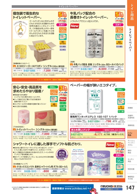 トイレ用品トイレットペーパートイレットペーパー個包装で衛生的なトイレットペーパー。ゴールドリボンは小児がんの子どもたちを支える活動のための世界共通のシンボルマークです。この製品は売上げの一部を「ゴールドリボン」を通じて小児がんの子どもたちを支える活動に役立てています。北海道・沖縄・離島はサービス対象外芯ありシングル100m114mm幅80ロール入ミシン目入エンボス牛乳パック配合の長巻きトイレットペーパー。ソフトタイプでミシン目入りです。沖縄・離島はサービス対象外芯ありシングル130m107mm幅60ロール入ミシン目入[特種東海エコロジー]エコロジーゴールドリボンシングル100m(個包装)商品種別型式/018110お申込番号8-637-0265M価税抜オープン税抜価格税込価格¥7,200¥7,920●寸法/114(幅)mm×100(長)m●梱包ケース寸法/440×530×480mm38mm●材質/再生紙●ミシン目入●エンボス●芯あり●包装数:1単位1箱(80ロール入)●穴径/[花岡]牛乳パック配合長巻シングル130m6ロール×10パック商品種別お申込番号M価税抜税抜価格型式/31107978-638-1907オープン¥6,500(60ロール入)●寸法/107(幅)mm×シングル:130(長)、ダブル:65長)m●梱包ケース寸法/460×580×330mm●ミシン目入り●芯あり●包装数:1●材質/牛乳パック配合再生紙、ピュアパルプ●穴径/約35mm1セット税込価格¥7,150単位※メーカー直送品です。返品はご容赦ください。上記商品は受注日から5営業日以内のお届けになります。安心・安全・高品質を求めたらやはり国産!●再生紙100%使用!シングル150m巻の48ロール入です。●ケース単位でのご購入で注文&配送の回数が減ってエコ!●ロングロールだから取替の回数が減ってエコ!●水に流せる包装紙。芯なしシングル150m107mm幅48ロール入沖縄・離島はサービス対象外ペーパーの幅が狭いエコタイプ。芯なしシングル150m107mm幅6ロール入保健室保健室[TANOSEE]トイレットペーパーシングル150m(個包装)商品種別型式/TS1548Rお申込番号M価税抜税抜価格8-638-1909オープン¥7,000税込価格¥7,700単位1箱●寸法/107(幅)mm×150(長)m●穴径/約36mm340mm●材質/パルプ100%●芯なし●日本製●包装数:1(48ロール入)●梱包ケース寸法/464×464×[コアレックス]業務用ワンタッチコアレス150-1071パック商品種別お申込番号M価税抜税抜価格シングル150m●寸法/107幅)mm×150長)m●穴径/約36mm●材質/再生紙●芯なし●包装数:1/8※107mm幅対応のワンタッチペーパーホルダーでもお使いいただけます。8-637-0264オープン¥796型式/310091パック(6ロール入)税込価格¥875単位まとめ買いパック8-637-0274お申込番号※1組単位申込。税抜価格¥6,171税込価格¥6,788単位1組(8パック入)●梱包ケース寸法/446×446×332mmシャワートイレに適した厚手でソフトな肌ざわり。●給水性に優れたウォータリングエンボス加工で、シャワートイレに適したぬれても破れにくい、丈夫なシートです。●リンゴ酸配合の消臭成分を含ませた芯で、トイレの中のアンモニア臭を軽減します。●省スペースで保管もスッキリ。もしものときの災害・備蓄用としてもおすすめです![日本製紙クレシア]クリネックスコンパクト長持ちシャワートイレ用ダブル8ロール入商品種別型式/28702お申込番号M価税抜8-638-1910オープン税抜価格¥800税込価格¥880単位1袋(8ロール入)●寸法/114(幅)mm×35(長)m●パッケージ寸法/234(幅)×234(奥)×228(高)mm●材質/パルプ100%●ミシン目入り●エンボス●芯あり●無香料●包装数:1※メーカー直送品です。返品はご容赦ください。上記商品は受注日から3営業日以内のお届けになります。沖縄・離島はサービス対象外芯ありダブル35m114mm幅8ロール入エンボス洗面所・面所・洗濯用品濯用品清掃用品清掃用品トイレ用品ティッシュシュペーパー・パー・タオルタオル飲料・飲料・食品品キッチンキッチン用品品特別支援別支援事務用品・事務用品・その他その他※カタログに掲載の商品情報(仕様・価格・税率など)は変更になる場合がございます。最新情報はUCHIDASww.uchidas.netwへ!2026本誌掲載はP.1139147