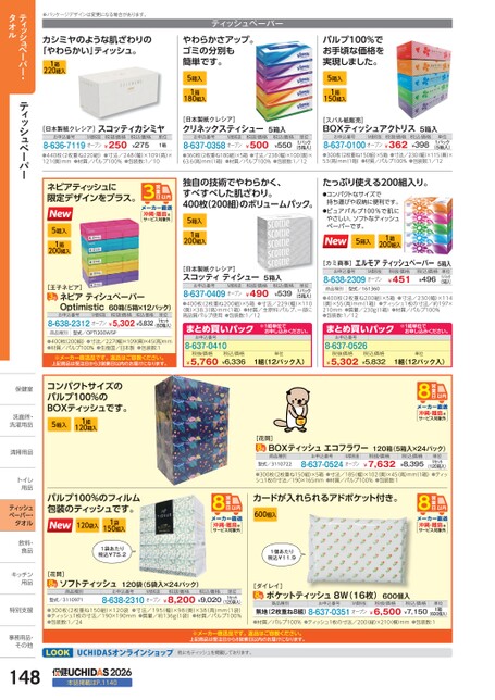 ※パッケージデザインは変更になる場合があります。カシミヤのような肌ざわりの「やわらかい」ティッシュ。1箱220組入ティッシュペーパーやわらかさアップ。ゴミの分別も簡単です。5箱入1箱180組入パルプ100%でお手頃な価格を実現しました。5箱入1箱150組入[日本製紙クレシア]スコッティカシミヤお申込番号M価税抜税抜価格8-636-7119オープン¥250税込価格¥275単位1箱●440枚(2枚重ね220組)●寸法/248(幅)×109高)×121(奥)mm●材質/パルプ100%●包装数:1/10ネピアティッシュに限定デザインをプラス。沖縄・離島はサービス対象外5箱入1箱200組入[王子ネピア]ネピアティシュペーパーOptimistic60箱(5箱×12パック)お申込番号M価税抜税抜価格税込価格8-638-2312オープン¥5,302¥5,832単位1セット(60箱入)商品種別型式/OPTI200W5P●400枚(200組)●寸法/227幅)×109奥)×45高)mm●材質/パルプ100%●生産国/日本製●包装数:1※メーカー直送品です。返品はご容赦ください。上記商品は受注日から3営業日以内のお届けになります。コンパクトサイズのパルプ100%のBOXティッシュです。5箱入1組120箱入[日本製紙クレシア]クリネックスティシュー5箱入お申込番号M価税抜8-637-0358オープン(5箱入)●360枚(2枚重ね180組)×5箱●寸法/238幅)×100(奥)×63.6(高)mm(1箱)●材質/パルプ100%●包装数:1/121パック税抜価格¥500税込価格¥550単位[スバル紙販売]BOXティッシュアクトリス5箱入お申込番号M価税抜税抜価格8-637-0100オープン¥362(5箱入)●300枚(2枚重ね150組)×5箱●寸法/230(幅)×115奥)×53高)mm(1箱)●材質/パルプ100%●包装数:1/121パック税込価格¥398単位独自の技術でやわらかく、すべすべした肌ざわり。400枚(200組)のボリュームパック。5箱入1箱200組入たっぷり使える200組入り。●コンパクトなサイズで持ち運びや収納に便利です。●ピュアパルプ100%で肌にやさしい、ソフトなティッシュペーパーです。5箱入1箱200組入[日本製紙クレシア]スコッティティシュー5箱入お申込番号M価税抜8-637-0409オープン(5箱入)●寸法/229(幅)×110(奥)×38.3高)mm(1箱)●材質/主原料:パルプ、一部に●400枚(2枚重ね200組)×5箱1パック税抜価格¥490税込価格¥539単位高品質パルプ使用●包装数:1/12[カミ商事]お申込番号M価税抜8-638-2309オープン商品種別型式/161360エルモアティッシュペーパー5箱入税抜価格¥451税込価格¥496単位1パック(5箱入)●400枚(2枚重ね200組)×5箱●寸法/230(幅)×114(奥)×55(高)mm(1箱)●ティッシュ1枚の寸法/約197×210mm●質量/230g1箱)●材質/パルプ100%●包装数:1/12まとめ買いパック8-637-0410お申込番号税抜価格¥5,760税込価格¥6,336※1組単位申込。単位1組(12パック入)まとめ買いパック8-637-0526お申込番号税抜価格¥5,302税込価格¥5,832※1組単位申込。単位1組(12パック入)沖縄・離島はサービス対象外[花岡]BOXティッシュエコフラワー120箱(5箱入×24パック)商品種別型式/3110722お申込番号M価税抜8-637-0524オープン税抜価格¥7,632税込価格¥8,395(120箱入)●寸法/185(幅)×102(奥)×45(高)mm(1箱)●ティッ●材質/パルプ100%●包装数:1単位1セット●300枚(2枚重ね150組)×5箱シュ1枚の寸法/190×165mmパルプ100%のフィルム包装のティッシュです。120袋入1袋150組入1袋あたり税込¥75.2カードが入れられるアドポケット付き。600個入沖縄・離島はサービス対象外沖縄・離島はサービス対象外1個あたり税込¥11.9[花岡]ソフトティッシュ120袋(5袋入×24パック)商品種別型式/3110971お申込番号8-638-2310オープンM価税抜税抜価格税込価格¥8,200¥9,020単位1セット(120袋入)●300枚(2枚重ね150組)×120袋●寸法/195(幅)×98(奥)×38(高)mm(1袋)●ティッシュ1枚の寸法/190×190mm●包装数:1/24●質量/約136g1袋)●材質/パルプ100%[ダイレイ]ポケットティッシュ8W(16枚)600個入商品種別無地(2枚重ね8組)8-637-0351オープン¥6,500¥7,150お申込番号M価税抜税抜価格税込価格単位1箱(600個入)●材質/パルプ100%●ティッシュ1枚の寸法/200(縦)×210(横)mm●包装数:1UCHIDASオンラインショップ他にもティッシュを掲載しております。※メーカー直送品です。返品はご容赦ください。上記商品は受注日から8営業日以内のお届けになります。ティッシュペーパー・ティッシュペーパータオル保健室保健室洗面所・洗面洗濯用品洗濯用清掃用品清掃用品トイレトイ用品用ティッシュペーパー・タオル飲料・飲料・食品食キッチンキッチン用品用特別支援特別支事務用品・事務用品・その他その他2026本誌掲載はP.1140