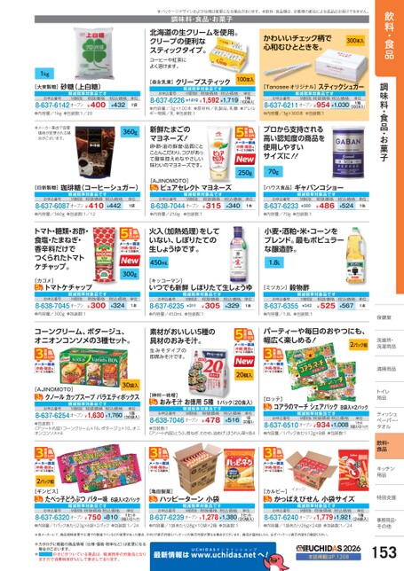 飲料・食品調味料・食品・お菓子保健室保健室洗面所・面所・洗濯用品濯用品清掃用品清掃用品トイレイ用品品ティッシュシュペーパー・パー・タオルタオル飲料・食品キッチンキッチン用品品特別支援別支援事務用品・事務用品・その他その他[AJINOMOTO]ピュアセレクトマヨネーズ軽減税率対象品[ハウス食品]ギャバンコショー軽減税率対象品お申込番号M価税抜8-638-7044オープン税抜価格¥315税込価格¥340単位1本お申込番号8-637-6233M価税抜¥500税抜価格¥486税込価格¥524単位1缶●内容量/360g●包装数:1/12●内容量/250g●包装数:1●内容量/70g●包装数:1トマト・糖類・お酢・食塩・たまねぎ・香辛料だけでつくられたトマトケチャップ。[カゴメ]トマトケチャップ軽減税率対象品お申込番号M価税抜8-638-7045オープン税抜価格¥300沖縄・離島はサービス対象外300g税込価格¥324単位1本火入(加熱処理)をしていない、しぼりたての生しょうゆです。450mL小麦・酒粕・米・コーンをブレンド。最もポピュラーな醸造酢。1.8L[キッコーマン]いつでも新鮮しぼりたて生しょうゆ軽減税率対象品お申込番号8-637-6235M価税抜¥311税抜価格¥305税込価格¥329単位1本[ミツカン]穀物酢お申込番号8-637-6355M価税抜¥542軽減税率対象品税抜価格¥525税込価格¥567単位1本●内容量/300g●包装数:1●内容量/450mL●包装数:1●内容量/1.8L●包装数:1コーンクリーム、ポタージュ、オニオンコンソメの3種セット。素材がおいしい5種の具材のおみそ汁。生みそタイプの即席みそ汁です。沖縄・離島はサービス対象外沖縄・離島はサービス対象外20個入パーティーや毎日のおやつにも、幅広く楽しめる!2パック組沖縄・離島はサービス対象外[AJINOMOTO]30袋入クノールカップスープバラエティボックス軽減税率対象品お申込番号M価税抜税抜価格税込価格8-637-6254オープン¥1,630¥1,760単位1箱(30袋入)●包装数:1〈アソート内容〉コーンクリーム×16、ポタージュ×10、オニオンコンソメ×4[神州一味]おみそ汁お徳用5種1パック(20食入)[ロッテ]軽減税率対象品お申込番号M価税抜8-638-7046オープン税抜価格¥478税込価格¥516単位1袋(20個入)●包装数:1〈アソート内容〉とうふ、長ねぎ、わかめ、油あげ、ほうれん草×各4コアラのマーチシェアパック8袋入×2パック軽減税率対象品お申込番号M価税抜税抜価格税込価格8-637-6510オープン¥934¥1,008単位1セット(8袋入×2パック)●内容量/1パックあたり12g×8袋●包装数:1沖縄・離島はサービス対象外2パック組沖縄・離島はサービス対象外沖縄・離島はサービス対象外[ギンビス]たべっ子どうぶつバター味6袋入×2パックお申込番号軽減税率対象品M価税抜税抜価格税込価格8-637-6320オープン¥750¥810[亀田製菓]ハッピーターン小袋軽減税率対象品[カルビー]イメージかっぱえびせん小袋サイズ軽減税率対象品単位1セット(6袋入×2パック)お申込番号M価税抜税抜価格税込価格単位8-637-6239オープン¥1,278¥1,3801セット(20袋入)お申込番号M価税抜税抜価格税込価格8-637-6240オープン¥1,779¥1,921単位1箱(24袋入)●内容量/1パックあたり23g×6袋×2パック●包装数:1/24●内容量/1袋あたり28g×10袋×2箱●包装数:1●内容量/1袋あたり26g×24袋●包装数:1/24※各メーカーにて、商品規格変更や工場での製造ラインなどの変更があった場合、カタログ表示内容とパッケージの表示内容が異なる場合がございます。商品が届きましたら、必ずパッケージ表示内容をご確認ください。※カタログに掲載の商品情報(仕様・価格・税率など)は変更になる場合がございます。※のオビがついている商品は、軽減税率の対象品となりますので消費税率8%として表示しております。最新情報はUCHIDASww.uchidas.netwへ!2026本誌掲載はP.1208153※パッケージデザインおよび仕様は変更になる場合があります。※飲料・食品類は、お客様の都合による返品はお受けできません。パケンおよはるがります。※飲料・食品類は、お客様の都合による返品はお受けできません。調味料・食品・お菓子北海道の生クリームを使用。クリープの便利なスティックタイプ。コーヒーや紅茶によく溶けます。かわいいチェック柄で心和むひとときを。300本入1kg[大東製糖]砂糖(上白糖)軽減税率対象品お申込番号M価税抜8-637-6142オープン税抜価格¥400●内容量/1kg●包装数:1/20※メーカー事由で容量・価格が変更される場合がございます。税込価格¥432単位1袋360g[日新製糖]珈琲糖(コーヒーシュガー)軽減税率対象品M価税抜税抜価格お申込番号8-637-6087オープン¥410税込価格¥442単位1袋[森永乳業]クリープスティック軽減税率対象品100本入お申込番号M価税抜税抜価格税込価格8-637-6226¥1,612¥1,592¥1,719(100本入)●内容量/3g×100本●原材料/乳製品、乳糖●アレルギー物質/乳●包装数:1単位1箱新鮮たまごのマヨネーズ!卵・酢・油の鮮度・品質にとことんこだわり、コクがあって酸味控えめなやさしい味わいのマヨネーズです。[Tanoseeオリジナル]スティックシュガー軽減税率対象品お申込番号M価税抜税抜価格税込価格8-637-6211オープン¥954¥1,030単位1箱(300本入)●内容量/3g×300本●包装数:1プロから