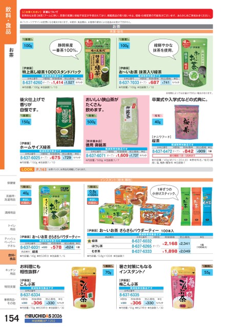 【ご注意ください】茶葉について世界的なお茶(抹茶)ブームに伴い、茶葉の高騰と供給不安定が予想されており、掲載商品の取り扱い中止、価格・仕様変更の可能性がございます。あらかじめご承知おきください。※パッケージデザインは変更になる場合があります。※飲料・食品類は、お客様の都合による返品はお受けできません。お茶茶葉・桜花茶葉100g静岡県産一番茶100%。茶葉100g緑鮮やかな抹茶を使用。[伊藤園]特上蒸し緑茶1000スタンドパック軽減税率対象品お申込番号M価税抜税抜価格税込価格8-637-6260オープン¥1,414¥1,527単位1パック[伊藤園]お〜いお茶抹茶入り緑茶軽減税率対象品お申込番号M価税抜8-637-7033オープン税抜価格¥687税込価格¥741単位1パック●内容量/100g●包装数:1/10●内容量/100g●包装数:1/10後火仕上げで香りが自慢です。茶葉150gおいしい狭山茶がたくさん飲めます。茶葉500g※時期によってはお届けできない場合があります。卒業式や入学式などの式典に。桜花40g[伊藤園]ホームサイズ緑茶軽減税率対象品お申込番号M価税抜8-637-6025オープン税抜価格¥675税込価格¥729単位1パック●内容量/150g●包装数:1/10[新井園本店]徳用御銘茶お申込番号軽減税率対象品税抜価格M価税抜税込価格8-637-6071オープン¥1,609¥1,737●内容量/500g●包装数:1/7[ナニワフード]桜茶お申込番号軽減税率対象品税抜価格M価税抜8-637-6472オープン¥842税込価格¥909単位1袋受付期間11月〜5月末まで●内容量/40g(約15〜20人分)●原材料名/桜花(国産)、塩、梅酢/酸味料●包装数:1単位1パックLOOK粉末40g水出しお湯出しP.1211お茶パック、お茶缶を掲載しております。パッ、お缶載しおりす。インスタント(粉末:顆粒)イン(粉末0.8g×100本入水出しお湯出し1杯ずつの小分けスティック。[伊藤園]お〜いお茶さらさらパウダーティー100本入[伊藤園]お〜いお茶さらさらパウダーティー軽減税率対象品税抜価格¥578お申込番号8-637-6031M価税抜¥600商品種別緑茶税込価格¥624単位1袋商品種別緑茶ほうじ茶むぎ茶軽減税率対象品お申込番号8-637-60328-637-62658-637-6333M価税抜税抜価格税込価格単位オープン¥2,168¥2,341¥1,898¥2,0491箱(100本入)●内容量/40g●約50杯分●包装数:1/6●内容量/0.8g×100本●包装数:1お料理にも相性抜群!顆粒70g暑さ対策にもなるインスタント!顆粒55g[伊藤園]こんぶ茶お申込番号8-637-6334軽減税率対象品[伊藤園]梅こんぶ茶お申込番号8-637-6335軽減税率対象品飲料・食品お茶保健室保健室洗面所・洗面洗濯用品洗濯用清掃用品清掃用品トイレトイ用品用ティッシュティッペーパー・タオルタオル飲料・食品キッチンキッチン用品用特別支援特別支事務用品・事務用品・その他その他M価税抜¥350税抜価格¥306税込価格¥330単位1パック●内容量/70g●約35杯分●包装数:1/301542026本誌掲載はP.1202M価税抜¥350税抜価格¥306税込価格¥330単位1パック●内容量/55g●約27杯分●包装数:1/30