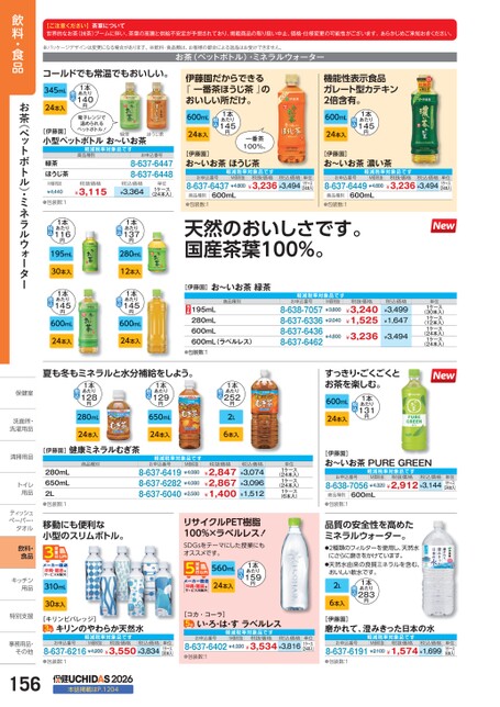 【ご注意ください】茶葉について世界的なお茶(抹茶)ブームに伴い、茶葉の高騰と供給不安定が予想されており、掲載商品の取り扱い中止、価格・仕様変更の可能性がございます。あらかじめご承知おきください。※パッケージデザインは変更になる場合があります。※飲料・食品類は、お客様の都合による返品はお受けできません。お茶(ペットボトル)・ミネラルウォーターコールドでも常温でもおいしい。345mL24本入1本あたり140円電子レンジで温められるペットボトル![伊藤園]小型ペットボトルお〜いお茶緑茶ほうじ茶24本入伊藤園だからできる『一番茶ほうじ茶』のおいしい所だけ。600mL1本あたり145円一番茶100%。[伊藤園]お〜いお茶ほうじ茶機能性表示食品ガレート型カテキン2倍含有。600mL1本あたり145円24本入[伊藤園]お〜いお茶濃い茶軽減税率対象品商品種別お申込番号8-637-64478-637-6448単位1ケース(24本入)税抜価格¥3,115税込価格¥3,3641本あたり137円280mL12本入1本あたり145円600mL24本入緑茶ほうじ茶M価税抜¥4,440●包装数:11本あたり116円195mL30本入1本あたり145円600mL24本入お申込番号軽減税率対象品税抜価格M価税抜税込価格8-637-6437¥4,800¥3,236¥3,494単位1ケース(24本入)お申込番号軽減税率対象品税抜価格M価税抜税込価格8-637-6449¥4,800¥3,236¥3,494単位1ケース(24本入)600mL商品種別●包装数:1600mL商品種別●包装数:1天然のおいしさです。国産茶葉100%。[伊藤園]お〜いお茶緑茶商品種別195mL280mL600mL600mL(ラベルレス)●軽減税率対象品お申込番号8-638-70578-637-63368-637-64368-637-6462M価税抜¥3,800¥2,040¥4,800税抜価格¥3,240¥1,525¥3,236税込価格¥3,499¥1,647¥3,494単位1ケース(30本入)1ケース(12本入)1ケース(24本入)1ケース(24本入)夏も冬もミネラルと水分補給をしよう。1本あたり128円1本あたり129円280mL24本入650mL24本入[伊藤園]健康ミネラルむぎ茶軽減税率対象品お申込番号8-637-64198-637-62828-637-6040M価税抜¥4,080¥4,080¥2,5801本あたり252円2L6本入税抜価格¥2,847¥2,867¥1,400税込価格¥3,074¥3,096¥1,512単位1ケース(24本入)1ケース(24本入)1ケース(6本入)すっきり・ごくごくとお茶を楽しむ。600mL1本あたり131円24本入[伊藤園]お〜いお茶PUREGREENお申込番号軽減税率対象品税抜価格M価税抜税込価格8-638-7056¥4,320¥2,912¥3,144600mL商品種別●包装数:1品質の安全性を高めたミネラルウォーター。●2種類のフィルターを使用し、天然水にさらに磨きをかけています。●天然水由来の良質ミネラルを含む、おいしい軟水です。2L6本入1本あたり283円単位1ケース(24本入)単位1ケース(6本入)商品種別280mL650mL2L●包装数:1移動にも便利な小型のスリムボトル。沖縄・離島はサービス対象外310mL30本入リサイクルPET樹脂100%×ラベルレス!SDGsをテーマにした授業にもオススメです。560mL24本入1本あたり159円沖縄・離島はサービス対象外[キリンビバレッジ]キリンのやわらか天然水お申込番号軽減税率対象品税抜価格M価税抜税込価格8-637-6216¥4,200¥3,550¥3,834単位1ケース(30本入)[コカ・コーラ]い・ろ・は・すラベルレスお申込番号軽減税率対象品税抜価格M価税抜税込価格8-637-6402¥4,320¥3,534¥3,816単位1ケース(24本入)●包装数:1[伊藤園]磨かれて、澄みきった日本の水お申込番号軽減税率対象品税抜価格M価税抜税込価格8-637-6191¥2,100¥1,574¥1,699●包装数:1●包装数:11562026本誌掲載はP.1204飲料・食品お茶(ペットボトル)・ミネラルウォーター保健室保健室洗面所・洗面洗濯用品洗濯用清掃用品清掃用品トイレトイ用品用ティッシュティッペーパー・タオルタオル飲料・食品キッチンキッチン用品用特別支援特別支事務用品・事務用品・その他その他