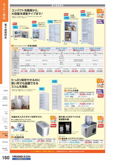 電子調理用具コンパクト冷蔵庫から、大容量冷凍室タイプまで!※軒先渡しです。建物の1階エントランスでの引き渡しとなります。室内への搬入、配置は行いませんのでご注意ください。133L横幅47cmのスリムタイプ。66L狭い所でも設置できるスリムタイプ。45Lプライベートルームにも最適!153L大容量冷凍室で、たくさん入る!170Lセカンド冷蔵庫として最適!沖縄・離島はサービス対象外●使用例●使用例●[アイリスオーヤマ]冷凍冷蔵庫●使用例●お申込番号●8-613-4637IRSD-5A-W●8-613-4638●8-617-2917●8-613-4639●8-613-4640IRSN-7A-WIRSD-13A-WIRSN-HF15A-WIRSD-17A-W472幅)×450(奥)×492(高)mm552幅)×390奥)×800(高)mm470幅)×521奥)×1240(高)mm500幅)×617(奥)×1292高)mm444(幅)×536(奥)×1518高)mm45L18.5kg年間消費電力量120kwh/年約1.8m製氷皿(1個)、露受けトレー(1個)型式容量寸法質量定格電圧定格電源周波数ドア開閉方向コードの長さ付属品M価税抜価格単位●包装数:166L26kg89kWh/年約2.3m-税抜価格¥21,120税込価格¥23,232税抜価格¥52,800税込価格¥58,080税抜価格¥50,400税込価格¥55,440133L33kgAC100V50/60Hz252kwh/年右開き約2.1m-オープン1台153L41kg170L36kg262kWh/年(50Hz)247kWh/年(60Hz)約1.9m製氷皿260kWh/年約1.9m-税抜価格¥58,400税込価格¥64,240税抜価格¥48,800税込価格¥53,680たっぷり保存できるのに狭い所でも設置できるスリム冷凍庫。※軒先渡しです。建物の1階エントランスでの引き渡しとなります。室内への搬入、配置は行いませんのでご注意ください。80L120L[アイリスオーヤマ]スリム冷凍庫お申込番号M価税抜税抜価格税込価格8-621-7046オープン¥56,800¥62,480商品種別80L型式/IUSN-8A-W沖縄・離島はサービス対象外単位1台●寸法/356(幅)×555(奥)×996(高)mm●質量/29kg●電源/AC100V(50/60Hz共用)●年間消費電力量/282kwh/年●コードの長さ/約1.9m●お客様取付商品●包装数:18-621-7047オープン¥75,800¥83,3801台商品種別120L型式/IUSN-S12A-W使用例●寸法/356(幅)×555(奥)×1365(高)mm●質量/36kg●電源/AC100V(50/60Hz共用)●年間消費電力量/362kwh/年●コードの長さ/約1.9m●お客様取付商品●包装数:1水道水を入れてボタンを押すだけ。●大・小2種類の氷を作ることができます。●本体底面の排水栓から簡単に排水ができます。透き通った氷がつくれる高速製氷機。沖縄・離島はサービス対象外沖縄・離島はサービス対象外使用例2タイプの氷が作れます。[イー・エム・エー]高速製氷機商品種別型式/SR-HIM01-SVお申込番号M価税抜税抜価格8-613-4645オープン¥27,200¥29,920税込価格単位1台●寸法/245幅)×365(奥)×325(高)mm●質量/7.8kg●材質/ABS樹脂、ポリプロピレン●定格電圧/AC100V●定格電源周波数/50/60Hz●消費電力/120W●製氷時間/約6〜13分、9個の氷を作成(目安)●氷保管量/約800g●付属品/アイススコップ、取扱説明書(保証書)●包装数:1※季節商品のため、欠品や早期終了となる場合がございます。※製氷形状は、穴あきキャップ型です。[サンコー]製氷機クリアアイスゴロン商品種別型式/SR-HIM01-SVお申込番号M価税抜税抜価格8-613-4646オープン¥28,000¥30,800税込価格単位1台●寸法/225幅)×300奥)×285(高)mm●質量/6.4kg●材質/ステンレス、ポリプロピレン●電源/AC100V50/60Hz●消費電力/100W●製氷時間/約7〜10分、9個の氷を作成(目安)●氷保管容量/約600g目安)●包装数:1※製氷形状は、穴あきキャップ型です。※メーカー直送品です。返品はご容赦ください。上記商品は受注日から8・10営業日以内のお届けになります。キッチン用品電子調理用具保健室保健室洗面所・洗面洗濯用品洗濯用清掃用品清掃用品トイレトイ用品用ティッシュティッペーパー・タオルタオル飲料・飲料・食品食キッチン用品特別支援特別支事務用品・事務用品・その他その他1602026本誌掲載はP.469