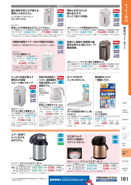 キッチン用品電気ポット・ポット保健室保健室洗面所・面所・洗濯用品濯用品清掃用品清掃用品トイレイ用品品ティッシュシュペーパー・パー・タオルタオル飲料・飲料・食品品キッチン用品特別支援別支援事務用品・事務用品・その他その他[タイガー]ステンレスエアーポット商品種別●3L4L寸法/178(幅)×245奥)×313高)mm、質量/1.6kg、型式/MAA-C301XC寸法/178(幅)×245奥)×372高)mm、質量/1.8kg、型式/MAA-C401XCお申込番号8-637-75408-637-7541M価税抜税抜価格税込価格¥18,000¥8,800¥9,680¥18,500¥9,800¥10,780●保温効力/10時間、3L:74℃以上、4L:78℃以上●包装数:1/4※カタログに掲載の商品情報(仕様・価格・税率など)は変更になる場合がございます。最新情報は[象印マホービン]ステンレスエアーポット商品種別単位1台●2.2L3L寸法/175幅)×230奥)285高)mm、質量/1.5kg、型式/SR-CC22-NZ寸法/175幅)×230奥)325高)mm、質量/1.7kg、型式/SR-CC30-NZM価税抜税抜価格お申込番号8-637-6160オープン¥8,8008-637-6161税込価格単位¥9,680¥9,800¥10,7801台●保温効力/10時間、2.2L70℃以上、3L74℃以上●包装数:1/6UCHIDASww.uchidas.netwへ!2026本誌掲載はP.1209161置き場所を気にせず使える蒸気レスまほうびん。たっぷり沸かしてまほうびんで保温「節電VE保温」。電気ポット・ポット電気とまほうびんの組み合わせで、かしこく省エネ保温。容量3.0L沸き上がり時間約31分コード長約1.0m容量3.0L沸き上がり時間約25分コード長約1.0m[タイガー]蒸気レスVE電気まほうびん「とく子さん」[象印マホービン]VE電気まほうびん商品種別型式/PIP-G300WEお申込番号M価税抜税抜価格8-638-7731オープン¥17,856¥19,641税込価格単位1台商品種別型式/CV-TF30-WAお申込番号M価税抜税抜価格8-638-7726オープン¥16,606¥18,266税込価格単位1台●寸法/219幅)×283(奥)×319(高)mm●質量/約2.9kg●材質/本体:ポリプロピレン、内容器:ステンレス(フッ素加工)●消費電力/700W(湯沸かし時)●包装数:1/2●寸法/210(幅)×285(奥)×300(高)mm●質量/2.7kg●消費電力/905W(湯沸かし時)●包装数:16時間の節電タイマー付きで電気代を節約。従来品と比べ蒸気量を約30%カットした「省スチーム設計」。[タイガー]マイコン電動ポット商品種別型式/PDR-G301Wお申込番号8-637-6154湯沸かし時間や消費電力量、蒸気を抑える「沸とうセーブ」機能搭載。容量3.0L沸き上がり時間約33分コード長約1.0m容量4.0L沸き上がり時間約40分コード長約1.0m単位税抜価格税込価格¥9,480¥10,4281台M価税抜オープン●寸法/212(幅)×280(奥)×294(高)mm●質量/約2.2kg●消費電力/700W(湯沸かし時)●保温温度/98℃・90℃・70℃●包装数:1/2たっぷりお湯が使えて便利な大容量スピード沸とうタイプ。充実の安全設計にくわえ、温度調節も可能な蒸気レスの温調モデル。容量0.8L[象印マホービン]マイコン沸とう電動ポット商品種別型式/CD-WZ40-TMお申込番号M価税抜税抜価格税込価格8-638-7727オープン¥14,800¥16,280単位1台●寸法/210(幅)×285(奥)×340(高)mm●質量/2.5kg●消費電力/700W(湯沸かし時)●包装数:1ポットの汚れをスッキリきれいに。発泡剤を入れて一晩置くだけ。容量5.0L沸き上がり時間約35分コード長約1.0m[象印マホービン]マイコン沸とう電動ポット商品種別型式/CD-SE50-WGお申込番号8-638-7728M価税抜税抜価格税込価格オープン¥17,800¥19,580単位1台●寸法/230(幅)×315(奥)×340(高)mm●質量/3.4kg●消費電力/985W(湯沸かし時)●包装数:1エアー給湯でらくに注げるまほうびん。蒸気レス電気ケトル「温度調節機能タイプ」。[タイガー]蒸気レス電気ケトル0.8L商品種別型式/PTV-A080WGお申込番号8-638-7730M価税抜税抜価格税込価格オープン¥12,800¥14,080単位1台●寸法/約178幅)×213(奥)×195(高)mm(本体+電源プレート)●質量/1.1kg(本体+電源プレート)●材質/本体:ポリプロピレン、内容器:ポリプロピレン(側面)、ステンレス(底面)●消費電力/1300W(湯沸かし時)●色/グレイッシュホワイト●包装数:1/6[象印マホービン]ポット内容器洗浄用クエン酸ピカポット商品種別型式/CD-KB03X-Jお申込番号8-637-7542[小林製薬]ポット洗浄中お申込番号8-637-7102M価税抜¥480税抜価格¥480税込価格¥528単位1箱(4包入)●包装数:1/60税抜価格¥420M価税抜オープン●包装数:1/48ポット容量3.0L容量4.0L広口約7cmでお手入れ簡単なステンレスポット。税込価格¥462単位1箱(3錠入)容量2.2L容量3.0L●●