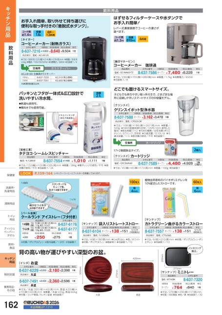 飲料用品はずせるフィルターケースや水タンクでお手入れ簡単!レバー式濃度調節でコーヒーの濃さが選べます。コード長約1.3m容量810mL6杯用[象印マホービン]コーヒーメーカー珈琲通商品種別型式/EC-MA60-TZお申込番号M価税抜8-637-7586オープン●寸法/230(幅)×155(奥)×280(高)mm●質量/1.7kg●包装数:1/8どこでも置けるスマートサイズ。子どもでも持ちやすい取っ手付きで、さまざまな場所に収納しやすいスマートサイズの中容量モデル。税抜価格¥7,480税込価格¥8,228●消費電力/650W単位1台[クリンスイ]クリンスイポット型浄水器お申込番号8-637-7588オープン¥3,162¥3,478M価税抜税抜価格税込価格単位1個商品種別型式/CP503-GR●寸法/108(幅)×186(奥)×267(高)mm●質量/500g●ろ材の取替時期の目安/3カ月(1日2L使用した場合)●除去物質17+2●ろ材の種類/中空糸膜(ポリエチレン)、セラミック、活性炭●ろ過流量/0.10L/分●ろ過水容量/1.1L●食洗機の使用/不可●包装数:1交換用カートリッジ17+2物質除去タイプ。[クリンスイ]カートリッジ商品種別型式/CPC5WNWお申込番号M価税抜8-637-7589オープン2個入税抜価格¥4,480税込価格¥4,928単位1箱(2個入)●寸法/45(幅)×45(奥)×173(高)mm●質量/100g●包装数:1植物由来原料のバイオポリエチレンを10%配合したストローです。100本入径4mm60本入径6mm[サンナップ]袋入りストレートストローお申込番号M価税抜税抜価格税込価格単位8-637-6104オープン¥138¥1511パック(100本入)商品種別型式/S-100WN[サンナップ]カトラグリーン曲がるカラーストローお申込番号M価税抜税抜価格税込価格単位8-637-7557オープン¥138¥1511パック(60本入)商品種別型式/CTG-S60●寸法/4(径)×180(長)mm●材質/ポリプロピレン●個装有り●包装数:1/10●じゃばらなし●色/ホワイト●寸法/6径)×210(長)mmエチレン●包装数:1/10●材質/ポリプロピレン・ポリ270mm[サンナップ]ミニトレー商品種別型式/MT-NSBKお申込番号8-637-7320税抜価格¥764M価税抜オープン●寸法/270(幅)×200(奥)×17(高)mm●材質/ABS樹脂●色/黒●包装数:1/30税込価格¥840単位1枚ノンスリップ加工。200mm420mm●寸法/丸盆:300(径)×40(高)mm、長盆:420(幅)×270(奥)×40(高)mm●質量/丸盆:430g、長盆:666g●材質/ユリア樹脂、ウレタン塗装●包装数:1丸盆長盆270mm300mm単位1枚税抜価格税込価格¥2,180¥2,398[イシダ]お盆お申込番号M価税抜8-637-6229¥2,200商品種別丸盆8-637-7491¥2,400¥2,360¥2,5961枚商品種別長盆背の高い物が運びやすい深型のお盆。1622026本誌掲載はP.1210お手入れ簡単、取り外せて持ち運びに便利な取っ手付きの「着脱式水タンク」。コード長約1.4m容量.6L14杯〜12杯用[タイガー]コーヒーメーカー(耐熱ガラス)お申込番号8-637-7216¥10,800¥8,640¥9,504M価税抜税抜価格税込価格単位1台商品種別型式/ACJ-B120●寸法/本体(約):225(幅)×214(奥)×378高)mm●質量/本体:約2.6kg●電源/100V(50/60Hz)●消費電力/680W●包装数:1/4交換用ガラスサーバーACJ-B120交換用ガラスサーバーフタなしフタ付※納期8営業日以内8-637-72208-637-7251¥2,310税込価格)¥2,420税込価格)パッキンとフタが一体式&広口設計で洗いやすい冷水筒。容量2.1L●熱湯も使用可。●横向きでも使用可能。[岩崎工業]タテヨコ・シームレスピッチャー商品種別型式/K-1286Wお申込番号M価税抜8-637-7554¥1,495税抜価格¥1,010税込価格¥1,111単位1個●質量/386g●電子レンジの使用/不可●食●寸法/152(幅)×103(奥)×305高)mm洗機の使用/不可●包装数:1/24P.1207・1212・1レギュラーコーヒーとフィルターを掲載しております。レギュラーコーヒーとフィルター掲載しております。14個取スタンダードなキューブ型、氷が14個できます。つぶ氷細かなつぶ氷が48個できます。[パール金属]クールランドアイストレー(フタ付き)商品種別寸法/90幅)×265奥)×45(高)mm、質量/110g、型式/H-523714個取つぶ氷寸法/90幅)×265奥)×35(高)mm、質量/130g、型式/H-5238お申込番号8-637-61768-637-6177M価税抜¥300税抜価格¥250税込価格¥275単位1個●材質/ポリプロピレン●耐冷温度/ー20℃●包装数:1キッチン用品飲料用品保健室保健室洗面所・洗面洗濯用品洗濯用清掃用品清掃用品トイレトイ用品用ティッシュティッペーパー・タオルタオル飲料・飲料・食品食キッチン用品特別支援特別支事務用品・事務用品・その他その他