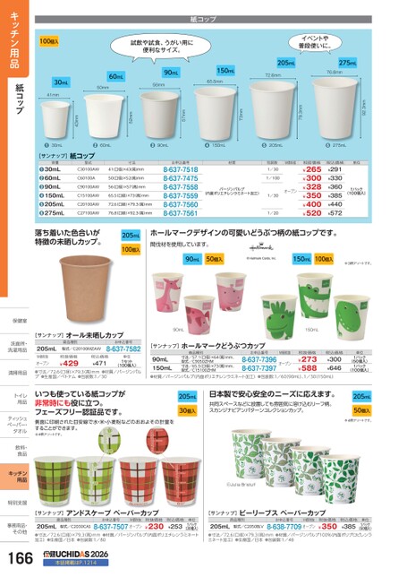 イベントや普段使いに。205mL72.6mm275mL76.8mm92.3mm79.3mm73mm57mm90mL56mm150mL65.5mm52mm43mm30mL41mm60mL50mm紙コップ100個入試飲や試食、うがい用に便利なサイズ。型式寸法C30100AW41(口径)×43(高)mmC60100A50(口径)×52(高)mmC90100AW56口径)×57(高)mmC15100AW65.5口径)×73(高)mmC20100AW72.6口径)×79.3(高)mmC27100AW76.8口径)×92.3(高)mm材質バージンパルプ(内面ポリエチレンラミネート加工)お申込番号8-637-75188-637-74758-637-75588-637-75598-637-75608-637-7561M価税抜オープン包装数1/301/1001/301/20税抜価格¥265¥300¥328¥350¥400¥520税込価格¥291¥330¥360¥385¥440¥572単位1パック(100個入)容量30mL60mL90mL150mL205mL275mL●●●●●●[サンナップ]紙コップ●30mL●60mL●90mL●150mL●205mL●275mL落ち着いた色合いが特徴の未晒しカップ。205mL100個入ホールマークデザインの可愛いどうぶつ柄の紙コップです。間伐材を使用しています。90mL50個入150mL100個入※3柄アソートです。[サンナップ]オール未晒しカップ205mL商品種別型式/C20100MZAWお申込番号8-637-7582税抜価格¥429M価税抜オープン●寸法/72.6口径)×79.3(高)mm●材質/バージンパルプ●生産国/ベトナム●包装数:1/30税込価格¥471(100個入)1セット単位90mL150mL[サンナップ]ホールマークどうぶつカップ商品種別お申込番号M価税抜税抜価格90mL150mL●材質/バージンパルプ(内面ポリエチレンラミネート加工)●包装数:1/6090mL)、1/30150mL)寸法/57.1(口径)×64高)mm、型式/C9050ZHM寸法/65.5(口径)×73高)mm、型式/C15100ZHM8-637-7396オープン8-637-7397¥273¥588税込価格¥300¥646単位1パック(50個入)1パック(100個入)いつも使っている紙コップが非常時にも役に立つ。フェーズフリー認証品です。側面に印刷された目安線で水・米・小麦粉などのおおよその計量をすることができます。※4柄アソートです。205mL30個入日本製で安心安全のニーズに応えます。共同スペースなどに設置しても雰囲気に溶け込むリーフ柄。スカンジナビアンパターンコレクションカップ。205mL50個入※4柄アソートです。ⓒJuliaBristulf[サンナップ]アンドスケープペーパーカップ商品種別型式/C2030CAS205mL●寸法/72.6(口径)×79.3(高)mm加工)●生産国/日本●包装数:1/80お申込番号M価税抜8-637-7507オープン税抜価格¥230税込価格¥253(30個入)●材質/バージンパルプ(内面ポリエチレンラミネート単位1パック[サンナップ]ビーリーブスペーパーカップ商品種別型式/C2050BLV205mL●寸法/72.6口径)×79.3(高)mmミネート加工)●生産国/日本●包装数:1/48お申込番号M価税抜8-638-7709オープン税抜価格¥350税込価格¥385(50個入)●材質/バージンパルプ100%(内面ポリプロピレンラ単位1パックキッチン用品紙コップ保健室保健室洗面所・洗面洗濯用品洗濯用清掃用品清掃用品トイレトイ用品用ティッシュティッペーパー・タオルタオル飲料・飲料・食品食キッチン用品特別支援特別支事務用品・事務用品・その他その他1662026本誌掲載はP.1214