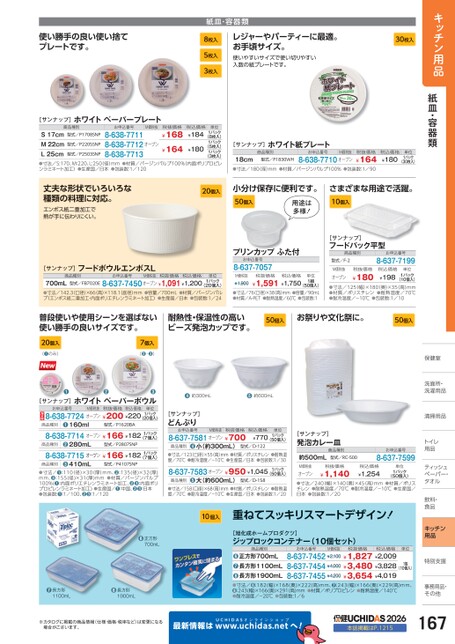 キッチン用品紙皿・容器類保健室保健室洗面所・面所・洗濯用品濯用品清掃用品清掃用品トイレイ用品品ティッシュシュペーパー・パー・タオルタオル飲料・飲料・食品品キッチン用品特別支援別支援使い勝手の良い使い捨てプレートです。紙皿・容器類レジャーやパーティーに最適。お手頃サイズ。使いやすいサイズで使い切りやすい入数の紙プレートです。8枚入5枚入3枚入30枚入[サンナップ]ホワイトペーパープレート商品種別お申込番号M価税抜税抜価格型式/P2205SNP型式/P1708SNPS17cmM22cmL25cm(3枚入)●寸法/S:170、M:220、L:250(径)mm●材質/バージンパルプ100%(内面ポリプロピレンラミネート加工)●生産国/日本●包装数:1/1208-638-77118-638-77128-638-7713¥164型式/P2503SNP¥168¥180(5枚入)(8枚入)オープン1パック1パック1パック単位税込価格¥184[サンナップ]ホワイト紙プレート商品種別18cm●寸法/180(径)mm型式/P1830WHお申込番号M価税抜8-638-7710オープン税抜価格¥164税込価格¥180単位1パック(30枚入)●材質/バージンパルプ100%●包装数:1/90丈夫な形状でいろいろな種類の料理に対応。エンボス紙二重加工で熱が手に伝わりにくい。20個入小分け保存に便利です。50個入用途は多様!さまざまな用途で活躍。10個入[サンナップ]フードボウルエンボスL商品種別お申込番号M価税抜税抜価格税込価格単位型式/FB7020E8-637-7450オープン¥1,091¥1,200700mL(20個入)●寸法/142.3口径)×66高)×118.1(底径)mm●容量/700mL●材質/バージンパルプ(エンボス紙二重加工・内面ポリエチレンラミネート加工)●生産国/日本●包装数:1/241パックプリンカップふた付お申込番号8-637-7057M価税抜¥1,900税抜価格税込価格¥1,591¥1,750(50個入)●容量/90mL●寸法/76口径)×38(高)mm●材質/A-PET●耐熱温度/60℃●包装数:1単位1組[サンナップ]フードパック平型商品種別型式/F-2M価税抜オープン税抜価格¥180お申込番号8-637-7199税込価格¥198単位1パック(10個入)●寸法/125(幅)×180(奥)×35(高)mm●材質/ポリスチレン●耐熱温度/70℃●耐冷温度/-10℃●包装数:1/10普段使いや使用シーンを選ばない使い勝手の良いサイズです。20個入7個入(❶のみ)(❷・❸)耐熱性・保温性の高いビーズ発泡カップです。50個入お祭りや文化祭に。50個入お申込番号M価税抜税抜価格税込価格8-637-7452¥2,100¥1,827¥2,0098-637-7454¥4,000¥3,480¥3,8288-637-7455¥4,200¥3,654¥4,019単位1箱(10個入)商品種別正方形700mL長方形1100mL長方形1900mL●●●[旭化成ホームプロダクツ]ジップロックコンテナー(10個セット)●約300mL●約600mL[サンナップ]どんぶりM価税抜お申込番号8-637-7581オープン¥700税込価格¥770小(約300mL)型式/D-122税抜価格商品種別●単位1パック(50個入)●寸法/123(口径)×55(高)mm●材質/ポリスチレン●耐熱温度/70℃●耐冷温度/-10℃●生産国/日本●包装数:1/308-637-7583オープン¥950¥1,045大(約600mL)型式/D-158商品種別●1パック(50個入)●寸法/158(口径)×68(高)mm●材質/ポリスチレン●耐熱温度/70℃●耐冷温度/-10℃●生産国/日本●包装数:1/20[サンナップ]発泡カレー皿商品種別約500mL型式/RC-500お申込番号8-637-7599税抜価格¥1,140M価税抜オープン●寸法/240(幅)×140(奥)×45(高)mm●材質/ポリスチレン●耐熱温度/70℃●耐冷温度/-10℃●生産国/日本●包装数:1/20税込価格¥1,254(50個入)1パック単位10個入重ねてスッキリスマートデザイン!●●ホワイトペーパーボウル8-638-7724オープン¥200¥220M価税抜税抜価格税込価格単位1パック(20個入)商品種別❶160ml型式/P1620BA8-638-7714オープン¥166¥1821パック(7個入)商品種別❷280mL型式/P2807SNP8-638-7715プン¥166¥1821パック(7個入)商品種別❸410mL型式/P4107SNP00mL正方形7●●寸法/❶:110(径)×30(厚)mm、❷:135(径)×32(厚)mm、❸:155(径)×31(厚)mm100%(❶:内面ポリエチレンラミネート加工、❷❸:内面ポリプロピレンラミネート加工)●生産国/❶:中国、❷❸:日本●包装数:❶:1/100、❷❸:1/120●材質/バージンパルプ●プ[サンナッ]お申込番号●長方形1100mL●長方形1900mL●寸法/●:182(幅)×168(奥)×222(高)mm、●❼:243(幅)×166(奥)×229(高)mm、❽:243(幅)×166(奥)×291(高)mm●●耐冷温度/-20℃●包装数:1/6●材質/ポリプロピレン●耐熱温度/140°C事務用品・事務用品・その他その他※カタログに掲載の商品情報(仕様・価格・税率など)は変更になる場合がございます。最新情報はUCHIDASww.uchidas.netwへ!本誌掲載はP.1215167