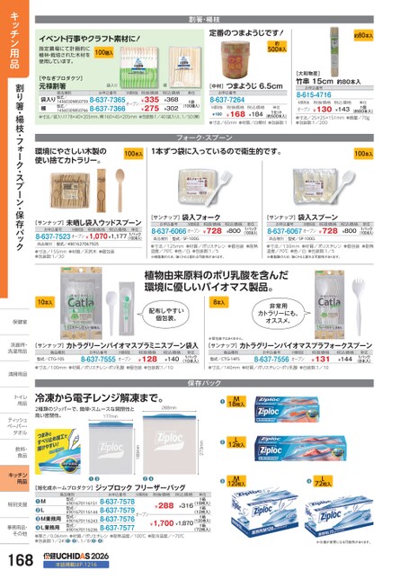 イベント行事やクラフト素材に!指定農場にて計画的に植林・栽培された木材を使用しています。100膳入割箸・楊枝定番のつまようじです!約500本入約80本入[やなぎプロダクツ]元禄割箸商品種別袋入りお申込番号145603098507598-637-7365オープン¥335¥275145603098507668-637-7366袋入り型式/裸●寸法/袋入り:178×40×205mm、裸:160×45×205mm型式/M価税抜税抜価格裸税込価格¥368¥302単位1袋(100膳入)●包装数:1/40(袋入り)、1/50(裸)[中村]つまようじ6.5cmお申込番号8-637-7264M価税抜¥190税抜価格¥168税込価格¥184単位1セット(約500本入)●材質/白樺材●包装数:1●寸法/65mm[大和物産]竹串15cm約80本入お申込番号8-615-4716税込価格¥143税抜価格¥130M価税抜オープン●寸法/25×25×151mm●包装数:1/200単位1個(約80本入)●質量/70g環境にやさしい木製の使い捨てカトラリー。100本入1本ずつ袋に入っているので衛生的です。100本入フォーク・スプーン[サンナップ]お申込番号未晒し袋入ウッドスプーンM価税抜税抜価格税込価格単位8-637-7523オープン¥1,070¥1,1771パック(100本入)商品種別型式/4901627067925●寸法/155mm●包装数:1/30●材質/天然木●個包装[サンナップ]袋入フォークお申込番号M価税抜8-637-6066オープン税抜価格¥728税込価格¥800単位1パック(100本入)商品種別型式/SF-100G●寸法/125mm●材質/ポリスチレン温度/70℃●色/白●包装数:1/5※樹脂製のため、強くかむと割れる可能性があります。[サンナップ]袋入スプーンお申込番号M価税抜8-637-6067オープン商品種別型式/SP-100G税抜価格¥728税込価格¥800単位1パック(100本入)●個包装●耐熱●寸法/130mm温度/70℃●色/白●包装数:1/5※樹脂製のため、強くかむと割れる可能性があります。●材質/ポリスチレン●個包装●耐熱植物由来原料のポリ乳酸を含んだ環境に優しいバイオマス製品。10本入8本入配布しやすい個包装。非常用カトラリーにも、オススメ。[サンナップ]カトラグリーンバイオマスプラミニスプーン袋入[サンナップ]カトラグリーンバイオマスプラフォークスプーン商品種別型式/CTG-10Sお申込番号8-637-7555M価税抜オープン税抜価格¥128税込価格¥140単位1パック(10本入)商品種別型式/CTG-14FSお申込番号8-637-7556M価税抜オープン税抜価格¥131税込価格¥144単位1パック(8本入)※個包装ではありません。●寸法/100mm●材質/ポリスチレン・ポリ乳酸●個包装●包装数:1/10●寸法/140mm●材質/ポリスチレン・ポリ乳酸●包装数:1/10●M120枚入●L72枚入保存パック●M18枚入●L12枚入273mmM価税抜税抜価格税込価格¥288¥316オープン¥1,700¥1,870単位1箱1箱1箱1箱(18枚入)(12枚入)(120枚入)(72枚入)お申込番号8-637-75788-637-75798-637-75768-637-7577商品種別型式/4901670116151型式/4901670116144型式/4901670116243型式/4901670116236MLM業務用L業務用●●●●[旭化成ホームプロダクツ]ジップロックフリーザーバッグ189mm●●●●冷凍から電子レンジ解凍まで。2種類のジッパーで、簡単・スムースな開閉性と高い密閉性。177mm268mm●厚さ/0.06mm●材質/ポリエチレン●耐熱温度/100℃●耐冷温度/-70℃●包装数:1/24❶・❷)、1/8(❸・❹)※仕様が変更になる可能性があります。キッチン用品割り・楊枝・フォーク・スプーン・保存パック保健室保健室洗面所・洗面洗濯用品洗濯用清掃用品清掃用品トイレトイ用品用ティッシュティッペーパー・タオルタオル飲料・飲料・食品食キッチン用品特別支援特別支事務用品・事務用品・その他その他1682026本誌掲載はP.1216