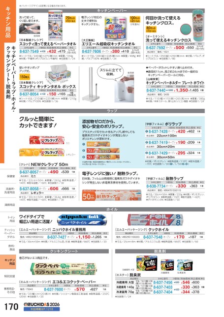 [オーミケンシ]洗って使えるキッチンクロスお申込番号M価税抜8-637-7592オープン税抜価格¥500税込価格¥550単位1パック(1ロール入)商品種別型式/1021●シート寸法/250(縦)×250横)mmリプロピレン●包装数:1/80●材質/パルプ、ポ●ペーパーがカットしやすい滑り止め付き。●直径約11cm、高さ約24cmまでの一般的なキッチンペーパーロールに対応。[山崎実業]キッチンペーパーホルダープレートホワイトお申込番号M価税抜税抜価格税込価格8-637-7440¥1,600¥1,350¥1,485単位1個商品種別型式/2435●寸法/110(幅)×110(奥)×265(高)mm●質量/380g●材質/本体:スチール、滑り止め:シリコン樹脂●包装数:1/24[宇部フィルム]ポリラップお申込番号M価税抜税抜価格税込価格8-637-7428オープン¥420¥46222cm×100m8-637-7419オープン¥190¥2098-637-7429オープン¥295¥32430cm×20m30cm×50m●商品種別●商品種別●商品種別単位1本1本1本[日本製紙クレシア]スコッティ洗って使えるペーパータオルお申込番号8-637-7549M価税抜税抜価格税込価格¥475¥458●質量/334g¥432単位1パック(1ロール入)●シート寸法/240(縦)×275(横)mm●材質/不織布(ポリプロピレン不織布)●包装数:1/24[大王製紙]エリエール超吸収キッチンタオルM価税抜お申込番号8-637-7606オープン(2ロール入)●シート寸法/200(縦)×228(横)mm●質量/408g●材質/パルプ100%●包装数:1/241パック税抜価格税込価格¥418¥380単位スリムに立てて収納。使用例65mm使いやすいポップアップ式。150枚入mm03118mm[日本製紙クレシア]スコッティキッチンタオルボックス2お申込番号8-637-8054M価税抜税抜価格税込価格¥165¥158¥150単位1箱(150枚入)●シート寸法/210(縦)×220(横)mm●質量/210g●材質/パルプ100%●包装数:1/36クルッと簡単にカットできます!ラップ添加物ゼロだから、安心・安全のポリラップ。プラスチック刃でカット性もアップし燃やしても塩素系ガスやダイオキシンが発生しないポリエチレンが原料です。●●●ミニレギュラー※パッケージデザインは変更になる場合があります。洗って絞って、くり返し使えます。使用例キッチンペーパー70カット×1ロール入電子レンジ対応の丈夫で便利なキッチンタオル。100カット×2ロール入(2枚重ね)何回か洗って使えるキッチンクロス。80カット×1ロール入[クレハ]NEWクレラップ50mお申込番号M価税抜8-637-8057オープン税抜価格¥490税込価格¥539単位1本商品種別ミニ●寸法/22cm×50m140℃●耐冷温度/-60℃●包装数:1/30●質量/265g●耐熱温度/8-637-8058オープン¥606商品種別レギュラー●寸法/30cm×50m140℃●耐冷温度/-60℃●包装数:1/30●質量/364g●耐熱温度/¥6661本※油性の強い食品を直接包んで電子レンジに入れないでください。※火気に近づけないでください。●材質/ポリエチレン●耐熱温度/110℃●耐冷温度/-70℃●包装数:1/30●)、1/50(●、●❸)電子レンジに強い!耐熱ラップ。日本製。フィルムは燃焼時に塩素系ガスやダイオキシンが発生しない非塩素系素材を使用しています。[宇部フィルム]耐熱ラップお申込番号M価税抜8-638-7734オープン税抜価格¥330税込価格¥363単位1本商品種別型式/4904701550115●寸法/30cm×50m●質量/235g●材質/ポリエチレン、ポリプロピレン●耐熱温度/150℃●耐冷温度/ー60℃●ダイオキシン0%●包装数:1/50ホイルワイドタイプで幅広い用途に活躍![エムエーパッケージング]ニッパクホイル業務用商品種別型式/4902109301032お申込番号M価税抜8-637-7427オープン税抜価格税込価格¥1,150¥1,265単位1本[エムエーパッケージング]商品種別型式/4902951100203クックホイルお申込番号M価税抜8-637-7548オープン税抜価格¥170税込価格¥187単位1本●寸法/30cm×50m●材質/アルミニウム箔、刃:紙●耐熱温度/660℃●包装数:1/20●寸法/25cm×8m●材質/アルミニウム箔●耐熱温度/660℃●包装数:1/60クッキングシート巻芯がないエコ商品です。冷蔵庫用大型[エムエーパッケージング]エコ&エコクック・ペーパー商品種別型式/73043お申込番号M価税抜8-637-7600オープン税抜価格¥570●寸法/33(幅)cm×20(長)m●材質/シリコーン樹脂加工耐油紙(20分)●包装数:1/20単位1本税込価格¥627●耐熱温度/250℃[エステー]脱臭炭商品種別冷蔵庫用大型冷蔵庫用140g冷凍室用70g●包装数:1/24寸法/161(幅)×38(奥)×116高)mm寸法/121(幅)×38(奥)×100高)mm寸法/120(幅)×30(奥)×83(高)mm脱臭剤冷蔵庫用冷凍室用お申込番号8-637-74568-637-74038-637-7404M価税抜税抜価格税込価格単位¥620¥546¥330¥344¥600¥363¥378¥4201個キッチン用品キッチンペーパー・ラップ・ホイル・ッキングシート・脱臭剤ク保健室保健室洗面所・洗面洗濯用品洗濯用清掃用品清掃用品トイレトイ用品用ティッシュティッペーパー・タオルタオル飲料・飲料・食品食キッチン用品特別支援特別支事務用品・事務用品・その他その他1702026本誌掲載はP.1218
