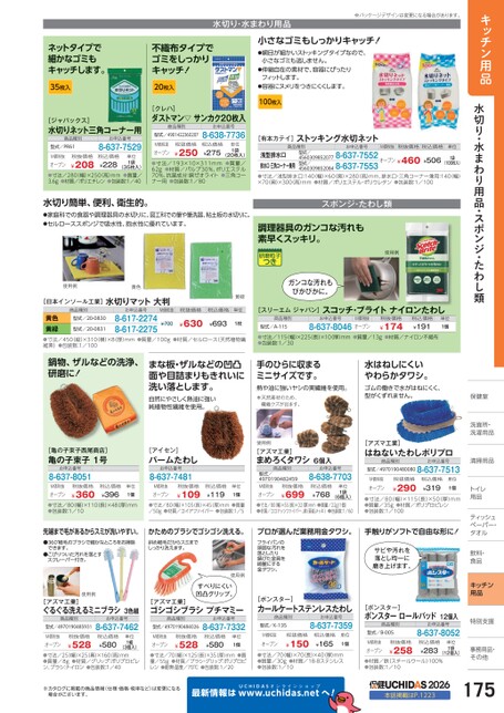 キッチン用品水切り・水まわり用品・スポンジ・たわし類保健室保健室洗面所・面所・洗濯用品濯用品清掃用品清掃用品トイレイ用品品ティッシュシュペーパー・パー・タオルタオル飲料・飲料・食品品キッチン用品特別支援別支援事務用品・事務用品・その他その他水切り・水まわり用品※パッケージデザインは変更になる場合があります。ネットタイプで細かなゴミもキャッチします。35枚入不織布タイプでゴミをしっかりキャッチ!20枚入小さなゴミもしっかりキャッチ!●網目が細かいストッキングタイプなので、小さなゴミも逃しません。●伸縮自在の素材で、容器にぴったりフィットします。●容器にヌメリをつきにくくします。[ジャパックス]水切りネット三角コーナー用商品種別型式/PR61お申込番号8-637-7529税抜価格¥208M価税抜オープン(35枚入)●寸法/280(幅)×250(高)mm●質量/3.6g●材質/ポリエチレン●包装数:1/40税込価格¥228単位1袋[クレハ]ダストマン▽サンカク20枚入商品種別型式/4901422360207お申込番号8-638-7736単位1袋税抜価格¥250税込価格M価税抜¥275オープン(20枚入)●寸法/193×10×311mm●質量/62g●材質/パルプ30%、ポリエステル70%、抗菌成分:銅ゼオライト●三角コーナー用●包装数:1/80100枚入[有本カテイ]ストッキング水切ネット商品種別お申込番号M価税抜税抜価格税込価格単位型式/45603098520778-637-7552オープン¥460¥50645603098520848-637-7553浅型排水口排水口・三角コーナー兼用●寸法/浅型排水口:140(幅)×60(奥)×280高)mm、排水口・三角コーナー兼用:140(幅)×70奥)×300高)mm●材質/ポリエステル・ポリウレタン●包装数:1/100(100枚入)型式/1袋水切り簡単、便利、衛生的。●家庭科での食器や調理器具の水切りに、図工科での筆や筆洗器、粘土板の水切りに。●セルローススポンジで吸水性、抱水性に優れています。使用例黄色[日本インソール工業]水切りマット大判商品種別お申込番号M価税抜黄緑税抜価格税込価格単位型式/20-0830黄色黄緑●寸法/450(縦)×310(横)×8(厚)mm維素)●包装数:1/100型式/20-08318-617-22748-617-2275¥700¥630¥6931枚●質量/100g●材質/セルロース(天然植物繊スポンジ・たわし類調理器具のガンコな汚れも素早くスッキリ。使用例ガンコな汚れもぴかぴかに。[スリーエムジャパン]スコッチ・ブライトナイロンたわし商品種別型式/A-11Sお申込番号M価税抜8-637-8046オープン税抜価格¥174税込価格¥191単位1個●寸法/115(幅)×225(長)×10(厚)mm●包装数:1/30●質量/13g●材質/ナイロン不織布鍋物、ザルなどの洗浄、研磨に!まな板・ザルなどの凹凸面や目詰まりもきれいに洗い落とします。自然にやさしく熱油に強い純植物性繊維を使用。手のひらに収まるミニサイズです。熱や油に強いヤシの実繊維を使用。※天然素材のため、繊維クズが出ます。水はねしにくいやわらかタワシ。ゴムの働きで水がはねにくく、型がくずれません。[亀の子束子西尾商店]亀の子束子1号お申込番号8-637-8051[アイセン]パームたわしお申込番号8-637-7481税抜価格¥360M価税抜オープン●寸法/80(幅)×110(長)×48(厚)mm●包装数:1/10税込価格¥396単位1個M価税抜オープン税抜価格¥109税込価格¥119単位1個●寸法/80幅)×105長)×45(厚)mm●質量/50g●材質/コイアファイバー●包装数:1/5使用例[アズマ工業]まめろくタワシ6個入商品種別お申込番号税抜価格8-638-7703型式/4970190482459M価税抜オープン●寸法/80(幅)×55(長)×32(厚)mm●質量/22g(1個)●材質/ココナッツファイバー、鉄(亜鉛メッキ)●包装数:1/60税込価格¥768¥699単位1袋(6個入)[アズマ工業]はねないたわしポリプロ商品種別お申込番号型式/49701904800808-637-7513M価税抜オープン税抜価格¥290税込価格¥319単位1個●寸法/80(幅)×115(長)×50(厚)mm●質量/35g●包装数:1/100●材質/ポリプロピレン先端まで毛があるからスミが洗いやすい。かためのブラシでゴシゴシ洗える。プロが選んだ業務用金タワシ。手触りがソフトで自由な形に!●360°植毛のブラシで細かなところをお掃除できます。●こびりついた汚れを落とすスクレーパー付き。斜め植毛だからスミまでしっかり洗えます。フライパンの頑固な汚れを落としたり錆びた金具を綺麗にする金タワシ。使用例サビや汚れを落とし均一に磨き上げます。すべりにくい凹凸グリップ。使用例[アズマ工業]ぐるぐる洗えるミニブラシ3色組[アズマ工業]ゴシゴシブラシプチマミー商品種別型式/4970190485931お申込番号8-637-7462商品種別型式/4970190484026お申込番号8-637-7332税抜価格¥528税込価格¥580M価税抜オープン●寸法/25(幅)×25(奥)×160(高)mm●質量/8gン、ブラシ:ナイロン●包装数:1/40●材質/グリップ:ポリプロピレ(3個入)単位1組税抜価格¥528税込価格¥580M価税抜オープン●寸法/70(幅)×125(長)×35厚)mm●質量/55g●材質/ブラシ・グリップ:ポリプロピレン●耐熱温度/70℃●包装数:1/20単位1個[ボンスター]カールケートステンレスたわし商品種別型式/K-135お申込番号8-637-7359M価税抜オープン税抜価格¥150税込価格¥165単位1個●寸法/70(幅)×70(長)×40厚)mm●質量/30g●包装数:1/10●材質/18-8ステンレス[ボンスター]ボンスターロールパッド12個入商品種別型