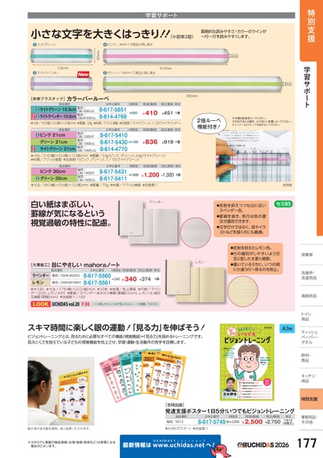 特別支援学習サポート保健室保健室洗面所・面所・洗濯用品濯用品清掃用品清掃用品トイレイ用品品ティッシュシュペーパー・パー・タオルタオル飲料・飲料・食品品キッチンキッチン用品品特別支援事務用品・事務用品・その他その他300mm4mm2倍ルーペ機能付き!※太陽を直接見ないでください。※日光の当たる場所、火の近くに放置しないでください。※シンナーなどでレンズを拭かないでください。使用例セミB5●反射を抑えつつも白に近いラベンダー色。●罫線を省き、各行は色の濃淡で識別できます。●文字だけではなく、図やイラストなどを描くのにも最適。レモン●反射を抑えたレモン色。●行の識別がしやすいよう交互に配した太罫と細罫。●書いているうちに、いつの間にか違う行へ移るのを防止。お申込番号8-617-56518-614-4769M価税抜税抜価格税込価格単位¥550¥410¥4511個CBLM-500-LLCBL-500-LGライトグリーン10.5cm型式/ライトラベンダー10.5cm型式/●●商品種別[共栄プラスチック]カラーバールーペ●寸法/105(幅)×25奥)×12高)mm●質量/28g●材質/アクリル樹脂●包装数:1(ライトグリーン)、1/20ライトラベンダー)●商品種別ピンク21cmグリーン21cmライトグリーン21cm型式/CBL-1000-P型式/CBL-1000-G型式/CBL-1000-LGお申込番号8-617-54108-617-54308-614-4770M価税抜税抜価格税込価格単位¥1,100¥836¥9191個●寸法/210(幅)×25(奥)×12(高)mm●質量/53gピンク、グリーン)、54gライトグリーン)●材質/アクリル樹脂●包装数:1(ピンク、グリーン)、1/10(ライトグリーン)商品種別ピンク30cmグリーン30cm●型式/CBL-1400-P型式/CBL-1400-Gお申込番号8-617-54318-617-5411M価税抜税抜価格税込価格単位¥1,600¥1,200¥1,3201個●寸法/300(幅)×25(奥)×12(高)mm●質量/75g●材質/アクリル樹脂●包装数:1白い紙はまぶしい、罫線が気になるという視覚過敏の特性に配慮。ラベンダー[大栗紙工]目にやさしいmahoraノート商品種別型式/OGN-M2002お申込番号M価税抜税抜価格税込価格単位ラベンダーレモン●セミB5●寸法/179(横)×252(縦)mm●30枚●材質/色上質紙●行数/ラベンダー:25行、レモン:44行●罫線/ラベンダー:あみかけ横罫(罫幅8.5mm)、レモン:太・細交互横罫(罫幅5mm)●包装数:1/1008-617-55608-617-5561¥340¥340型式/OGN-M10001¥3741冊UCHIDASvol.20P.88ノートの真ん中のふくらみが気にならないノートを掲載しております。スキマ時間に楽しく眼の運動!「見る力」を伸ばそう!ビジョントレーニングとは、見るために必要なすべての機能(視覚機能)=「見る力」を高めるトレーニングです。見えにくさを抱えている子どもの視覚機能を向上させ、学習・運動・生活動作の苦手を改善します。A3判[合同出版]発達支援ポスター1日5分!いつでもビジョントレーニング商品種別型式/5513お申込番号8-617-5749M価税抜¥2,500税抜価格¥2,500税込価格¥2,750単位1セット(6枚入)学習サポート画期的な読みやすさ!カラーのラインが一行一行を読みやすくします。4mm小さな文字を大きくはっきり!!(※倍率2倍)●ライトグリーン●ピンク/A4サイズ短辺と同じ長さ105mmライトラベンダー●●グリーン/A4サイズ長辺と同じ長さ210mm25mm耐久性のある紙を使用。長く活用いただけます。●A3判(ポスター)●包装数:1※カタログに掲載の商品情報(仕様・価格・税率など)は変更になる場合がございます。最新情報はUCHIDASww.uchidas.netwへ!2026177