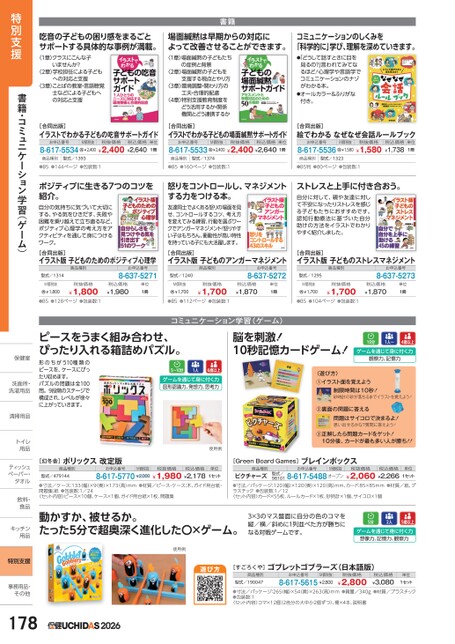 吃音の子どもの困り感をまるごとサポートする具体的な事例が満載。場面緘黙は早期からの対応によって改善させることができます。コミュニケーションのしくみを「科学的に」学び、理解を深めていきます。書籍〈1章〉クラスにこんな子いませんか?〈2章〉学校担任による子どもへの対応と支援〈3章〉ことばの教室・言語聴覚士などによる子どもへの対応と支援〈1章〉場面緘黙の子どもたちの症例と背景〈2章〉場面緘黙の子どもを支援する視点とやり方〈3章〉環境調整・関わり方の工夫・合理的配慮〈4章〉特別支援教育制度をどう活用するか・関係機関とどう連携するか●「どうして話すときに目を見るの?」言われてみてなるほど!心理学や言語学でコミュニケーションのナゾがわかる本。●オールカラー&ふりがな付き。[合同出版]イラストでわかる子どもの吃音サポートガイドお申込番号8-617-5534M価税抜税抜価格税込価格¥2,400¥2,400¥2,640単位1冊[合同出版]イラストでわかる子どもの場面緘黙サポートガイドお申込番号8-617-5533M価税抜税抜価格税込価格単位¥2,400¥2,400¥2,6401冊[合同出版]絵でわかるなぜなぜ会話ルールブックお申込番号8-617-5536M価税抜¥1,580税抜価格¥1,580税込価格¥1,738単位1冊商品種別型式/1393●B5●144ページ●包装数:1商品種別型式/1374●B5●160ページ●包装数:1商品種別型式/1323●B5判●80ページ●包装数:1ポジティブに生きる7つのコツを紹介。怒りをコントロールし、マネジメントする力をつける本。自分の気持ちに気づいて大切にする、やる気をひきだす、失敗や困難を乗り越えて立ち直るなど、ポジティブ心理学の考え方をアクティビティを通して身につけるワーク。[合同出版]イラスト版子どものためのポジティブ心理学友達同士でよくある怒りの場面を見せ、コントロールするコツ、考え方を変えてみる練習、行動を選ぶワークでアンガーマネジメント!怒りやすい子はもちろん、衝動性が高い特性を持っている子にも大活躍します。[合同出版]イラスト版子どものアンガーマネジメントストレスと上手に付き合おう。自分に対して、親や友達に対して不安になったりストレスを感じる子どもたちにおすすめです。認知行動療法に基づいた自分助けの方法をイラストでわかりやすく紹介しました。[合同出版]イラスト版子どものストレスマネジメント商品種別型式/1314お申込番号8-637-5271商品種別型式/1240お申込番号8-637-5272商品種別型式/1295お申込番号8-637-5273M価税抜¥1,800税抜価格¥1,800税込価格¥1,980単位1冊M価税抜¥1,700税抜価格¥1,700税込価格¥1,870単位1冊M価税抜¥1,700税抜価格¥1,700税込価格¥1,870単位1冊●B5●128ページ●包装数:1●B5●112ページ●包装数:1●B5●104ページ●包装数:1コミュニケーション学習(ゲーム)ピースをうまく組み合わせ、ぴったり入れる箱詰めパズル。形のちがう10種類のピースを、ケースにぴったり収めます。パズルの問題は全100問。9段階のステージで構成され、レベルが徐々に上がっていきます。1人5〜10分6歳以上ゲームを通じて身に付く力図形認識力、発想力、思考力[幻冬舎]ポリックス改定版商品種別型式/479144お申込番号M価税抜税抜価格税込価格8-617-5770¥2,000¥1,980¥2,178使用例単位1セット●寸法/ケース:133(幅)×9(奥)×173(高)mm●材質/ピース・ケース:木、ガイド用台紙・問題集:紙●包装数:1/24〈セット内容〉ピース×10個、ケース×1個、ガイド用台紙×1枚、問題集脳を刺激!10秒記憶カードゲーム!10分1人〜4歳以上ゲームを通じて身に付く力観察力、記憶力〈遊び方〉①イラスト面を覚えよう制限時間は10秒!砂時計の砂が落ちるまでイラストを覚えよう!②裏面の問題に答える問題はサイコロで決まるよ!思い出せるかな?質問に答えよう!③正解したら問題カードをゲット!10分後、カードが最も多い人が勝ち!![GreenBoardGames]ブレインボックス商品種別お申込番号M価税抜税抜価格税込価格単位型式/981018-617-5488オープン¥2,060¥2,266ピクチャーズ●寸法/パッケージ:120(幅)×120奥)×120(高)mm、カード:85×85mm●材質/紙、プラスチック●包装数:1/12〈セット内容〉カード×55枚、ルールカード×1枚、砂時計×1個、サイコロ×1個1セット動かすか、被せるか。たった5分で超奥深く進化した〇×ゲーム。3×3のマス盤面に自分の色のコマを縦/横/斜めに1列並べた方が勝ちになる対戦ゲームです。5分5歳以上ゲームを通じて身に付く力2人想像力、記憶力、観察力使用例遊び方[すごろくや]ゴブレットゴブラーズ(日本語版)商品種別型式/190047お申込番号M価税抜8-617-5615¥2,800税抜価格¥2,800税込価格¥3,080単位1セット●寸法/パッケージ:265幅)×54奥)×263高)mm●質量/340g●材質/プラスチック●包装数:1〈セット内容〉コマ×12個(2色分の大中小2個ずつ)、柵×4本、説明書特別支援書籍・コミュニケーション学習(ゲーム)保健室保健室洗面所・洗面洗濯用品洗濯用清掃用品清掃用品トイレトイ用品用ティッシュティッペーパー・タオルタオル飲料・飲料・食品食キッチンキッチン用品用特別支援事務用品・事務用品・その他その他1782026