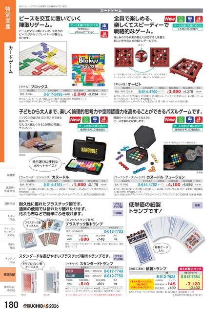 ※パッケージデザインは変更になる場合がございます。ピースを交互に置いていく陣取りゲーム。ピースを交互に置いていき、手持ちのピースが少ないプレイヤーが勝ちとなります。ゲームを通じて身に付く力先を読む力、コミュニケーション10分7歳以上ゲームを通じて身に付く力2人先を読む力、想像力カードゲーム2〜4人7歳以上全員で楽しめる、楽しくてスピーディーで戦略的なゲーム。楽しみながら未来の変化に対応する力を養う、新しい世代のための脳トレゲームです。押すとビー玉を置いたらオービトボタンを押します。ボタンを押すと、ボード上のすべてのビー玉が1つ隣りのマスに移動します。[マテル]ブロックス商品種別型式/BJV44お申込番号M価税抜8-617-5495¥3,200税抜価格¥2,940税込価格¥3,234単位1セット●寸法/パッケージ:267(幅)×267(奥)×38(高)mm●包装数:1/6〈セット内容〉ボード、84ピース(21×4色)、説明書[FlexiQ]オービト商品種別型式/FXG502JPお申込番号M価税抜8-614-4760オープン税抜価格¥3,980税込価格¥4,378単位1セット●寸法/ボード:176幅)×176(奥)×35(高)mm、ビー玉:19(直径)mm●材質/ゲームボード:ABS、ビー玉:ガラス●包装数:1/6〈セット内容〉ゲームボード×1、ビー玉(白×8、黒×8)、ゲームルール(日本語)子どもから大人まで、楽しく論理的思考力や空間認識力を高めることができるパズルゲームです。1つで2つの遊び方(2D・3D)ができる脳トレゲーム。だんだん難しくなる228問の問題にチャレンジ!15分7歳以上ゲームを通じて身に付く力1人論理的思考、空間認識力問題のイラスト通りになるようにピースを重ねて配置します。15分7歳以上ゲームを通じて身に付く力1人論理的思考、空間認識力使用例持ち運びに便利なポケットサイズ!ライトを付けるとピースの色が変化![ラーニング・リソーシズ]カヌードル[ラーニング・リソーシズ]カヌードルフュージョン商品種別型式/EI2978-Jお申込番号M価税抜8-614-4761オープン税抜価格¥1,980税込価格¥2,178単位1セット商品種別型式/EI3082お申込番号M価税抜8-614-4762オープン税抜価格¥4,180税込価格¥4,598●寸法/143(幅)×80奥)×24高)mm●材質/パズルピース:ABS、ケース:ポリプロピレン●包装数:1/96〈セット内容〉収納ケース型ゲームボード、ピース×12、パズルブック、遊び方説明書(日本語)●寸法/約194(幅)×182(奥)×43(高)mm●材質/HIPS、ABS、鉄、PET●電源/単四電池×2個(別売)●包装数:1/8〈セット内容〉光るパズルボード、パズルピース×13、パズルブック、遊び方説明書(日本語・英語)使用例単位1セット耐久性に優れたプラスチック製です。通常の使用では折れたり破れたりせず、汚れも布などで簡単にふき取れます。プラスチック製ケース入り。[エンゼルトランプ販売]プラスチック製トランプ商品種別プラスチック製日本製低単価の紙製トランプです!紙製お申込番号8-612-7783型式/SPNN807PM価税抜¥800税抜価格¥680税込価格¥748単位1個●カード寸法/57×89mm●材質/PVC●54枚入●包装数:1/10紙製ケース入り。スタンダードな遊びやすいプラスチック製のトランプです。スタンダードトランプポリプロピレン製[ハナヤマ]プラスチック製ケース入り。REDBLUEM価税抜¥900商品種別型式/13058230型式/13058247お申込番号8-612-77498-612-7750税抜価格¥810税込価格¥891単位1個REDBLUE●カード寸法/57×88mm●材質/カード:プラスチック、カードケース:ポリプロピレン●54枚入●包装数:1/60※メーカー都合によりパッケージ、ケースの仕様が変更となる場合があります。[池田工業社]紙製トランプ1個8-612-7635オープンM価税抜税抜価格¥145¥159税込価格まとめ買いパック1組(24セット)8-612-7654ー¥3,120¥3,432「まとめ買いパック」は、「1組」単位でお申し込みください。●カード寸法/57×87mm●材質/紙●54枚入●包装数:1/24※柄は途中で切り替わることがあります。特別支援カードゲーム保健室保健室洗面所・洗面洗濯用品洗濯用清掃用品清掃用品トイレトイ用品用ティッシュティッペーパー・タオルタオル飲料・飲料・食品食キッチンキッチン用品用特別支援事務用品・事務用品・その他その他1802026
