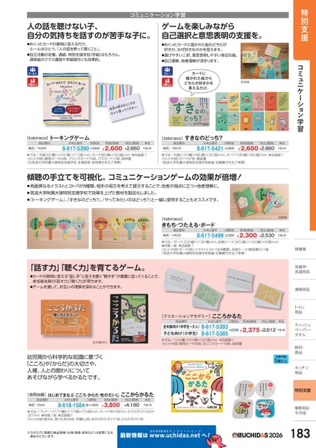 特別支援コミュニケーション学習単位1セット保健室保健室洗面所・面所・洗濯用品濯用品清掃用品清掃用品トイレイ用品品ティッシュシュペーパー・パー・タオルタオル飲料・飲料・食品品キッチンキッチン用品品特別支援事務用品・事務用品・その他その他コミュニケーション学習人の話を聴けない子、自分の気持ちを話すのが苦手な子に。●めくったカードの質問に答えるだけ。ルールはひとつ、人の話を黙って聴くこと』。●自立活動の定番。通級、特別支援学校(学級)はもちろん、通常級のクラス運営や学級開きにも効果的。ゲームを楽しみながら自己選択と意思表明の支援を。●めくったカードに描かれた絵のどちらが好きか、なぜ好きなのかを答えます。●選びやすい二択、意思表明しやすい身近な絵。●自己理解、他者理解が深まります。2〜6人6歳以上2人〜3歳以上カードに描かれた絵からどちらが好きかを答えるだけ。使用例[tobiraco]トーキングゲーム[tobiraco]すきなのどっち?商品種別型式/16004お申込番号M価税抜8-617-5390¥2,600税抜価格¥2,600税込価格¥2,860単位1セット商品種別型式/18018お申込番号8-617-5421¥2,600M価税抜税抜価格税込価格¥2,600¥2,860●寸法/外箱:92(幅)×105(奥)×17(高)mm、カード:80(横)×50(縦)mm●包装数:1〈セット内容〉質問カード64枚、ブランクカード10枚、パスカード12枚、説明書〈元筑波大学附属大塚特別支援学校支援部長安部博志先生ご考案〉●寸法/外箱:121幅)×88奥)×25高)mm、カード:108(横)×86(縦)mm●包装数:1〈セット内容〉カード47枚、解説書〈筑波大学附属大塚特別支援学校教諭佐藤義竹先生ご考案〉傾聴の手立てを可視化。コミュニケーションゲームの効果が倍増!●両面異なるイラストとコトバが8種類。相手の見方を考えて提示することで、他者の視点に立つ=他者理解に。●筑波大学附属大塚特別支援学校で効果を上げた教材を製品化しました。●『トーキングゲーム』、すきなのどっち?』、やってみたいのはどっち?』と一緒に使用することもオススメです。[tobiraco]きもち・つたえる・ボード商品種別型式/19020お申込番号M価税抜8-617-5499¥2,300収納時税抜価格¥2,300税込価格¥2,530単位1セット●寸法/ボード:230(縦)×130(横)mm、収納ケース:245縦)×150横)×9高)mm●材質/紙●包装数:1〈セット内容〉ボード4枚(イラストとコトバは8種類)、収納ケース(解説書付)1個〈筑波大学附属大塚特別支援学校教諭佐藤義竹先生ご考案〉「話す力」「聴く力」を育てるゲーム。●カードの質問に答える“話し手”と答えを聴く“聴き手”が順番に回ってくることで、参加者全員の「話す力」聴く力」が育ちます。●ゲームを通して、お互いの理解を深めることができます。[クリエーションアカデミー]こころかるた商品種別お申込番号M価税抜税抜価格税込価格単位全年齢向け(中学生〜大人)8-617-5383子ども向け(小学生)8-617-5385¥2,500¥2,375¥2,6121セット全年齢向け●寸法/124(幅)×93(奥)×20(高)mm●包装数:1〈セット内容〉質問カード90枚、まごころカード18枚、説明書幼児期から科学的な知識に基づく「こころ」や「からだ」の大切さや、人権、人との関わりについてあそびながら学べるかるたです。対象年齢5歳以上[合同出版]はじめてまなぶこころ・からだ・性のだいじここからかるた商品種別型式/5504お申込番号8-618-1584M価税抜¥3,800税抜価格¥3,800税込価格¥4,180単位1セット●寸法/パッケージ:117幅)×117奥)×75高)mm、カード:90×90mm、からだガイド:420×297mm●材質/紙●包装数:1〈セット内容〉読み札、取り札各46枚、予備札2枚、あそびかたガイド1枚、からだガイド1枚※カタログに掲載の商品情報(仕様・価格・税率など)は変更になる場合がございます。最新情報はUCHIDASww.uchidas.netwへ!2026183