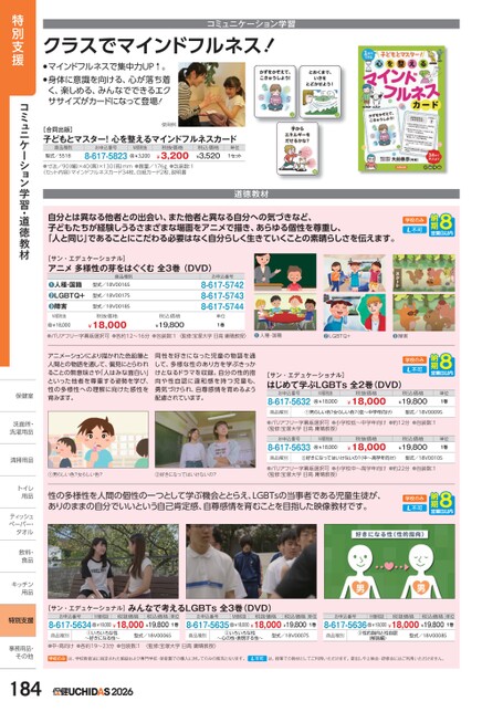 クラスでマインドフルネス!コミュニケーション学習●マインドフルネスで集中力UP↑。●身体に意識を向ける、心が落ち着く、楽しめる、みんなでできるエクササイズがカードになって登場![合同出版]子どもとマスター!心を整えるマインドフルネスカード商品種別型式/5518お申込番号8-617-5823M価税抜¥3,200税抜価格¥3,200税込価格¥3,520使用例●寸法/90(幅)×40(奥)×130(高)mm●質量/176g●包装数:1〈セット内容〉マインドフルネスカード34枚、白紙カード2枚、説明書単位1セット道徳教材自分とは異なる他者との出会い、また他者と異なる自分への気づきなど、子どもたちが経験しうるさまざまな場面をアニメで描き、あらゆる個性を尊重し、「人と同じ」であることにこだわる必要はなく自分らしく生きていくことの素晴らしさを伝えます。学校のみ●バリアフリー字幕版選択可●各約12〜16分●包装数:1〈監修:宝塚大学日高庸晴教授〉❶人種・国籍❷LGBTQ+❸障害アニメーションにより描かれた色鉛筆と人間との物語を通して、偏見にとらわれることの無意味さや「人はみな面白い」といった他者を尊重する姿勢を学び、性の多様性への理解に向けた感性を育みます。同性を好きになった児童の物語を通して、多様な性のあり方を学ぶきっかけとなるドラマを収録。自分の性的指向や性自認に違和感を持つ児童も、勇気づけられ、自尊感情を育めるよう配慮されています。学校のみ[サン・エデュケーショナル]はじめて学ぶLGBTs全2巻(DVD)お申込番号8-617-5632M価税抜¥18,000税抜価格¥18,000税込価格¥19,800単位1巻①男らしい色?女らしい色?②好きになってはいけないの?商品種別①男らしい色?女らしい色?〈低〜中学年向け〉型式/18V0009S●バリアフリー字幕版選択可●小学校低〜中学年向け●約12分●包装数:1〈監修:宝塚大学日高庸晴教授〉お申込番号8-617-5633M価税抜¥18,000税抜価格¥18,000税込価格¥19,800単位1巻商品種別②好きになってはいけないの?〈中〜高学年向け〉型式/18V0010S●バリアフリー字幕版選択可●小学校中〜高学年向け●約22分●包装数:1〈監修:宝塚大学日高庸晴教授〉性の多様性を人間の個性の一つとして学ぶ機会ととらえ、LGBTsの当事者である児童生徒が、ありのままの自分でいいという自己肯定感、自尊感情を育むことを目指した映像教材です。学校のみ[サン・エデュケーショナル]みんなで考えるLGBTs全3巻(DVD)お申込番号8-617-5634M価税抜税抜価格税込価格単位¥18,000¥18,000¥19,8001巻お申込番号8-617-5635M価税抜税抜価格税込価格単位¥18,000¥18,000¥19,8001巻お申込番号8-617-5636M価税抜税抜価格税込価格単位¥18,000¥18,000¥19,8001巻商品種別①いろいろな性〜好きになる性〜型式/18V0006S商品種別②いろいろな性〜心の性・表現する性〜型式/18V0007S商品種別③性的指向と性自認(解説編)型式/18V0008S●中・高向け●各約19〜23分●包装数:1〈監修:宝塚大学日高庸晴教授〉学校のみは、学校教育法に指定された施設および専門学校・保育園での購入に対してのみの販売となります。は、授業での教材としてご利用いただけます。貸出しや上映会・研修会にはご利用いただけません。お申込番号8-617-57428-617-57438-617-5744税込価格¥19,800単位1巻商品種別型式/18V0016S型式/18V0017S型式/18V0018S税抜価格¥18,000人種・国籍LGBTQ+障害●●●M価税抜¥18,000[サン・エデュケーショナル]アニメ多様性の芽をはぐくむ全3巻(DVD)特別支援コミュニケーション学習・道徳教材保健室保健室洗面所・洗面洗濯用品洗濯用清掃用品清掃用品トイレトイ用品用ティッシュティッペーパー・タオルタオル飲料・飲料・食品食キッチンキッチン用品用特別支援事務用品・事務用品・その他その他1842026