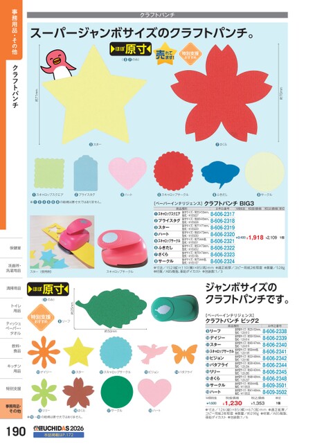 クラフトパンチスーパージャンボサイズのクラフトパンチ。ほぼ原寸(●●のみ)約70mm約71mm●スター●さくら●スキャロップスクエア●プライスタグ●ハート●スキャロップサークル●ふきだし●サークル¥2,400¥1,918¥2,1091個お申込番号8-606-23178-606-23188-606-23198-606-23208-606-23218-606-23228-606-23238-606-2324商品種別抜きサイズ/約55×55mm、型式/4105027スキャロップスクエアプライスタグ抜きサイズ/約68×45mm、スターハートスキャロップサークルふきだしさくらサークル型式/4105028抜きサイズ/約71×71mm、型式/4105029抜きサイズ/約65×73mm、型式/4105030抜きサイズ/約75mm径、型式/4105031抜きサイズ/約53×73mm、型式/4105032抜きサイズ/約70×74mm、型式/4105106抜きサイズ/約75mm径、型式/4105107●●●●●●●●※●●●●●●の絵柄は原寸大ではありません。[ペーパーインテリジェンス]クラフトパンチBIG3M価税抜税抜価格税込価格単位ジャンボサイズのクラフトパンチです。[ペーパーインテリジェンス]クラフトパンチビッグ2お申込番号8-606-23388-606-23398-606-23408-606-23418-606-23428-606-23448-606-23458-606-23488-609-35018-609-3502商品種別抜き型サイズ/約25×50mm、型式/120-013抜き型サイズ/約50×50mm、型式/120-014抜き型サイズ/約45×47mm、型式/120-019リーフデイジースタースキャロップサークル抜き型サイズ/約50mm径、ピジョンバタフライリリーさくらサークルハート型式/120-109抜き型サイズ/約32×48mm、型式/120-180抜き型サイズ/約30×40mm、型式/120-256抜き型サイズ/約45×40mm、型式/120-285抜き型サイズ/約48×48mm、型式/120-237抜き型サイズ/約50mm径、型式/4110533抜き型サイズ/約41×48mm、型式/4110532●●●●●●●●●●M価税抜¥1,500税抜価格¥1,230税込価格¥1,353単位1個●デイジー●スター●スキャロップサークル●ピジョン●バタフライ約50mm約25mm●リーフほぼ原寸(❾のみ)●リリーさくら※❿〜⓲の絵柄は原寸大ではありません。●●サークル●ハート●寸法/126(縦)×85(横)×67(高)mm●適正紙厚/コピー用紙2枚程度●質量/約298g●材質/ABS樹脂、亜鉛ダイカスト●包装数:1/6スター(使用例)スキャロップサークル●寸法/152(縦)×110(横)×85(高)mm●適正紙厚/コピー用紙2枚程度●質量/528g●材質/ABS樹脂、亜鉛ダイカスト●包装数:1/3事務用品・その他クラフトパンチ保健室保健室洗面所・洗面洗濯用品洗濯用清掃用品清掃用品トイレトイ用品用ティッシュティッペーパー・タオルタオル飲料・飲料・食品食キッチンキッチン用品用特別支援特別支事務用品・その他2026本誌掲載はP.172