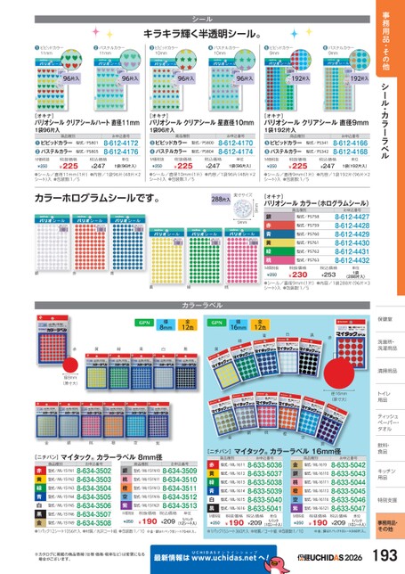 事務用品・その他シール・カラーラベル保健室保健室洗面所・面所・洗濯用品濯用品清掃用品清掃用品トイレイ用品品ティッシュシュペーパー・パー・タオルタオル飲料・飲料・食品品キッチンキッチン用品品特別支援別支援事務用品・その他シールキラキラ輝く半透明シール。❶ビビッドカラー11mm❷パステルカラー11mm❸ビビッドカラー10mm❹パステルカラー10mm❺ビビッドカラー9mm❻パステルカラー9mm96片入96片入96片入96片入192片入192片入[オキナ]パリオシールクリアシールハート直径11mm1袋96片入[オキナ]パリオシールクリアシール星直径10mm1袋96片入[オキナ]パリオシールクリアシール直径9mm1袋192片入お申込番号8-612-41668-612-4168商品種別型式/PS341型式/PS342ビビッドカラーパステルカラー❺❻お申込番号8-612-41708-612-4174商品種別型式/PS800型式/PS804ビビッドカラーパステルカラー❸❹お申込番号8-612-41728-612-4176商品種別型式/PS801型式/PS805ビビッドカラーパステルカラー❶❷M価税抜¥250税抜価格¥225税込価格¥247単位1袋(96片入)M価税抜¥250税抜価格¥225税込価格¥247単位1袋(96片入)M価税抜¥250税抜価格¥225税込価格¥247単位1袋(192片入)●シール/直径11mm(1片)●内容/1袋96片(48片×2シート)入●包装数:1/5●シール/直径10mm(1片)●内容/1袋96片(48片×2シート)入●包装数:1/5●シール/直径9mm(1片)●内容/1袋192片(96片×2シート)入●包装数:1/5[オキナ]パリオシールカラー(ホログラムシール)銀赤青黄緑桃商品種別型式/PS758型式/PS759型式/PS760型式/PS761型式/PS762型式/PS763お申込番号8-612-44278-612-44288-612-44298-612-44308-612-44318-612-44329mm9mm実寸サイズ288片入カラーホログラムシールです。銀赤青黄緑桃カラーラベル径8mm全12色M価税抜¥250税抜価格¥230税込価格¥253単位1袋(288片入)●シール/直径9mm(1片)●内容/1袋288片(96片×3シート)入●包装数:1/5径16mm緑全12色青白黒赤赤黄緑青白黒黄径8mm(原寸大)金銀桃橙空紫[ニチバン]商品種別型式/ML-151N1マイタック®カラーラベル8mm径お申込番号型式/ML-151N3型式/ML-151N4型式/ML-151N2赤黄緑青白黒金●1パック12シート1056片入●材質/光沢コート紙●包装数:1/108-634-35028-634-35038-634-35048-634-35058-634-35068-634-35078-634-3508銀桃橙空紫型式/ML-151N5型式/ML-151N6型式/ML-151N9M価税抜¥250商品種別型式/ML-151N10型式/ML-151N11型式/ML-151N13型式/ML-151N16型式/ML-151N21お申込番号8-634-35098-634-35108-634-35118-634-35128-634-3513税抜価格¥190税込価格¥209単位1パック(12シート入)M価税抜¥250税抜価格¥190税込価格¥209単位1パック(15シート入)M価税抜¥250※金・銀は1パック8シート704片入。●1パック15シート360片入●材質/コート紙●包装数:1/10径16mm(原寸大)金銀桃橙空[ニチバン]マイタック®カラーラベル16mm径紫商品種別型式/ML-1611型式/ML-1612型式/ML-1613型式/ML-1614型式/ML-1615型式/ML-1616お申込番号8-633-50368-633-50378-633-50388-633-50398-633-50408-633-5041赤黄緑青白黒金銀桃橙空紫商品種別型式/ML-1619型式/ML-16110型式/ML-16111型式/ML-16113型式/ML-16116型式/ML-16121お申込番号8-633-50428-633-50438-633-50448-633-50458-633-50468-633-5047税抜価格¥190税込価格¥209(15シート入)※金、銀は1パック10シート240片入。単位1パック※カタログに掲載の商品情報(仕様・価格・税率など)は変更になる場合がございます。最新情報はUCHIDASww.uchidas.netwへ!2026