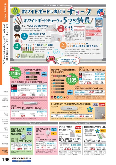 ホワイトボードチョーク関連用品ホワイトボードに書けるMovie筆記距離の比較ホワイトボードチョーク太字中字約1.5倍1本あたり145円(税抜)約3倍約105円(税抜)1本あたり一般的なホワイトボードマーカー1本あたり約105〜145円(税抜)とっても経済的市販のホワイトボードマーカーの約1.5倍(中字)〜3倍(太字)※の筆記距離で、最後まで使い切ることができます。※当社独自調査において、筆記距離に対するコスト比較に基づいています。・ドリルなど生徒用に作成したラミネーターフィルムに書き消しできて、マーカーのように黒ずみません。・また、ビーカーなどガラス器具にも書き消しができて、ラベルを貼る手間が省けます。ラミネーターフィルムやガラス器具にも書き消しできます。長5特材質は米ぬかから取れるワックスを使用していて安全で環境にも配慮しています!長2特チョークのような書きごこちチョークのように滑らかな書きごこちです。筆圧で線幅を自在に調整できます!長1特消しカスがでない市販のマイクロファイバークロスか固く絞った雑巾※できれいに消すことができます。消しカスが出ないので衛生的です。※ホワイトボードイレーザーでは消去できませんのでご注意ください。長3特うれしい6色展開ホワイトボードマーカーでご要望が多かったカラーバリエーションをご用意しました!CUDカラーCUD(カラーユニバーサルデザイン)に認定されています。※黒青緑橙の4色)長4特ウ[ダチ]トボホワイードチョーク紙巻タイプ中字10本入商品種別型式/UWBCH-NP-BK-10型式/UWBCH-NP-R-10型式/UWBCH-NP-BL-10黒赤青お申込番号8-631-48578-631-48588-631-4859M価税抜オープン税抜価格¥1,050税込価格¥1,155単位1組(10本入)1本あたり105税込¥115.5税抜¥お得75mm6色セットは特別支援教室にオススメです!大きな文字の提示に!90mm線幅約2〜10mm41.5mm赤黒青1本あたり145税込¥159.5税抜¥お得[ウチダ]ホワイトボードチョーク紙巻タイプ太字10本入黒赤青商品種別型式/UWBCH-BP-BK-10型式/UWBCH-BP-R-10型式/UWBCH-BP-BL-10お申込番号8-631-48638-631-48648-631-4865M価税抜オープン寸4.5法/(径クス・顔料・耐税抜価格¥1,450税込価格¥1,595質約1量/日本製●包装数:1/61●9.8g●)×90(長)mmワッ油紙●単位1組(10本入)●材質/ライス線幅約2〜6mm[ウチダ]イトホワボードチョーク紙巻タイプ中字お申込番号M価税抜税抜価格8-631-4866オープン¥800¥8806色セット単位1組税込価格(6色各1本入)商品種別型式/UWBCH-NP-6C量質/約(長5)mm)7×(0寸法径/17耐料油紙顔クワッス・スライ材質/●日本製●.●・た本●.2g1あり)●包装数:1/10赤黒青緑黄橙10.5mm赤黒青緑黄橙事務用品・その他ホワイトボードチョーク関連用品・マグネットクリップ・ファイバークロス保健室保健室洗面所・洗面洗濯用品洗濯用清掃用品清掃用品トイレトイ用品用ティッシュティッペーパー・タオルタオル飲料・飲料・食品食キッチンキッチン用品用極細繊維が洗剤なしで汚れを落とします。●吸収性と速乾性に優れています。●5色パックなので用途別に使い分けできます。5枚入[トレードワン]マイクロファイバークロス5Pセット商品種別型式/30755お申込番号8-630-5616[林]掛けひも付きマルチマイクロファイバークロス10枚組商品種別型式/ZM477829お申込番号8-630-5693[オート]マグネットフック丸2個入商品種別お申込番号耐荷重/約1kgf型式/OH-14M8-636-3012単位1パックM価税抜¥460税抜価格¥370税込価格¥407(2個入)●寸法/41(幅)×29(奥)×75(高)mm●材質/ABS樹脂、ステンレス、フェライト磁石●色/白●包装数:1/10税込価格税抜価格¥2,200¥2,420M価税抜オープン●寸法(1枚あたり)/200縦)×300横)mm●質量(1枚あたり)/約25g●材質/ポリエステル90%、ナイロン10%●包装数:1単位1セット(10枚入)税抜価格¥300税込価格¥330M価税抜オープン(5枚入)●寸法(1枚あたり)/270縦)×270横)×2(厚)mm●質量(1枚あたり)/16g●材質/ポリエステル85%、ナイロン15%●包装数:1/144単位1袋マグネットクリップファイバークロス裏面マグネット付使用例×3チャック式ホルダーで、最後まで使い切ることが出来ます。14mm[祥碩堂]ーョチクホルダー(太字用)111mm商品種別税抜価格¥400型式/S15417M価税抜オープン寸法/税込価格¥4401/1包装数:●14(径)×111(長)mm●03本パックお申込番号8-630-5635単位1パック(3本入)※チョークは付属しておりません。チョークホルダー[ウチダ]チョークホルダー(中字用)商品種別型式/U-CHKHD-01白●寸法/92幅)×7奥)×21(厚)mm●材質/プラスチック●マグネット付●包装数:18-630-5698オープン¥483税込価格¥531単位1本お申込番号M価税抜税抜価格まとめて貼れる。書類の仮置きなどに便利。耐荷重800g綴じ数約90枚キャビネット、ロッカーに最適です。保護シート付き。耐荷重約1kgf2個入ホワイトボードの文字が簡単に消せるマルチクロス!洗って、再利用できます。10枚入[クラウン]ニューマグネットクリップネ商品種別お申込番号耐荷重/800g、クリップ幅/27mm、綴じ数/約90枚、型式/CR-MGM20-SL8-612-0008M価税抜¥300税抜価格¥210税込価格¥231単位1個●材質/本体:スチール・フェライト磁石●包装数:1/122026本誌掲載はP.916特別支援特別支37mm事務用品・その