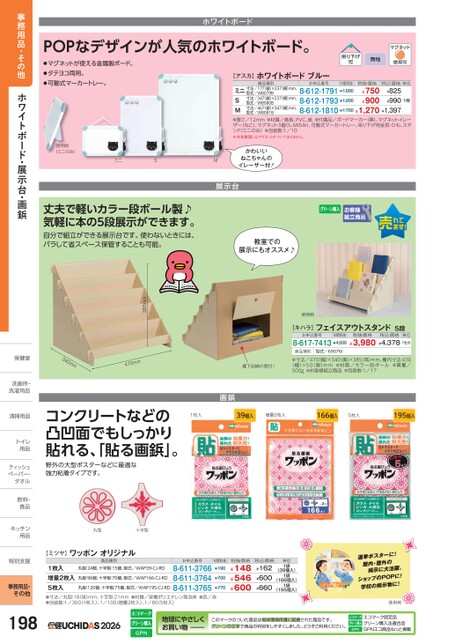 POPなデザインが人気のホワイトボード。ホワイトボード●マグネットが使える金属製ボード。●タテヨコ両用。●可動式マーカートレー。無地[アスカ]ホワイトボードブルー商品種別お申込番号M価税抜税抜価格税込価格単位型式/WB079B寸法/347縦)×237(横)mm、型式/WB080B寸法/467縦)×347(横)mm、型式/WB081B8-612-1791¥1,000¥8258-612-1793¥1,200¥9908-612-1810¥1,700¥1,270¥1,397ミニ寸法/177縦)×237(横)mm、SM●厚さ/12mm●材質/鉄板、PVC、紙●付属品/ボードマーカー(黒)、マグネットイレーザー(ねこ)、マグネット3個(S、Mのみ)、可動式マーカートレー、吊り下げ用金具・ひも、スタンド(ミニのみ)●包装数:1/10※本体裏面にはマグネットがついておりません。¥750¥9001枚使用例[キハラ]フェイスアウトスタンド5段お申込番号M価税抜税抜価格税込価格単位8-617-7413¥4,500¥3,980¥4,3781セット商品種別型式/69076I棚下収納の窓付!●寸法/470幅)×340(奥)×385(高)mm、棚内寸法:430(幅)×50(奥)mm●材質/カラー段ボール●質量/500g●お客様組立商品●包装数:1/17画鋲1枚入39個入増量2枚入166個入5枚入195個入385mmmm074340mmコンクリートなどの凸凹面でもしっかり貼れる、貼る画鋲」。野外の大型ポスターなどに最適な強力粘着タイプです。丸型十字型使用例(ミニのみ)ミニSMかわいいねこちゃんのイレーザー付!丈夫で軽いカラー段ボール製♪気軽に本の5段展示ができます。自分で組立ができる展示台です。使わないときには、バラして省スペース保管することも可能。展示台教室での展示にもオススメ♪[ミツヤ]ワッポンオリジナル商品種別丸型:24個、十字型:15個、型式/WAP39-CJ-RD丸型:96個、十字型:70個、型式/WAP166-CJ-RD1枚入増量2枚入5枚入●寸法/丸型:18径)mm、十字型:21mm●材質/架橋ポリエチレン発泡体●色/赤●包装数:1/300(1枚入)、1/100(増量2枚入)、1/80(5枚入)8-611-37668-611-37648-611-3765丸型:120個、十字型:75個、型式/WAP195-CJ-RD¥700¥770お申込番号M価税抜¥190税抜価格¥148¥546¥600税込価格¥162¥600¥660単位1袋1袋1袋(39個入)(166個入)(195個入)2026地球にやさしくお買い物このマークのついた商品は地球環境保護に配慮された商品です。グリーンの文字で商品の判別をしやすくしました。どうぞご利用ください。使用例エコマーク認定品グリーン購入法適合品GPNエコ商品ねっと掲載事務用品・その他ホワイトボード・展示台・画鋲保健室保健室洗面所・洗面洗濯用品洗濯用清掃用品清掃用品トイレトイ用品用ティッシュティッペーパー・タオルタオル飲料・飲料・食品食キッチンキッチン用品用特別支援特別支事務用品・その他198