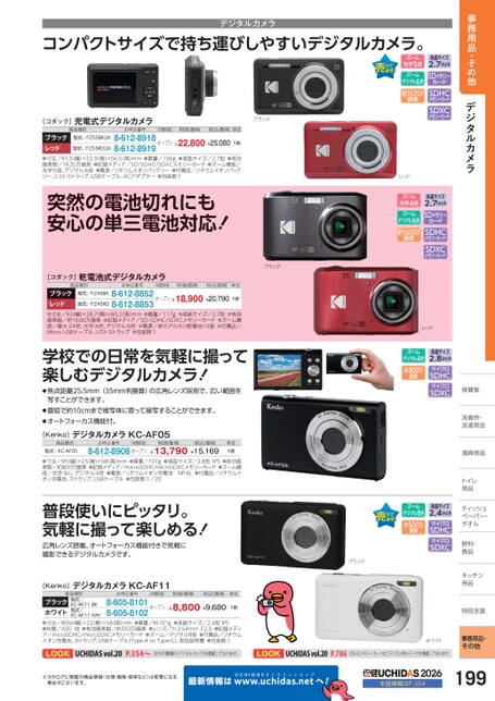 事務用品・その他デジタルカメラ保健室保健室洗面所・面所・洗濯用品濯用品清掃用品清掃用品トイレイ用品品ティッシュシュペーパー・パー・タオルタオル飲料・飲料・食品品キッチンキッチン用品品特別支援別支援事務用品・その他コンパクトサイズで持ち運びしやすいデジタルカメラ。デジタルカメラズーム光学5倍ズームデジタル6倍約1635万画素液晶サイズ2.7inchSDメモリーカードSDHCメモリーカードSDXCメモリーカードブラックブラック[コダック]充電式デジタルカメラ商品種別お申込番号M価税抜税抜価格税込価格単位型式/FZ55BK2A型式/FZ55RD2A8-612-8918オープン¥22,800¥25,080ブラックレッド●寸法/91.5(幅)×22.9奥)×56.5(高)mm●液晶サイズ/2.7型●有効画素数/1635万画素●記録メディア/SD/SDHC/SDXCメモリーカード●ズーム機能/光学:5倍、デジタル:6倍●電源/リチウムイオンバッテリー●付属品/リチウムイオンバッテリー、リストストラップ、USBケーブル、ACアダプター●包装数:18-612-8919●質量/106g1台突然の電池切れにも安心の単三電池対応![コダック]乾電池式デジタルカメラ商品種別お申込番号M価税抜税抜価格税込価格単位型式/FZ45BK型式/FZ45RD8-612-8852オープン¥18,900¥20,790ブラックレッド●寸法/93(幅)×28.7奥)×60.2(高)mm●質量/117g●液晶サイズ/2.7型●有効画素数/約1600万画素●記録メディア/SD/SDHC/SDXCメモリーカード●ズーム機能/最大:24倍、光学:4倍、デジタル:6倍●電源/単三アルカリ乾電池×2個●付属品/MicroUSBケーブル、リストストラップ●包装数:18-612-88531台学校での日常を気軽に撮って楽しむデジタルカメラ!●焦点距離25.5mm(35mm判換算)の広角レンズ採用で、広い範囲を写すことができます。●最短で約10cmまで被写体に寄って接写することができます。●オートフォーカス機能付。[Kenko]デジタルカメラKC-AF05商品種別型式/KC-AF05お申込番号M価税抜税抜価格8-612-8908オープン¥13,790¥15,169税込価格単位1台●寸法/95(幅)×23(奥)×58(高)mm●液晶サイズ/2.8型IPS●有効画素数/約800万画素●記録メディア/microSDHC/microSDXCメモリーカード●ズーム機能/光学:なし、デジタル:4倍●電源/リチウムイオン充電池NP-6L●付属品/リチウムイオン充電池、ストラップ、USBケーブル●包装数:1/20●質量/101g普段使いにピッタリ。気軽に撮って楽しめる!広角レンズ搭載、オートフォーカス機能付きで気軽に撮影できるデジタルカメラです。[Kenko]デジタルカメラKC-AF11M価税抜税抜価格お申込番号商品種別型式/KC-AF11型式/KC-AF11WHBK8-605-8101オープン8-605-8102ブラックホワイト●寸法/約94(幅)×23(奥)×58(高)mm●材質/ABS他●有効画素数/約500万画素●レンズ/f=3.54mmF2.0●記録メディア/microSDHC/microSDXCメモリーカード●ズーム/デジタル8倍●付属品/リチウムイオン充電池、ストラップ、USBケーブル(Type-AtoType-C)、取扱説明書●包装数:1¥8,800¥9,680●液晶サイズ/2.4型IPS●質量/約101g1台税込価格単位P.786UCHIDSvol.20P.354〜SDHCメモリーカードなどデジカメ用メディアを掲載しております。ほかの種類のデジタラも掲載しります。レッドズーム光学4倍ズームデジタル6倍約1600万画素液晶サイズ2.7inchSDメモリーカードSDHCメモリーカードSDXCメモリーカードレッドズームデジタル4倍約800万画素ズームデジタル8倍約500万画素液晶サイズ2.8inchマイクロSDHCマイクロSDXC液晶サイズ2.4inchマイクロSDHCマイクロSDXCブラックUCHIDASvol.20P.786SDHCメモリーカードなどデジカメ用メディアを掲載しております。ホワイト※カタログに掲載の商品情報(仕様・価格・税率など)は変更になる場合がございます。最新情報はUCHIDASww.uchidas.netwへ!2026本誌掲載はP.354199