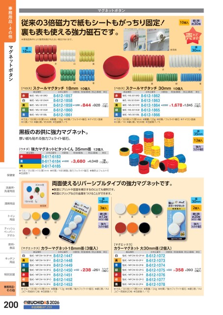 マグネットボタン従来の3倍磁力で紙もシートもがっちり固定!裏も表も使える強力磁石です。※接地面条件により耐荷枚数がもたない場合があります。10個入綴じ数約30枚径18mm使用例径30mm赤白緑黄青赤黄緑[ベロス]スクールマグタッチ18mm10個入[ベロス]スクールマグタッチ30mm10個入M価税抜税抜価格税込価格単位M価税抜税抜価格税込価格商品種別型式/MS-1810YE型式/MS-1810RD型式/MS-1810WH赤白黄緑青●寸法/18(径)×9(厚)mm●入数/10型式/MS-1810GR型式/MS-1810BLお申込番号8-612-18578-612-18588-612-18598-612-18608-612-1861お申込番号商品種別型式/MS-3010RD型式/MS-3010WH型式/MS-3010YE赤白黄緑青●寸法/30(径)×7(厚)mm●質量/23g●入数/108-612-18628-612-18638-612-18648-612-18658-612-1866●綴じ数/約30枚●包装数:1/5型式/MS-3010GR型式/MS-3010BL●綴じ数/約30枚●包装数:1/5●質量/10g●材質/フェライト磁石●ナイロン塗装●材質/フェライト磁石●ナイロン塗装¥1,280¥844¥9281パック(10個入)¥2,550¥1,678¥1,8451パック(10個入)黒板のお供に強力マグネット。厚い紙も貼れる強力フェライト磁石。[ウチダ]強力マグネットピタットくん35mm径12個入商品種別お申込番号M価税抜税抜価格税込価格単位¥4,600¥3,680¥4,0481組(12個入)赤青黄●寸法/35(径)×15厚)mm●包装数:18-617-61838-617-61848-617-6185●材質/ABS樹脂、強力フェライト磁石●傷防止フェルト付両面使えるリバーシブルタイプの強力マグネットです。●教室にプリントや図面を掲示するのにとても便利です。●表面にクリップなどの金属をつけることができます。径18mm3個入綴じ数約12枚(A4コピー用紙)強力フェライト磁石緑白赤黄橙青黒30mm径18mm径使用例白黄青緑赤橙黒白青単位径35mm12個入強力フェライト磁石径30mm2個入綴じ数約20枚(A4コピー用紙)強力フェライト磁石[マグエックス]カラーマグネット18mm径(3個入)商品種別お申込番号M価税抜税抜価格税込価格単位[マグエックス]カラーマグネット大30mm径(2個入)商品種別お申込番号M価税抜税抜価格税込価格単位型式/MFCM-18-3P-B型式/MFCM-18-3P-Y型式/MFCM-18-3P-G型式/MFCM-18-3P-W白黄青緑赤橙黒●寸法/18(径)×9厚)mm●質量/12g●材質/強力フェライト磁石コピー用紙約12枚●包装数:1/108-612-14478-612-14488-612-14498-612-14508-612-14518-612-14528-612-1453型式/MFCM-18-3P-O型式/MFCM-18-3P-K型式/MFCM-18-3P-R¥450型式/MFCM-30-2P-B型式/MFCM-30-2P-Y型式/MFCM-30-2P-G型式/MFCM-30-2P-W白黄青緑赤橙黒●寸法/30(径)×7(厚)mm●質量/24g●材質/強力フェライト磁石コピー用紙約20枚●包装数:1/108-612-10728-612-10738-612-10748-612-10758-612-10768-612-10778-612-1078型式/MFCM-30-2P-O型式/MFCM-30-2P-K型式/MFCM-30-2P-R¥550¥238¥2611パック(3個入)¥358¥3931パック(2個入)●綴じ数/A4●綴じ数/A42002026本誌掲載はP.259事務用品・その他マグネットボタン保健室保健室洗面所・洗面洗濯用品洗濯用清掃用品清掃用品トイレトイ用品用ティッシュティッペーパー・タオルタオル飲料・飲料・食品食キッチンキッチン用品用特別支援特別支事務用品・その他
