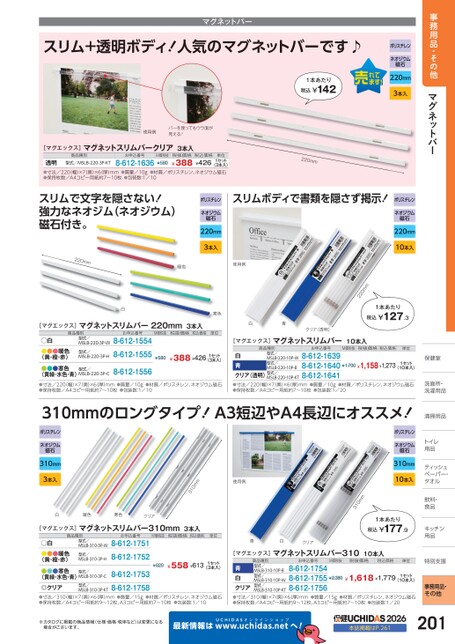 保健室保健室洗面所・面所・洗濯用品濯用品清掃用品清掃用品トイレイ用品品ティッシュシュペーパー・パー・タオルタオル飲料・飲料・食品品キッチンキッチン用品品事務用品・その他201事務用品・その他マグネットバーポリスチレンネオジウム磁石220mm3本入1本あたり税込¥142220mmスリム+透明ボディ!人気のマグネットバーです♪マグネットバー使用例バーを使ってもウラ面が見える![マグエックス]マグネットスリムバークリア3本入商品種別お申込番号型式/MSLB-220-3P-KT透明●寸法/220(幅)×7(奥)×6厚)mm●質量/10g●保持枚数/A4コピー用紙約7〜10枚●包装数:1/108-612-1636M価税抜¥580税抜価格税込価格¥388¥426単位1セット(3本入)●材質/ポリスチレン、ネオジウム磁石スリムで文字を隠さない!強力なネオジム(ネオジウム)磁石付き。ポリスチレンネオジウム磁石220mm3本入220mm暖色使用例白寒色[マグエックス]マグネットスリムバー220mm3本入商品種別お申込番号M価税抜税抜価格税込価格単位型式/MSLB-220-3P-H型式/MSLB-220-3P-W8-612-15548-612-1555●白●●●暖色(黄・橙・赤)●●●寒色(黄緑・水色・青)●寸法/220(幅)×7奥)×6(厚)mm●質量/10g●材質/ポリスチレン、ネオジウム磁石●保持枚数/A4コピー用紙約7〜10枚●包装数:1/10¥388¥4268-612-1556型式/MSLB-220-3P-C1セット¥580(3本入)スリムボディで書類を隠さず掲示!ポリスチレンネオジウム磁石220mm10本入0mm221本あたり税込¥127.3白青クリア(透明)[マグエックス]マグネットスリムバー10本入商品種別お申込番号M価税抜税抜価格税込価格単位型式/MSLB-220-10P-W型式/MSLB-220-10P-B白青クリア(透明)型式/●寸法/220(幅)×7(奥)×6(厚)mm●質量/10g●保持枚数/A4コピー用紙約7〜10枚●包装数:1/208-612-16398-612-16408-612-1641MSLB-220-10P-KT¥1,700¥1,158¥1,2731セット(10本入)●材質/ポリスチレン、ネオジウム磁石310mmのロングタイプ!A3短辺やA4長辺にオススメ!ポリスチレンネオジウム磁石310mm3本入白暖色寒色クリア0mm13使用例[マグエックス]マグネットスリムバー310mm3本入商品種別お申込番号M価税抜税抜価格税込価格単位型式/MSLB-310-3P-H型式/MSLB-310-3P-W8-612-17518-612-1752●白●●●暖色(黄・橙・赤)●●●寒色(黄緑・水色・青)◎クリア●寸法/310(幅)×7奥)×6(厚)mm●質量/15g●材質/ポリスチレン、ネオジウム磁石●保持枚数/A4コピー用紙約9〜12枚、A3コピー用紙約7〜10枚●包装数:1/108-612-17538-612-1758¥558¥613型式/MSLB-310-3P-KT型式/MSLB-310-3P-C1セット¥820(3本入)ポリスチレンネオジウム磁石310mm10本入0mm131本あたり税込¥177.9青白クリア[マグエックス]マグネットスリムバー31010本入M価税抜税抜価格お申込番号商品種別型式/MSLB-310-10P-B型式/MSLB-310-10P-W型式/MSLB-310-10P-KT青白クリア●寸法/310(幅)×7(奥)×6厚)mm●質量/15g●保持枚数/A4コピー用紙約9〜12枚、A3コピー用紙約7〜10枚●包装数:1/208-612-17548-612-17558-612-1756¥2,380¥1,618¥1,779税込価格●材質/ポリスチレン、ネオジウム磁石1セット(10本入)単位特別支援別支援※カタログに掲載の商品情報(仕様・価格・税率など)は変更になる場合がございます。最新情報はUCHIDASww.uchidas.netwへ!2026本誌掲載はP.261