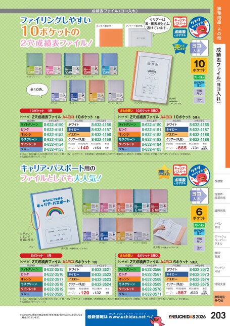 事務用品・その他成績表ファイル(ヨコ入れ)保健室保健室洗面所・面所・洗濯用品濯用品清掃用品清掃用品トイレイ用品品ティッシュシュペーパー・パー・タオルタオル飲料・飲料・食品品キッチンキッチン用品品特別支援別支援事務用品・その他0ポケットコれ1ヨ入クリアーは表・裏表紙ともに透けています。キャリア・パスポート成績表におすすめ成績表ファイル(ヨコ入れ)色つきの裏表紙クリアーの裏表紙ファイリングしやすい10ポケットの2穴成績表ファイル!ライトグリーンピンクモスグリーンワインレッドブルー全10色。ホワイトネイビーイエロークリアー(乳白)オレンジ10ポケット1冊まとめ買い10ポケット5冊入A4/A3判ヨコ中紙なし2穴使用例※通知表はサンプルです。[ウチダ]2穴成績表ファイルA4ヨコ10ポケット1冊商品種別お申込番号商品種別お申込番号[ウチダ]2穴成績表ファイルA4ヨコ10ポケット5冊入商品種別お申込番号商品種別ホワイトネイビーイエロークリアー(乳白)ライトグリーンピンクオレンジモスグリーンワインレッドブルー●寸法/305(縦)×228(横)mm●シート数/5枚(10ポケット)●表紙厚/透明表紙:0.18mm、裏表紙:0.38mm●背幅/1mm●材質/再生ポリプロピレン●中紙なし●包装数:5冊パック1/10ライトグリーンピンクオレンジモスグリーンワインレッドブルー8-632-41808-632-41818-632-41828-632-41838-632-41848-632-41858-632-41508-632-41518-632-41528-632-41538-632-41548-632-41558-632-41568-632-41578-632-41588-632-4159ホワイトネイビーイエロークリアー(乳白)税込価格¥154¥665¥140M価税抜オープンM価税抜オープン税抜価格税抜価格単位1冊お申込番号8-632-41868-632-41878-632-41888-632-4189税込価格¥731単位1組(5冊入)コれ6ヨ入ポケットキャリア・パスポート用の大人気!ファイルとしてもキャリア・パスポート成績表におすすめライトグリーンピンクオレンジモスグリーンワインレッド穴があいているので保管に便利!ブルーホワイトネイビーイエロークリアー(乳白)使用例※用紙はサンプルです。使用例※用紙はサンプルです。6ポケット1冊まとめ買い6ポケット5冊入A4/A3判ヨコ中紙なし2穴[ウチダ]2穴成績表ファイルA4ヨコ6ポケット1冊商品種別お申込番号商品種別お申込番号[ウチダ]2穴成績表ファイルA4ヨコ6ポケット5冊入商品種別お申込番号商品種別ホワイトネイビーイエロークリアー(乳白)ライトグリーンピンクオレンジモスグリーンワインレッドブルー●寸法/305(縦)×228(横)mm●シート数/3枚(6ポケット)●表紙厚/透明表紙:0.18mm、裏表紙:0.38mm●背幅/1mm●材質/再生ポリプロピレン●中紙なし●包装数:5冊パック1/10ライトグリーンピンクオレンジモスグリーンワインレッドブルー8-632-35158-632-35168-632-35178-632-35188-632-35198-632-35208-632-35668-632-35678-632-35688-632-35698-632-35708-632-35718-632-35218-632-35228-632-35238-632-3524ホワイトネイビーイエロークリアー(乳白)税込価格¥132¥567¥120M価税抜オープンM価税抜オープン税抜価格税抜価格単位1冊お申込番号8-632-35728-632-35738-632-35748-632-3575税込価格¥623単位1組(5冊入)※カタログに掲載の商品情報(仕様・価格・税率など)は変更になる場合がございます。最新情報はUCHIDASww.uchidas.netwへ!2026