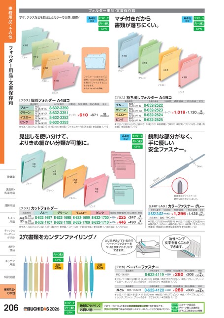 学年、クラスなどを見出しとカラーで分類、整理!A4判ヨコマチ付きだから書類が落ちにくい。A4判ヨコフォルダー用品・文書保存箱×10ブルー×10グリーン×10イエロー×10ピンクファスナーと合わせてご使用いただけば書類に穴を開けてファイルすることもできます。※カットフォルダーも同様。[プラス]個別フォルダーA4ヨコ商品種別お申込番号M価税抜税抜価格税込価格単位ブルーグリーンイエローピンク●寸法/240(+山15)(縦)×311(横)mm●材質/ファイルカード紙(再生紙)●包装数:1/108-632-33508-632-33518-632-33528-632-3353型式/FL-061IFBL型式/FL-061IFGR型式/FL-061IFYL型式/FL-061IFPK¥610¥671オープン1袋(10枚入)×10ブルー×10グリーン×10イエロー×10ピンク[プラス]持ち出しフォルダーA4ヨコ商品種別お申込番号M価税抜税抜価格税込価格単位型式/FL-061PFBL型式/FL-061PFGR型式/FL-061PFYL型式/FL-061PFPKブルーグリーンイエローピンク●寸法/240(+山15)縦)×311(横)mm●収納幅/30mm●材質/ファイルカード紙(再生紙)●包装数:1/108-632-25228-632-25238-632-25248-632-2525オープン¥1,019¥1,120(10枚入)1袋見出しを使い分けて、よりきめ細かい分類が可能に。A4判ヨコ×3×5ブルー×3×5グリーン×3×5イエロー×3×5ピンク[プラス]カットフォルダー商品種別A4判ヨコ3山5山型式/FL-063IF型式/FL-065IFブルーグリーン8-632-16978-632-17078-632-16988-632-1708イエロー8-632-16998-632-1709ピンク8-632-17008-632-1710¥390M価税抜税抜価格税込価格¥247¥490¥225¥446¥650単位1袋(3枚入)1袋(5枚入)●寸法/240(+山15)縦)×311(横)mm●材質/ファイルカード紙(再生紙)●包装数:1/40(3山)、1/20(5山)2穴書類をカンタンファイリング!とじ穴があいているのでペーパーファスナーをつけたままファイリングできます。鋭利な部分がなく、手に優しい安全ファスナー。5mmmm06粉体塗装でファスナーの鋭利な部分をなくしました。[LIHITLAB.]カラーファスナーグレーお申込番号M価税抜税抜価格8-632-2432¥1,800¥1,296¥1,425税込価格単位1箱(50本入)商品種別型式/F8CU-50●穴数/2穴(80mm間隔)用●寸法/10(幅)×200長)mm●脚の長さ/60mm●脚の幅/5mm●材質/スチール(粉体塗装)●背部分に特殊な接着剤付●包装数:1/20油性ペンで文字を書くことができます。収容25枚収容50枚[デビカ]ペーパーファスナー商品種別型式/063201お申込番号8-632-4119M価税抜¥350税抜価格¥280税込価格¥308(30本入)●材質/再生ポリプロピレン●色/ブルー、グリーン、単位1袋●寸法/11(幅)×5厚)×114(高)mmイエロー、オレンジ、ピンク各6本計30本入り●包装数:1/20商品種別厚とじ型式/063202お申込番号M価税抜8-632-4120¥350税抜価格¥280税込価格¥308単位1袋(25本入)●寸法/11幅)×8(厚)×114(高)mm●材質/ポリプロピレン●色/パープル、ピンク、オレンジ、グリーン、ブルー各5本計25本入り●包装数:1/20事務用品・その他フォルダー用品・文書保存箱保健室保健室洗面所・洗面洗濯用品洗濯用清掃用品清掃用品トイレトイ用品用ティッシュティッペーパー・タオルタオル飲料・飲料・食品食キッチンキッチン用品用特別支援特別支事務用品・その他2062026地球にやさしくお買い物このマークのついた商品は地球環境保護に配慮された商品です。グリーンの文字で商品の判別をしやすくしました。どうぞご利用ください。エコマーク認定品グリーン購入法適合品GPNエコ商品ねっと掲載