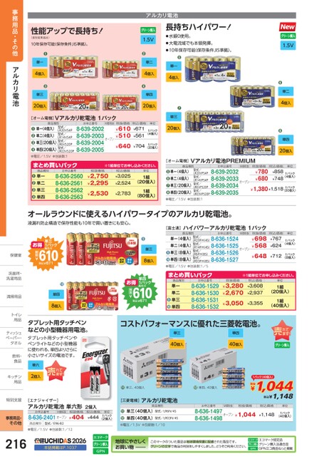 税抜価格¥698¥568税込価格¥767¥624単位1パック(4個入)¥648¥7121パック(8個入)[富士通]ハイパワーアルカリ乾電池1パック商品種別お申込番号M価税抜オープン単一(4個入)型式/単二(4個入)型式/単三(8個入)型式/単四(8個入)型式/LR20FH(4S)8-636-1524LR14FH(4S)8-636-1525LR6FH(8S)8-636-1526LR03FH(8S)8-636-1527●●お申込番号8-636-15298-636-15308-636-15318-636-1532※1組単位申込。税抜価格¥3,280¥2,670¥3,050税込価格¥3,608¥2,937¥3,355単位1組(20個入)1組(40個入)単一単二単三単四●●●電圧/1.5V●包装数:1/5まとめ買いパック商品種別●単三8個入単四1パックあたり610税込¥671税抜¥お得コストパフォーマンスに優れた三菱乾電池。単三40個入単四40個入アルカリ電池1.5V●単二4個入●単四20個入税込価格¥671¥561単位1パック(4個入)¥7041パック(20個入)長持ちハイパワー!●水銀0使用。●大電流域でも本領発揮。●10年保存可能(保存条件JIS準拠)。●単一4個入●単三20個入1.5V●単二4個入❽単四20個入お申込番号8-639-20028-639-20038-639-20048-639-2005M価税抜オープン税抜価格¥610¥510¥640商品種別LR03VS20PLR6VS20P型式/LR20VS4P型式/LR14VS4P単一(4個入)単二(4個入)単三(20個入)型式/単四(20個入)型式/●電圧/1.5V●包装数:1❶●●●まとめ買いパック商品種別[オーム電機]Vアルカリ乾電池1パック性能アップで長持ち!(当社従来品比)10年保存可能(保存条件JIS準拠)。●単一4個入●単三20個入事務用品・その他アルカリ電池¥780¥680税込価格¥858¥748単位1パック(4個入)¥1,380¥1,5181パック(20個入)オープン型式/LR20VPS4P型式/LR14VPS4P8-639-20328-639-20338-639-2034LR03VPS20P8-639-2035LR6VPS20P単一(4個入)単二(4個入)単三(20個入)型式/単四(20個入)型式/●電圧/1.5V●包装数:1❼●❻●[オーム電機]Vアルカリ電池PREMIUM商品種別お申込番号M価税抜税抜価格お申込番号8-636-25608-636-25618-636-25628-636-2563※1組単位申込。税抜価格¥2,750¥2,295¥2,530税込価格¥3,025¥2,524¥2,783単位1組(20個入)1組(80個入)単一単二単三単四●●●●オールラウンドに使えるハイパワータイプのアルカリ乾電池。液漏れ防止構造で保存性能も10年で買い置きにも安心。●単三、40個入●単四、40個入1パック(40個入)税抜¥1,044税込¥1,148お申込番号M価税抜税抜価格8-636-1497オープン¥1,0448-636-1498税込価格単位¥1,1481パック(40個入)[三菱電機]アルカリ乾電池商品種別単三(40個入)型式/LR6N/4S単四(40個入)型式/LR03N/4S●●●電圧/1.5V●包装数:1/10[エナジャイザー]アルカリ乾電池単六形2個入お申込番号M価税抜8-636-2401オープン税抜価格¥404税込価格¥444単位1パック(2個入)商品種別型式/E96-B2●電圧/1.5V●包装数:1/12216本誌掲載はP.1037地球にやさしくお買い物このマークのついた商品は地球環境保護に配慮された商品です。グリーンの文字で商品の判別をしやすくしました。どうぞご利用ください。エコマーク認定品グリーン購入法適合品GPNエコ商品ねっと掲載●単四8個入タブレット用タッチペンなどの小型機器用電池。タブレット用タッチペンやペンライトなどの小型機器に使われる、単四よりさらに小さいサイズの電池です。単六2個入お得単三1パックあたり610税込¥671税抜¥保健室保健室洗面所・洗面洗濯用品洗濯用清掃用品清掃用品トイレトイ用品用ティッシュティッペーパー・タオルタオル飲料・飲料・食品食キッチンキッチン用品用特別支援特別支事務用品・その他