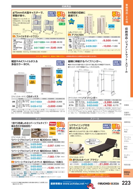 事務用品・その他収納用品・ジョイントマット・スツール保健室保健室洗面所・面所・洗濯用品濯用品清掃用品清掃用品トイレイ用品品ティッシュシュペーパー・パー・タオルタオル飲料・飲料・食品品キッチンキッチン用品品特別支援別支援事務用品・その他沖縄・離島はサービス対象外浅15段浅型15段924mm1031mm深10段深型10段沖縄・離島はサービス対象外B4用紙の収納に最適です。323mm323mm収納用品φ75mmの大型キャスターで、移動が楽々。可動式ファイルサポート付きなので、ファイル1冊でもしっかり支えることができます。3段ワイド677mmタイプ[ナカキン]677mmファイルサポートワゴン677mm2段ワイド677mmタイプ商品種別お申込番号M価税抜税抜価格税込価格単位3段ワイド677mmタイプ2段ワイド677mmタイプ●最大積載質量/各段40kg●お客様組立商品●包装数:1寸法/677幅)×360(奥)×1290高)mm、質量/19.9kg、型式/FSW-6637WG寸法/677幅)×360(奥)×885(高)mm、質量/14.2kg、型式/FSW-6607WG8-617-6884¥72,000¥51,085¥56,1938-617-6887¥48,000¥35,460¥39,0061台オープン1台浅型15段●材質/ポリプロピレン、ポリスチレン●キャスター付(ストッパーなし)●インデックスシール付●色/アイボリー●包装数:1/2¥10,050¥11,0558-636-3681406mm406mmお申込番号M価税抜税抜価格税込価格単位8-636-3671¥9,500¥10,450[JEJアステージ]アプロスB4深型10段商品種別寸法/323幅)×406(奥)×1031(高)mm、引出し内寸/268(幅)×379(奥)×78高)mm、質量/7kg寸法/323(幅)×406奥)×924(高)mm、引出し内寸/268(幅)×379奥)×39(高)mm、質量/7.8kg※メーカー直送品です。返品はご容赦ください。上記商品は受注日から8営業日以内のお届けになります。mm405895〜1500mmmm0ダブル45シングル895〜1500mm縦横に伸縮するパイプハンガー。●掛けるものの量や長さに合わせて幅と高さの伸縮ができます。●キャスター付きで移動がスムーズに行えます。810〜1265mm810〜1265mm(棚板1枚)最大積載質量30kgA4収納可約1015mm3段約290mm(棚板1枚)最大積載質量30kgA4収納可約680mm約290mm約415mm2段[アイリスオーヤマ]CBボックス雑誌やA4ファイルが入る多段カラーBOX。約415mm商品種別2段3段寸法/約415幅)×290(奥)×680高)mm、質量/約7kg、型式/CX-2F寸法/約415幅)×290(奥)×1015高)mm、質量/約10kg、型式/CX-3Fお申込番号8-617-65648-636-4153M価税抜税抜価格税込価格単位オープン¥3,050¥3,355¥3,600¥3,9601台●棚内寸/約390(幅)×275(奥)×320(高)mm●材質/プリント紙化粧パーティクルボード●最大積載質量/2段:50㎏、3段:80kg、棚板1枚あたり:30㎏●固定棚板枚数/2段:1枚●色/オフホワイト●お客様組立商品●包装数:1[アイリスオーヤマ]パイプハンガーM価税抜税抜価格お申込番号商品種別質量/約1.87kg、型式/PI-E180S-H質量/約3.23kg、型式/PI-E280S-H8-625-84898-625-8492シングルダブル●寸法/約810〜1265(幅)×450(奥)×895〜1500(高)mm●耐荷重/全体:約17kgシングル)・約24kgダブル)、ハンガーパイプ1本あたり:約15kg(シングル)・約10kgダブル)、スライドパイプ:1本あたり約1kg●材質/鋼(クロムメッキ、エポキシ樹脂塗装)、ポリプロピレン●色/グレー●お客様組立商品●包装数:1/5(シングル)、1/3ダブル)¥3,280¥3,608¥4,700¥5,170税込価格オープン単位1台マットスツールリクライニング付き折りたたみベッド。●軽々折りたたみができ、扱いやすい軽量タイプです。●マットは厚さ約8cm。布団やマットレスと組み合わせてお使いください。沖縄・離島はサービス対象外使用例背もたれは14段階リクライニング可能です。[アイリスオーヤマ]折りたたみベッドブラウン折りたたみ時商品種別型式/OTB-BRNお申込番号M価税抜税抜価格8-625-8426オープン¥21,000¥23,100税込価格単位1台●寸法/使用時:約880(幅)×2020(奥)×350(高)mm、折りたたみ時:約880(幅)×370(奥)×1040高)mm●マットの厚さ/約80mm●ベッド下の高さ/約205mm●質量/約18.3kg●材質/スチール、ウレタンフォーム、ポリエステル●付属品/六角レンチ●最大使用者体重/約90kg●お客様組立商品●包装数:1※メーカー直送品です。返品はご容赦ください。上記商品は受注日から8営業日以内のお届けになります。1枚で2色楽しめるリバーシブルタイプ!組み合わせ自由自在!●●9枚入16枚入沖縄・離島はサービス対象外(❺❻のみ)単位1セット単位1セットお申込番号M価税抜税抜価格税込価格8-625-8498オープン¥2,057¥2,2628-625-8499商品種別型式/110465型式/110466モカブラウン/ベージュグレー/ホワイト●●[アイリスオーヤマ]リバーシブルジョイントマット幅300mm9枚入使用例リバーシブルジョイントマット幅600mm9枚入商品種別モカブラウン/ベージュグレー/ホワイト型式/110469型式/110470お申込番号M価税抜税抜価格税込価格8-625-8500オープン¥7,083¥7,7918-625-8501リバーシブルジョイントマット幅600mm16枚入商品種別モカブラウン/ベージュグレー/ホワイト型式/110471型式/110472お申込番号M価税抜税抜価格税込価格単位8-625-8502オープン¥13,365¥14,7011セット8-625-8503●寸法(1枚あたり)/❶❷300(幅)×300(奥)×20高)mm、❸❹❺❻600幅)×600(奥)×20(高)mm●質量/❶❷145g、❸❹❺❻555g●材質/ポリエチレン●包装数:❶❷1/6、❸❹1/2、❺❻1〈セット内容〉❶❷❸❹本体9枚/サイドパーツ18本、❺❻