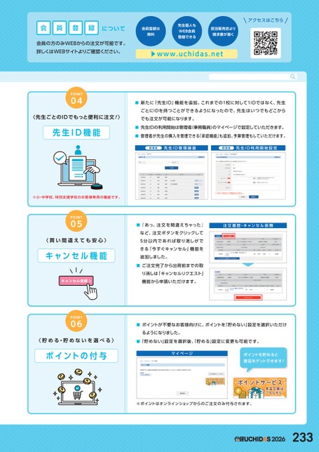 会員登録について会員の方のみWEBからの注文が可能です。詳しくはWEBサイトよりご確認ください。会員登録は無料先生個人もWEB会員登録できる担当販売店より請求書が届く▶www.uchidas.netアクセスはこちらPOINT04〈先生ごとのIDでもっと便利に注文!〉先生ID機能■■■新たに「先生ID」機能を追加。これまでの1校に対して1IDではなく、先生ごとにIDを持つことができるようになったので、先生はいつでもどこからでも注文が可能になります。先生IDの利用開始は管理者(事務職員)のマイページで設定していただきます。管理者が先生の購入を管理できる「承認機能」も追加。予算管理もしていただけます。管理者先生ID管理画面管理者先生ID利用開始設定※小・中学校、特別支援学校のお客様専用の機能です。POINT05〈買い間違えても安心〉キャンセル機能キャンセル依頼POINT06■『あっ、注文を間違えちゃった』注文履歴・キャンセル依頼など、注文ボタンをクリックして5分以内であれば取り消しができる「今すぐキャンセル」機能を追加しました。■ご注文完了から出荷前までの取り消しは「キャンセルリクエスト」機能から申請いただけます。■ポイントが不要なお客様向けに、ポイントを「貯めない」設定を選択いただけるようになりました。〈貯める・貯めないを選べる〉■「貯めない」設定を選択後、「貯める」設定に変更も可能です。ポイントの付与マイページポイントを貯めると景品をゲットできます!※ポイントはオンラインショップからのご注文のみ付与されます。2026233