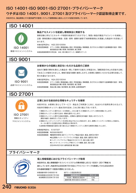 ISO14001・ISO9001・ISO27001・プライバシーマークウチダはISO14001、9001、27001及びプライバシーマーク認証取得企業です。内田洋行は、製品開発とその提供部門の管理システムで国際規格に適合した3つの認証を取得しています。ISO14001ISO14001環境マネジメントシステムISO9001ISO9001品質マネジメントシステムISO27001ISO27001情報セキュリティマネジメントシステム製品アセスメントを配慮し環境保全に貢献する事業活動に伴なうエネルギーや資源の削減を行うだけでなく、取扱い商品の製品アセスメントを実施し、企画・開発段階から商品の製造・流通・使用・廃棄の過程で「地球環境保全」を意識した商品作りを目指しております。●適合証明証No.NQE-20010009A●認証登録範囲オフィス家具、環境設備品、教材、学校設備品、情報機器、及びそれらに関連する設備機器の設計・開発、委託製造品の購入管理、物流管理、施工管理●認証登録事業所の所在地本社・新川第2オフィス・東陽町オフィスお客様からの信頼と満足をいただける品質のご提供当社の「顧客の要求を満たした製品を一貫して提供する能力」が実証され、「顧客満足の向上を目指す企業」であることが認められました。規格の認証を継続・維持しながら、お客様に信頼をいただける企業を目指して、努力を重ねております。●適合証明証No.NQA-20010034A●認証登録範囲オフィス家具、環境設備品、教材、学校設備品、情報機器、及びそれらに関連する設備機器の設計・開発、委託製造品の購入管理、物流管理、施工管理●認証登録組織商品企画、調達、物流管理、施工管理、品質環境部門企業における総合的な情報セキュリティを確保内田洋行は、お客様に安心してサービス・商品をご利用頂くと共に、社会からの信用を得られるよう、内田洋行情報セキュリティ基本方針を定め、これに取り組んでまいります。1.情報セキュリティに関するルールを策定し、これに基づいた情報セキュリティ対策を実施いたします。2.情報セキュリティに関する法令・規制を遵守いたします。3.情報セキュリティに関する体制を整備し、定期的に運用状況の確認・見直しを行うことで、運営の維持・改善を行ってまいります。4.情報セキュリティインシデントを未然に防止することに努めます。また、実際にインシデントが発生した場合も、ルールに基づいた迅速な対応と再発防止に努めます。5.従業者が情報資産を適切に取り扱えるよう情報セキュリティに関する教育を実施いたします。●登録証明証No.IS507337●認証登録組織株式会社内田洋行●認証登録範囲●顧客要求事項に基づくソフトウェア製品の設計、製造、提供及び保守●自主開発パッケージソフトウェアの設計、製造、提供、運用及び保守●パッケージソフトウェア製品のカスタマイズ、導入支援、保守●ネットワーク、ハードウェア等のインフラ構築、設計、導入支援2024年4月21日付適用宣言書第6.5版プライバシーマーク個人情報保護におけるプライバシーマーク取得内田洋行は、個人情報保護マネジメントシステムの要求項目(JISQ15001:2017準拠)を満たしています。内田洋行は2000年7月19日にプライバシーマークを取得してから2024年の付与適格性審査で13回目の更新となりました。●登録番号第10480001号●初回登録日2000年7月19日有効期限日2026年7月18日●Pマーク認証取得状況認証取得状況子会社・関連会社38社中連結対象(持分法含む)20社中Pマーク12社8社2402026