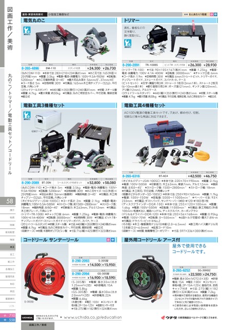 道具・実習用具教材小型加工機器など電気丸のこ目安8人あたり1程度小中トリマー表札、看板などの文字彫り、飾り面取りに。〈丸のこDM-110〉●本体寸法:283×210×234(高さ)mm型式種別本体価格税込価格DM-110スタンド付き¥26,730¥24,300●のこ刃寸法:165(外径)×●回転数:●のこ刃傾斜角度:0〜45°●最大切込み深さ:56mm/0°、37mm/45°●定格時間:30分●付属品:165mm木工用チップソー(52山)、平行●電源・電流・消費電力:100V・9.5A・900W●質量:3.5kg型番8-265-489620(内径)mm5200min-1●コード長さ:5m定規、六角レンチ●質量:4.7kg●組立式〈3ウェイツールスタンド〉●440(幅)×350(奥行)×240(高さ)mm●材質:スチール製●付属品:丸のこ用安全カバー、平行定規、傾斜定規●最大荷重:約30kgアリ錐(12mm)、アルミケース型番8-290-2091型式種別本体価格税込価格TR-100BSビット7本・スタンド付き¥28,930●電源・●チャック口径:6mm●定格時間:30分●付属品:6mmストレートビット、トリマーガイド、●回転数:30000min-1●質量:1.25kg¥26,300〈トリマーTR-100〉●寸法:90×105×167(高さ)mm電流・消費電力:100V・4.1A・400W●コード長さ:1.9mテンプレートガイド、ストレートガイド、スパナ大・小、ケース〈ビットセット〉●文字・溝掘り用3本:ストレート1枚刃(3mm1本)、ストレート2枚刃(6・10mm各1本)●飾り面取り用3本:ボーズ面(21mm)、ギンナン面(20mm)、〈3ウェイツールスタンド〉●440(幅)×350(奥行)×240(高さ)mm●材質:スチール製●質量:4.7kg●最大荷重:約30kg●付属品:平行定規、傾斜定規、丸のこ用安全カバー●組立式電動工具3機種セット電動工具4機種セットAC100V電源の電動工具セットです。穴あけ、締め付け、切削、切断など様々な用途に対応できます。収納ケース型番8-265-6316型式BT-AC4本体価格¥42,500型番8-290-2089型式種別BT-3SNツールスタンド付きセット本体価格¥52,800税込価格¥58,080●電源・電流・消費電力:100V・●質量:3.5kg〈丸のこDM-110〉●コード長さ:5m●回転数:5200min-1●定格時間:30分●のこ刃サイズ:165(外径)×●切込み深さ:56mm(垂直時)●傾斜角度:0〜45°●付属品:木工用9.5A・900W20(内径)mmチップソー(52山)、平行定規、六角レンチ〈オビタルジグソーJSW-100SC〉●コード長さ:2m●質量:2.1kg消費電力:100V・5.5A・500W18mm木工用ブレード、六角レンチ●傾斜角度:左右0〜45°●切断能力:木工63mm、アルミ12mm●ストローク数:約1500〜2800min-1●電源・電流・●ストローク長:●付属品:〈トリマーTR-100B〉●チャック口径:6mm100V・4.1A・400Wテンプレートガイド・ストレートガイド・トリマーガイド、スパナ、ケース●回転数:30000min-1●質量:1.25kg●電源・電流・消費電力:●定格時間:30分●付属品:ビット7本・〈オビタルジグソーJSW-100SC〉●本体寸法:220×70×190mm●電源:100V・500W角度:左右0〜45°●ストローク数:1500〜2800min-1●付属品:木工用刃、平行定規、六角棒レンチ●切断能力:木工63mm、軟鉄7mm、アルミ12mm●ストローク幅:18mm〈吸塵オビタルサンダーSD-100SC〉●本体寸法:250×90×165mm●電源:100V・150W233mm●付属品:ダストバッグ、サンドペーパー(#80・#120・#180)各1枚〈ディスクグラインダーDGR-100〉●本体寸法:255×120×100mm●電源:100V・500W1.6kg100mm・粒度#36)、補助ハンドル、ディスクスパナ、カーボンブラシ〈ドリル&ドライバーDDR-120〉●本体寸法:203×56×168mm●回転数:11000min-1●質量:●付属品:鉄工用砥石(外径●質量:0.95kg●6段トルク切替式・最大7.8N・m●電源:100V・70W●付属品:ドライバービット⊕No.2●回転数:0〜500min-1●回転数:5000〜11000min-1●質量:1.7kg●ペーパー寸法:93×〈3ウェイ・ツールスタンド〉●材質:スチール製●寸法:440(幅)×350(奥行)×240(高さ)mm〈その他〉●木工・樹脂兼用ドリル10本組(2.0〜6.5mm)●鉄工用ハイス鋼ドリル刃●質量:4.7kg●付属品:丸のこ用安全カバー、平行定規、傾斜定規●組立式13本組(2.0〜6.0mm)●延長コード10m〈収納ケース〉●材質:半透明ポリプロピレン製●寸法:716(幅)×425(奥行)×323(高さ)mm〈収納ケース〉●材質:耐衝撃性コーポリマー●寸法:597×336×300(高さ)mm税込価格¥46,750●質量:2.1kg●傾斜コードリールサンデーリール小中屋外用コードリールアース付屋外で使用できるコードリールです。型番8-290-2093本体価格(税込価格)¥14,500(¥15,950)S-30S型型式型番型式8-290-2094本体価格(税込価格)¥16,900(¥18,590)〈S-30S型〉●電線:長さ30m(太さGS-30S型1.25mm²×2芯)●許容電流:15A●質量:5.8kg〈GS-30S型〉●電線:長さ30m(太さ2.0mm²×2芯)●許容電流:22A●質量:6.6kg〈共通仕様〉●電圧:100V●コンセント:単相4個、2P・15A・125V●寸法:275(幅)×182(奥行)×324(高さ)mm●温度センサー付きS-30S型WEBからもカタログをご覧いただけます。www.uchida.co.jp/education図画工作/美術型番型式SG-30KB28-265-6252本体価格(税込価格)¥22,500(¥24,750)●電線:長さ30m(VCT2.0×3芯)●許容電流:15A●コンセント:単相4個、2P・15A・125V、接地付き、防雨キャップ付き●寸法:275(幅)×182●電圧:100V(奥行)×324(高さ)mm●質量:7.2kg※雨中屋外で使用する場合は、使用する機器のコンセントプラグが屋外用プラグ(防雨タイプ)であることをご確認ください。※ご使用の前に必ず取扱い説明書をお読みいただき、正しくご使