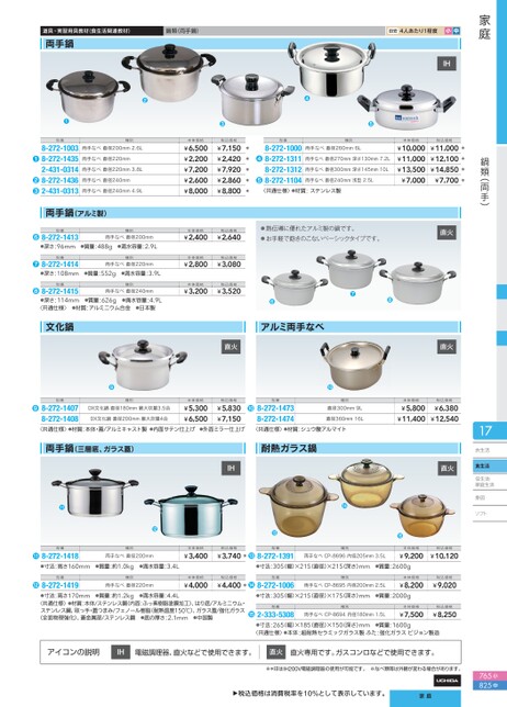家庭鍋類(両手)17衣生活衣生活食生活住生活・家庭生活掛図ソフトト765小825中道具・実習用具教材(食生活関連教材)鍋類(両手鍋)目安4人あたり1程度小中両手鍋IH❷❹❶❸❺本体価格¥6,500¥2,200¥7,200¥2,600¥8,000税込価格¥7,150¥2,420¥7,920¥2,860¥8,800*****型番8-272-10008-272-13118-272-13128-272-1104❹❺種別両手なべ直径260mm6L両手なべ直径270mm深さ130mm7.2L両手なべ直径300mm深さ145mm10L両手なべ直径240mm浅型2.5L本体価格¥10,000¥11,000¥13,500¥7,000税込価格¥11,000¥12,100¥14,850¥7,700****〈共通仕様〉●材質:ステンレス製本体価格¥2,400税込価格¥2,640●熱伝導に優れたアルミ製の鍋です。●お手軽で飽きのこないベーシックタイプです。直火本体価格¥2,800税込価格¥3,080本体価格¥3,200税込価格¥3,520❻❼❽種別両手なべ直径200mm2.6L両手なべ直径220mm両手なべ直径220mm3.8L両手なべ直径240mm両手なべ直径240mm4.9L型番8-272-10038-272-14352-431-03148-272-14362-431-0313❶❷❸両手鍋(アルミ製)❻型番8-272-1413●深さ:96mm❼型番8-272-1414●深さ:108mm種別両手なべ直径200mm●質量:488g●満水容量:2.9L種別両手なべ直径220mm●質量:552g●満水容量:3.9L❽型番8-272-1415●深さ:114mm〈共通仕様〉●材質:アルミニウム合金●日本製●質量:626g●満水容量:4.9L種別両手なべ直径240mm文化鍋アルミ両手なべ直火直火❾型番8-272-14078-272-1408❾種別DX文化鍋直径180mm最大炊量3.5合DX文化鍋直径200mm最大炊量4合本体価格¥5,300¥6,500税込価格¥5,830¥7,150❿型番8-272-14738-272-1474❿種別直径300mm9L直径360mm16L〈共通仕様〉●材質:本体・蓋/アルミキャスト製●内面サテン仕上げ●外面ミラー仕上げ〈共通仕様〉●材質:シュウ酸アルマイト本体価格¥5,800¥11,400税込価格¥6,380¥12,540両手鍋(三層底、ガラス蓋)耐熱ガラス鍋IH直火⓫⓮⓬⓭型番8-272-1418●寸法:高さ160mm種別両手なべ直径200mm本体価格¥3,400税込価格¥3,740*⓭●質量:約1.0kg●満水容量:3.4L8-272-1391●寸法:305(幅)×215(直径)×215(深さ)mm両手なべCP-8696内径205mm3.5L●質量:2600g⓫⓬型番8-272-1419●寸法:高さ170mm種別両手なべ直径220mm本体価格¥4,000税込価格¥4,400*⓮●質量:約1.2kg●満水容量:4.4L〈共通仕様〉●材質:本体/ステンレス鋼(内面:ふっ素樹脂塗膜加工)、はり底/アルミニウム・ステンレス鋼、取っ手・蓋つまみ/フェノール樹脂(耐熱温度150℃)、ガラス蓋/強化ガラス(全面物理強化)、蓋金属部/ステンレス鋼●底の厚さ:2.1mm●中国製⓯本体価格¥9,200税込価格¥10,120型番型番型番種別種別種別8-272-1006●寸法:305(幅)×215(直径)×175(深さ)mm両手なべCP-8695内径200mm2.5L●質量:2000g本体価格¥8,200税込価格¥9,020⓯2-333-5308●寸法:265(幅)×185(直径)×150(深さ)mm両手なべCP-8694内径180mm1.5L●質量:1600g〈共通仕様〉●本体:超耐熱セラミックガラス製ふた:強化ガラスビジョン製造本体価格¥7,500税込価格¥8,250アイコンの説明IH電磁調理器、直火などで使用できます。直火直火専用です。ガスコンロなどで使用できます。※*印はIH200V電磁調理器の使用が可能です。※なべ類等は外観が変わる場合があります。▲税込価格は消費税率を10%として表示しています。家庭