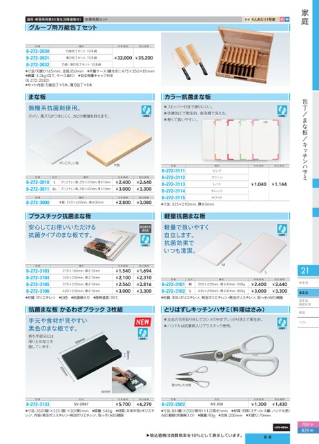 家庭目安4人あたり1程度小中道具・実習用具教材(食生活関連教材)炊事用具セットグループ用万能包丁セット包丁/まな板/キッチンハサミ21衣生活衣生活食生活住生活・家庭生活掛図ソフトトポリエチレン製木製型番8-272-30108-272-3011型式LLL種別ポリエチレン製、220×370mm、厚さ10mmポリエチレン製、230×420mm、厚さ10mm型番8-272-3000種別木製、210×420mm、厚さ30mm本体価格¥2,400¥3,000税込価格¥2,640¥3,300本体価格¥2,800税込価格¥3,0808-272-31118-272-31128-272-31138-272-31148-272-3115●寸法:325×210mm、厚さ3mmピンクグリーンレッドオレンジホワイト型番種別本体価格税込価格¥1,040¥1,144プラスチック抗菌まな板安心してお使いいただける抗菌タイプのまな板です。型番種別本体価格270×160mm、厚さ10mm8-272-31038-272-31048-272-31058-272-3106●材質:ポリエチレン●白色●抗菌剤入り●耐熱温度:90℃320×200mm、厚さ10mm370×220mm、厚さ10mm420×230mm、厚さ10mm¥1,540¥2,100¥2,560¥3,000食品衛生法適合品税込価格¥1,694¥2,310¥2,816¥3,300軽量抗菌まな板軽量で扱いやすく自立します。抗菌効果でいつも清潔。ML型番型式種別本体価格税込価格M8-272-31018-272-3102●材質:本体/ポリエチレン、発泡ポリエチレン・発泡ポリスチレン、取っ手/ABS樹脂¥2,400¥3,000350×225mm、厚さ30mm、580g430×250mm、厚さ30mm、860g¥2,640¥3,300Lとりはずしキッチンハサミ(料理はさみ)●左右の刃を取り外してカシメの中までしっかり洗えて衛生的。●ハンドルは抗菌剤入りプラスチック使用。30mm抗菌まな板かるわざブラック3枚組手元や食材が見やすい黒色のまな板です。持ち手部分には滑り止め加工を施しています。mm053225mm使用例取り外した状態型番型式8-272-3133●寸法:350(幅)×225(奥)×30(厚)mmレン、内部/発泡ポリスチレン・発泡ポリエチレン、取っ手/ABS樹脂●質量:540gSV-2997本体価格税込価格¥5,700¥6,270●材質:本体外部/ポリエチ型番型式8-272-2502●寸法:80(幅)×200(奥行)×12(高さ)mmABS樹脂(抗菌剤入り)●質量:90gNT-200本体価格¥1,300税込価格¥1,430●材質:刃部/ステンレス鋼、ハンドル部/●全長:200mm●刃渡り:70mm型番種別万能包丁セット10本組8-272-20308-272-20318-272-2032●寸法/刃渡り165mm、全長350mm●質量:3.2kg(包丁、ケース含む)●安全保護キャップ付き万能・薄刃包丁セット10本組薄刃包丁セット10本組〈8-272-2032〉●セット内容:万能包丁×5本、薄刃包丁×5本本体価格税込価格¥32,000¥35,200●木製ケース(鍵付き):475×350×85mmまな板無機系抗菌剤使用。ヌメリ、黒ズミがつきにくく、カビの繁殖を抑えます。カラー抗菌まな板●ストッパー付きで滑りにくい。●抗菌加工で衛生的、食洗機で洗える。●軽くて扱いやすい。▲税込価格は消費税率を10%として表示しています。家庭小中