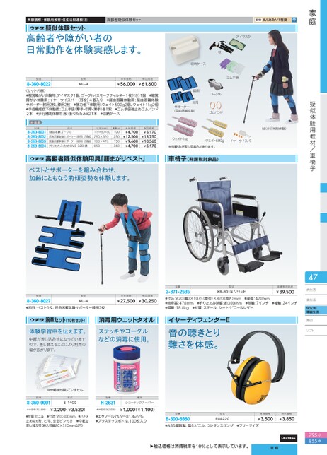 家庭目安8人あたり1程度中実験観察・体験用教材(住生活関連教材)高齢者疑似体験セット疑似体験セット高齢者や障がい者の日常動作を体験実感します。型番8-360-8022型式MU-9本体価格¥56,000税込価格¥61,600〈セット内容〉●視覚障がい体験用:アイマスク1個、ゴーグル(スモークフィルター1枚付き)1個●聴覚障がい体験用:イヤーウイスパー(耳栓)4個入り●屈曲困難体験用:屈曲困難体験サポーター肘用2枚、膝用2枚●筋力低下体験用:ウェイト500g2個、ウェイト1kg2個●手指機能低下体験用:ゴム手袋(厚手・中厚・薄手)各1双●ゴム手袋裾止めゴムバンド2本●歩行補助体験用:杖(折りたたみ式)1本●収納ケースアイマスク杖収納ケースゴム手袋膝用肘用サポーター(屈曲困難体験)ゴーグルゴムバンド疑似体験用教材/車椅子47衣生活衣生活食生活住生活・家庭生活掛図ソフトト分売品型番8-360-80318-360-80328-360-80338-360-8034品名疑似体験ゴーグル寸法(mm)重量(g)170×80×80屈曲困難体験サポーター(膝用)2個組260×620屈曲困難体験サポーター(肘用)2個組180×470折りたたみ式杖CMS-32D黒850100250150360本体価格¥4,700¥12,500¥9,600¥4,700税込価格¥5,170¥13,750¥10,560¥5,170ウェイト1kgウェイト500gイヤーウイスパー※外観・色が変わる場合があります。杖(歩行補助体験)高齢者疑似体験用具「腰まがりベスト」車椅子(非課税対象品)ベストとサポーターを組み合わせ、加齢にともなう前傾姿勢を体験します。型番型式8-360-8027●内容:ベスト1枚、屈曲困難体験サポーター膝用2枚MU-4本体価格¥27,500税込価格¥30,250型番型式2-371-2535●寸法:620(幅)×1035(奥行)×870(高さ)mm●前座高:470mm●折りたたみ時幅:約300mm●質量:18.8kg●材質:スチール、シート/ビニールレザーKR-801Nソリッド非課税対象品¥39,500●座幅:420mm●前輪:7インチ●後輪:24インチ腕章セット(10枚セット)体験学習中を伝えます。中紙が差し込み式になっていますので、差し替えることにより利用の幅が広がります。消毒用ウェットタオルステッキやゴーグルなどの消毒に使用。イヤーディフェンダーⅡ音の聴きとり難さを体感。※中紙は付属していません。型番8-360-0001型式S-1400本体価格(税込価格)¥3,200(¥3,520)●材質:ビニル●寸法:90×400mm●ハトメ止め4ヵ所、ヒモ、安全ピン付き●中紙は差し替え可(挿入可能80×310mm以内)型番H-2631本体価格(税込価格)種別ショードックスーパー¥1,000(¥1,100)●エタノール76.9〜81.4vol%●プラスチックボトル、100枚入り型番型式8-300-6560●ABS樹脂製、塩化ビニル、ウレタンスポンジ●フリーサイズEGA220本体価格¥3,500▲税込価格は消費税率を10%として表示しています。家庭税込価格¥3,850795小855中