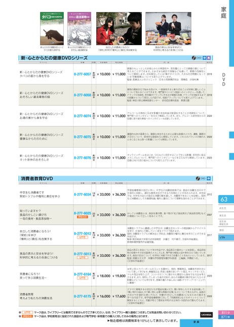 家庭DVD63衣生活衣生活食生活住生活・家庭生活掛図ソフト新・心とからだの健康DVDシリーズタバコの害から身を守る新・心とからだの健康DVDシリーズおそろしい違法薬物の話自立した消費者になろう!「契約」を学び「権利」と「責任」を自覚する食品の表示と安全を学ぼう!科学的に考える力を身につける新・心とからだの健康DVDシリーズタイトル型番時間本体価格税込価格内容DVD中高制作年¥10,000¥11,000喫煙のちょっとした好奇心からの常習性や、若年層にとっての喫煙の害について考えることができます。さまざまな統計や実験などを通して、喫煙の危険性について解説します。近年普及している「電子タバコ」や、大きな社会問題になっている「受動喫煙」についても取り上げています。監修:医療法人いのクリニック日本小児喫煙研究会理事長井埜利博2019¥10,000¥11,000薬物の興味本位で始める恐さや、一度使用すると断ち切ることが非常に難しいことについて考えることができます。専門家やリハビリ施設へのインタビューを通して、ドラッグの危険性、若年層がドラッグに手を出す環境の改善、ドラッグを克服するまでの困難さについて言及した内容です。危険ドラッグについても取り上げています。監修:神奈川県立精神医療センター依存症診療科医長黒澤文貴2019¥10,000¥11,000アルコールが身体に及ぼす影響や未成年者が飲酒をすることの危険性について、専門家へのインタビューを交えて解説しています。また、アルコール依存症からの回復に取り組む患者へのインタビューも収録しています。2020¥10,000¥11,000健康的な体の基準から、健康な体を作るために必要な食事のとり方、運動、睡眠の大切さについて、具体的な数値を元に解説しています。これらのバランスが崩れたときに生じる心身への影響についても解説しています。2020¥10,000¥11,000オンラインゲームをはじめ、SNSなどに依存することで生じる影響、依存症に陥るメカニズムについて、専門家へのインタビューなどを交えながら解説しています。回復に向けた取り組みについても取り上げています。20200分約20分約20分約20分約20分約2新・心とからだの健康DVDシリーズタバコの害から身を守る8-277-6057新・心とからだの健康DVDシリーズおそろしい違法薬物の話8-277-6058新・心とからだの健康DVDシリーズお酒の害から身を守る8-277-6074新・心とからだの健康DVDシリーズ健康なからだのために8-277-6075新・心とからだの健康DVDシリーズネット依存のおそろしさ8-277-6076消費者教育DVDタイトル型番時間本体価格税込価格内容DVD中制作年中学生も消費者です契約トラブルや権利と責任を学ぶ8-277-603416分¥33,000¥36,300学習指導要領の改訂に伴い、中学生の消費者教育では、普段の消費生活の中で主体的に判断し、適切な意思決定ができる力を育むことが求められます。本作品では、中学生の自らの身近な消費行動を通して、消費者であることを自覚し、契約など消費者としての基礎知識、権利と責任について理解を深めることができます。201222分¥33,000¥36,300かしこい消費者とは、食品を選ぶ際、食べ物の「旬」食品表示」食品添加物」などの情報について正しく知ることです。2007¥33,000¥36,300消費者トラブルに遭遇した中学生が、消費生活センターの相談員からアドバイスを受け、主体的に行動していく姿をドラマで描きます。契約、消費者トラブルの解決法と予防法、消費者の権利と責任を学ぶことができる作品です。監修:東京経済大学現代法学部教授弁護士村千鶴子。文部科学省選定。教育映像祭優秀作品賞受賞。2017¥33,000¥36,300食品の表示と安全について学ぶ作品です。食品表示の基本ルールを説明し、食品添加物の役割やその安全基準のメカニズムを、専門家の解説と図や表を交えて描いていきます。食品の安全について、科学的に判断できる力を養うことをねらいとしています。監修:相模女子大学栄養科学部管理栄養学科教授三輪操。字幕版つき。〈文部科学省選定〉2017¥18,000¥19,800¥16,000¥17,600お笑い芸人ラバーガールのコントを題材に、契約、悪質商法、消費者市民社会について楽しく学びます。悪質商法は、若者に被害の多いデート商法、キャッチセールス、マルチ商法を取り上げ、コントのセリフに隠された意図から身を守る方法を考えさせます。また、契約してしまった後の対処や、自らの消費者行動が社会にもたらす影響などについても学びます。授業の導入や話し合い活動(アクティブ・ラーニング)に最適!2020ドラマに登場する小学生たちが商品を選んだり、買い物をしたりする姿を通して、「買い物の仕組み」や「買い物に必要な情報の収集」などについて考えながら、金銭の大切さや計画的な使い方など、児童が〈自立した消費者〉になるための基本を学べる内容です。新学習指導要領に対して、売買契約」などのポイントについて解説するとともに、児童が考えて意見を共有する主体的・対話的な行動も行えます。〈文部科学省選定〉20209分約15分約27分約40分約2知って