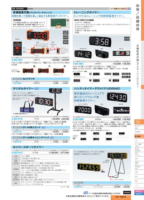 体育/保健体育多機能表示器(タイマー)/タイマー53体つくりり運動器械運動陸上運動水泳ボール運動ボール運動(球技)(球技)得点板・整理用品表現(ダンス)ン)武道武道運動会用品各種体育用品保健掛図模型ソフトト865小649中発表・表示用教材得点板目安内容等によって異なる小中多機能表示器(デジタイマーチャレンジ)時間を使って授業を楽しく演出する教室用デジタイマー。トレーニングタイマーコンパクトなトレーニング用時間管理タイマー。[活用用途]ドリル学習、5分間テスト、百マス計算、グループ学習、学習発表会、試合時間、縄跳びチャレンジ、ストップウォッチ、タイマー、プログラムタイマー操作部操作パネル電源用DCジャック正面スタート/ストップスイッチ(操作パネルにもスタート/ストップスイッチがあります。)背面壁掛け用穴ブザーハンディ設計AC100V屋内用マグネットスチール黒板やホワイトボードに貼り付けることができます。[多彩に活用できる6機能]1.タイマー(予鈴付き)2.ストップウォッチ(スプリット、メモリー、オートスタート、アップカウントタイマー)3.バスケット30秒タイマー4.プログラムタイマー5.得点(サーブ権、得セット付き)6.時計AC100V得点表示時背面操作部型番型式8-303-5023●寸法:263(幅)×46(奥行)×118(高さ)mm●日本製UD0010本体価格税込価格¥20,000¥22,000●ACアダプタ3m1個付き●質量:470gデジタイマーチャレンジ機能関連別売品型番8-303-5003ACアダプタ型式UP0010本体価格¥3,300税込価格¥3,630デジタルタイマースポーツ、イベント、授業で。目的に合わせて使える多機能タイマー。離れた場所からリモコンで操作できます。※本製品は屋内専用です。型番型式本体価格8-303-5118●寸法:570(幅)×120(奥行)×200(高さ)mm●内容:本体×1台、赤外線リモコン×1台、電源ケーブル(5m)付きアダプタ×1個●質量:2.3kg¥55,000DT-40●材質:ABS樹脂製税込価格¥60,500関連別売品型番8-303-5119DT-40用スタンド型式KT-011本体価格¥30,000税込価格¥33,000型番型式8-301-8551●寸法:540(幅)×125(奥行)×200(高さ)mm●電源:AC100V50/60Hz●最大消費電力:20WUX0020本体価格¥53,000税込価格¥58,300●質量:2.2kg●電源コード付き●日本製トレーニングタイマー機能ハンディタイマーアウトドア(UD0040)野外競技のトレーニングで使うストップウォッチ兼時間管理タイマー。タイマー表示時背面操作部型番型式本体価格税込価格UD0040¥92,4008-303-5002●寸法:540(幅)×125(奥行)×200(高さ)mm●数字高さ:120mm(5桁)●表示方法:電子ペーパー●電源:単三乾電池×4個(別売)●電池寿命:アルカリ単三乾電池×4個で約140時間、ニッケル水素充電池で約100時間●ブザーの大きさ:103dB(1m)●日本製¥84,000●質量:1.9kg※防水機能はありませんので、屋外での常設は避けてください。●寸法:480(幅)×558(奥行)×870(高さ)mm●質量:5.1kg●材質:鋼板製関連別売品型番8-303-5120DT-40用キャリングバック型式DT-01本体価格¥7,500税込価格¥8,250ハンディータイマー機能セイコースポーツタイマー型番8-303-5110型式ST-306本体価格¥338,000税込価格¥371,800材質寸法質量表示器アルミ(黄色)1230(幅)×150(奥行)mm12.5kg(乾電池含む)磁気反転式ロータリーバー(黄色)、文字高200mm、6桁計測機能表示機能電源使用場所構成加算/最大99時間59分59秒・59分59秒9・59分59秒99、減算/99時間59分59秒〜1秒(設定最小単位1秒)、リピート/0から設定時間までを自動的に繰り返し(設定時間ごとにブザーを鳴らすこともできます)時計(24時間表示)、得点単三電池×8個(DC12V)屋内・屋外(ただし、屋外に常設しないでください)スポーツタイマー(ST-306)本体1台、電池ボックス(本体内蔵)1個、グリップスイッチ(ST-006)1本〈セイコー製〉タイム計測はもちろん、ゲームタイムの表示、回数表示、得点表示などが可能です。使用例(得点表示)関連別売品型番8-303-5111種別スタンドST-30本体価格¥55,000税込価格¥60,500スタンドST-30▲税込価格は消費税率を10%として表示しています。体育/保健体育マークの商品は運賃・荷造費を別途いただきます。