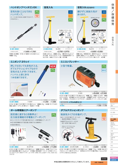体育/保健体育空気入れ97体つくりり運動器械運動陸上運動水泳ボール運動(球技)得点板・整理用品表現(ダンス)ン)武道武道運動会用品各種体育用品保健掛図模型ソフトト909小693中ハンドポンプペンタゴンDX空気を抜くこともできるハンドポンプ。ホースと針が本体に収納できるので、かさばらない。競技用ボール向給排気可能空気入れ空気入れ(圧力計付)錆びずに高耐久性があります。高性能圧力計付き一輪車向大・中玉向競技用ボール向一輪車向大・中玉向競技用ボール向型番8-301-8532本体価格(税込価格)型式HPGDXSL¥1,600(¥1,760)●材質:ABS樹脂●寸法:37(直径)×253(長さ)mm●質量:130g型番2-346-6105本体価格(税込価格)型式No.900種別タイヤポンプ¥2,700(¥2,970)●全高:640mm●最大約12kgf/cm3まで可能●アダプタ(オートバイ、自転車球技用ボールなど)付き●強化プラスチック製●日本製●質量:600g型番2-346-6106本体価格(税込価格)型式No.910種別タイヤポンプ¥5,000(¥5,500)●質量:680g●アダプタ(自動車、自転車、オートバイ、球技用ボール、ゴムボート、大玉など)●高性能圧力計●最大約12kgf/cm3付き●エンジニアリングプラスチック製シリンダー●日本製ミニコンプレッサー小型で軽量。競技用ボール向競技用ボール向給気のみミニポンプ2ウェイ押しても引いても空気が入る、ダブルアクションタイプなので空気の注入が早くできます。ハンドル上部に針を1本収納できます。使用例型番8-301-8908●寸法:30(幅)×340(奥行)×30(高さ)mm樹脂、延長ホース/PU、針/真ちゅう●延長ホース内蔵F-2597本体価格¥1,350税込価格¥1,485●質量:60g●材質:ポンプ/ABS型番型式本体価格税込価格¥27,5008-301-8902●寸法:96(幅)×260(奥行)×185(高さ)mm●最高圧力:0.6MPa●700mmホース付き●付属品:ノズル4点セット(エアダスター、自転車用、テーパーノズル、ボール用)●空気量14L/分(0.2MPa時)●消費電力:85W●電源:AC100V¥25,000●質量:3kgE1005関連別売品ノズル4点セット型番B-3352種別4点セット本体価格¥1,000税込価格¥1,100ボール用電動エアーポンプ設定値に達すると自動停止!圧力設定機能付き電動エアーポンプ!●コンパクトサイズで持ち運び楽々なボール専用電動エアーポンプ!●圧力設定機能付きで設定値に到達すると自動停止!●急速充電対応。ダブルアクションポンプ吸排気タイプの手動ポンプ。競技用ボール向●ホースの付け替えで、ボールの吸排気が簡単にできます。●直径70cmのカラー大玉が80〜90秒で膨らみます。空気注入アダプタ注入口は6、8、10、16mmに対応。10mm16mm8mm6mm大・中玉向給排気可能型番型式本体価格税込価格型番AC-EP1008-301-9062●寸法:42(幅)×54(奥行)×209(高さ)mm●圧力設定機能:最大1.5kgf/cm2●付属品:専用収納ケース、ホース内用パッキン、ヨーロピアンタイプ針スペーサー、ビーチボール用ノズル、USBケーブル、100VACアダプタ¥11,000●材質:アルミニウム●質量:約460g¥10,000型式種別本体価格税込価格UA-2N(大玉用)8-301-8907●寸法:100(幅)×220(奧行)×380(高さ)mm●材質:本体/ポリプロピレン、ホース部/ポリエチレン●空気注入口アダプタ4種(外径6〜16mm)付き●質量:710g¥3,800¥4,180給・排気式※デザインが変わることがあります。▲税込価格は消費税率を10%として表示しています。体育/保健体育