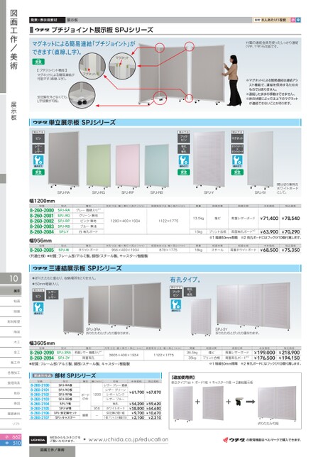 1122×177536.5kg板面材質塩ビ板面仕様両面レザーボード35kgプリント合板両面有孔ボード※2本体価格¥199,000¥176,500税込価格¥218,900¥194,150※1暗線50mm間隔※2有孔ボードにはフックが10個付属します。[追加使用例]単立タイプ1台+ボード1枚+キャスター1個→2連結展示板発表・表示用教材展示板プチジョイント展示板SPJシリーズマグネットによる簡易連結「プチジョイント」ができます(直線、L字)。マグネット【プチジョイント機能】マグネットによる簡易連結が可能です(直線、L字)。マグネット安定脚を外さなくても、L字設置が可能。単立展示板SPJシリーズ掲示方法ピン目安8人あたり1程度小中付属の連結金具を使ったしっかり連結(Y字、十字)も可能です。※マグネットによる簡易連結は連結アシスト機能で、連結を保持するためのものではありません。※連結したままの移動はできません。※床の状態によっては上下のマグネットが連結できないことがあります。掲示方法フックピン掲示方法マグネットホワイトボードホワイトボード×有孔孔×有レザー×レザーSPJ-RASPJ-RGSPJ-RPSPJ-RBSPJ-YSPJ-W間仕切り兼用のホワイトボードとして。幅1200mm型番8-260-20808-260-20818-260-20828-260-20838-260-2084幅956mm型番8-260-2085型式SPJ-RASPJ-RGSPJ-RPSPJ-RBSPJ-Y型式SPJ-W種別外形寸法:幅×奥行×高さ(mm)板面有効寸法:幅×高さ(mm)質量板面材質板面仕様本体価格税込価格グレー暗線入り※1グリーン無地ピンク無地ブルー無地白有孔ボード1200×400×19341122×177513.5kg塩ビ両面レザーボード¥71,400¥78,54013kgプリント合板※1暗線50mm間隔※2有孔ボードにはフックが10個付属します。両面有孔ボード※2¥63,900¥70,290種別外形寸法:幅×奥行×高さ(mm)板面有効寸法:幅×高さ(mm)ホワイトボード956×400×1934878×1775質量18kg板面材質スチール板面仕様両面ホワイトボード本体価格¥68,500税込価格¥75,350〈共通仕様〉●材質:フレーム部/アルミ製、脚部/スチール製、キャスター/樹脂製三連結展示板SPJシリーズ●折りたたむと重なり、収納場所をとりません。●50mm暗線入り。掲示方法ピンレザー×レザー有孔タイプ。掲示方法フックピン有孔×有孔SPJ-3RA折りたたむとぴったり重なります。SPJ-3Y折りたたむとぴったり重なります。幅3605mm型番型式種別外形寸法:幅×奥行×高さ(mm)板面有効寸法:幅×高さ(mm)質量SPJ-3RA8-260-20908-260-2094●材質:フレーム部/アルミ製、脚部/スチール製、キャスター/樹脂製両面レザー暗線入り※1SPJ-3Y両面有孔3605×400×1934関連別売品部材SPJシリーズ型番8-260-21008-260-21018-260-21028-260-21038-260-21048-260-21058-260-21068-260-2107型式SPJ-RA板SPJ-RG板SPJ-RP板SPJ-RB板SPJ-Y板SPJ-W板SPJ-安定脚セットSPJ-キャスター種別幅(mm)仕様本体価格税込価格レザーグレー暗線レザーグリーン1200レザーピンク¥61,700¥67,870ボードのみ956脚部-レザーブルー有孔ホワイトボード安定脚2個1組1個アジャスト機能付き¥54,200¥58,800¥9,700¥2,100¥59,620¥64,680¥10,670¥2,310WEBからもカタログをご覧いただけます。www.uchida.co.jp/educationの教育機器はベルマークで購入できます。図画工作/美術折りたたみ可能図画工作/美術展示板10展示絵画版画彫刻彫塑陶芸木工金工紙工作紙工作各種加工整理用具色彩掛図鑑賞資料ソフトソ小中662510