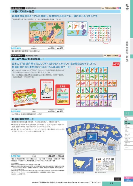 社会教授用掛図(地域)地理(地図)地理(掛図・食育)地理(地球儀)地理(模型)模)歴史・公民公(掛図)掛)歴史・公民公(模型)模)体験学習用具ソフトト小中発表・表示用教材教授用掛図など木製パズル日本地図各都道府県の形をリアルに表現し、特産物や名所なども一緒に学べるパズルです。「都道府県形丸覚え表」は語呂合わせで楽しく都道府県の形が覚えられます。目安内容等によって異なる小中型番型式8-222-5329●寸法:527(幅)×26(奥行)×334(高さ)mm83809発表・表示用教材教授用掛図(地域)本体価格¥4,000税込価格¥4,400目安内容等によって異なる小はじめての47都道府県カード日本の47都道府県をたのしく学べる!ゆるくてかわいい生き物などのイラストで、都道府県の形を直感的におぼえられる都道府県カード!●「エイのかたちのほっかいどう」など、かわいいイラストが都道府県の形になぞらえて描かれているので、イメージで覚えることができます。●カードの裏面には都道府県の人口・面積などの基本情報の他、特産物や名産物、伝統工芸品をイラスト付きで紹介。型番種別8-222-5332●セット内容:カード48枚、日本地図ポスター、ガイド3個組本体価格¥4,500税込価格¥4,950都道府県学習カード●都道府県の名称や位置の学習を、クイズ形式で楽しく、気軽に行えます。●県庁所在地・自然環境・特産物・歴史上の人物など、基礎から面白い情報まで収録。豊富な情報を、社会科資料として活用いただけます。●各県に関するクイズを収録したデジタルクイズ付き。電子黒板やタブレットPCで活用できます。(インターネット接続が必要です。)型番種別本体価格税込価格8-223-7001●寸法:A4判/297(幅)×210(高さ)mm47枚組¥25,080●カード式●47枚組●両面カラー印刷¥22,800(PP加工)●収納ケース、解説書付き、デジタルクイズアクセスキー付き〈主な収録事項〉表面:県の形(県庁所在地プロット)、日本全図における位置裏面:県名、県名のいわれ、面積・人口、県章、県庁所在地、県花・県鳥・県木、地理・歴史事項(自然・特産品・名産・名所・歴史人物など)、経済事項(出荷額1位工業製品、県民所得、耕地面積、商品販売額など)〈デジタルクイズ動作環境〉●対応ブラウザ:GoogleChrome、MicrosoftEdge、AppleSafari、MozillaするPC、タブレット●インターネットに接続できる環境●推奨解像度:1280×768px※インストールは不要です。Firefoxの各最新版が動作表面:県の形と位置裏面:県の基本データ▲カタログ有効期間中に価格・仕様が変更になる場合があります。あらかじめご了承ください。情報/視聴覚(ICT教具)社会
