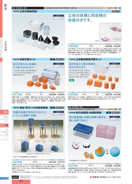 発表・表示用教材(図形)図形説明器具(説明器(面積・体積原理、立体求積))目安1校あたり1程度中立体求積説明器対応単元●1年:空間図形立体の体積と同容積の容器付きです。数振2・5型番型式本体価格税込価格使用例2-283-0500●寸法:格納ケース/310(幅)×210(奥行)×150(高さ)mm、四角柱(木製)/100(幅)×100(奥行)×100(高さ)mm●内容:円柱・円錐・四角柱・四角錐(透明樹脂製・木製各1)半球(透明樹脂製1・木製2)計11個、透明リットルます(1L)1個、水槽・バット兼用樹脂製ケース¥48,400¥53,240PP-8※ケースは、水槽(蓋はバット)として使用することができます。体積学習セット高さが変わると体積はどう変わるのだろう?10mm厚に分解した板を積み重ねることで立方体・円柱の構成および体積を学習します。1年数振2・5対応単元●1年:空間図形立体構成観察学習セット高さを変えた時の体積の変化を考えます。立方体・直方体・円柱・三角柱とそれぞれを10mm厚で分割した板のセットで、体積を求める基本的な学習に使用できます。対応単元●1年:空間図形型番型式種別本体価格税込価格型番型式種別本体価格税込価格CW-3B8-231-1002●材質:木製、オレンジ色塗装●基準寸法:100(幅)×100(高さ)mm●柱体:立方体・円柱(いずれも底面に平行に10mm厚で10分割)各1個、三角柱(直角二等辺)2個●容器:透明樹脂製2種●1リットルます付き●格納ケース:樹脂製、360(幅)×250¥36,000¥39,6006種(奥行)×220(高さ)mm8-230-6020●材質:木製、オレンジ色塗装●基準寸法:100×100mm●セット内容:立方体・直方体・円柱・三角柱各1個、それぞれの底面と同形の板(10mm厚)各10枚●ケース付き¥56,000¥61,600CW-48種角柱・角すいの体積実験器1年数振2・5角錐の体積が角柱の3分の1ということを実際に体験。対応単元●1年:空間図形発表・表示用教材(図形)図形説明器具(説明器(球の表面積・体積))球の表面積・体積説明器目安1校あたり1程度中1年数振2・5球の表面積と体積を実際の操作を通し体感できます。対応単元●1年:空間図形数学立体求積共用教材数と式図形関数データのデータ活用ソフトソ高さの違いによる体積変化の実験ができます。※カラーサンドの色は変更することがあります。型番型式本体価格税込価格CP-322-283-0630●透明アクリル製●寸法:大/80×80×320(高さ)mm、中/80×80×160(高さ)mm、小/80×80×80(高さ)mm●内容:四角柱/大・中・小各1個、四角錐/大・中・小各3個、実験用カラーサンド/1kg入り3袋、四角錐固定用実験台3個、カラーサンド収納ポリケース袋3本付き※実験用カラーサンドは、食品衛生上、害になりません。¥66,100¥72,710模型を変形※色が変更になることがあります。型番型式本体価格税込価格8-231-1021●表面積説明用球:半球2個、直径100mm、面ファスナー付き、ひも(太さ4mm、長さ4m)1本付き●体積説明用球:球1個、球1個、球の6分割(三角錐)1個●体積比較用水槽:2連式、塩ビ製●ケース:プラスチック製、350(幅)×235(奥行)×160(高さ)mm¥39,000¥42,900CW-10中WEBからもカタログをご覧いただけます。www.uchida.co.jp/education/catalogの教育機器はベルマークで購入できます。数学