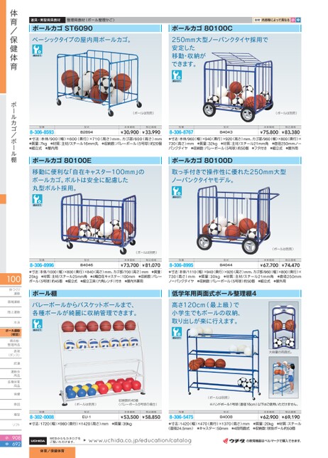道具・実習用具教材整理用教材(ボール整理かご)ボールカゴST6090ベーシックタイプの屋内用ボールカゴ。目安内容等によって異なる小中ボールカゴ80100C250mm大型ノーパンクタイヤ採用で安定した移動・収納ができます。型番型式本体価格税込価格型番型式本体価格税込価格(ボールは別売)(ボールは別売)8-306-8593●寸法:本体/900(幅)×600(奥行)×710(高さ)mm、カゴ部/600(高さ)mm●質量:7kg●材質:主材/スチール16mm丸●収納数:バレーボール(5号球)約20個●組立式●屋内用¥30,900¥33,990B28948-306-8767¥83,380●寸法:本体/960(幅)×940(奥行)×920(高さ)mm、カゴ部/960(幅)×800(奥行)×730(高さ)mm●質量:32kg●材質:主材/スチール21mm角●直径250mmノーパンクタイヤ●収納数:バレーボール(5号球)約50個●フタ付き●組立式●屋外用¥75,800B4043ボールカゴ80100E移動に便利な「自在キャスター100mm」のボールカゴ。ボルトは安全に配慮した丸型ボルト採用。ボールカゴ80100D取っ手付きで操作性に優れた250mm大型ノーパンクタイヤモデル。型番型式本体価格税込価格型番型式本体価格税込価格(ボールは別売)(ボールは別売)8-306-8996●寸法:本体/1000(幅)×800(奥行)×840(高さ)mm、カゴ部/700(高さ)mm●質量:25kg●材質:主材/スチール25mm角●4輪自在キャスター:100mm●収納数:バレーボール(5号球)約45個●組立式●組立工具(六角レンチ)付き●屋内外兼用¥73,700¥81,070B40468-306-8995●寸法:本体/1110(幅)×940(奥行)×920(高さ)mm、カゴ部/960(幅)×800(奥行)×730(高さ)mm●質量:30kg●材質:主材/スチール21mm角●直径250mmノーパンクタイヤ●収納数:バレーボール(5号球)約50個●組立式●屋外用¥67,700¥74,470B4044ボール棚バレーボールからバスケットボールまで、各種ボールが綺麗に収納管理できます。低学年用両面式ボール整理棚4高さ120cm(最上級)で小学生でもボールの収納、取り出しが楽に行えます。大容量の両面式。(ボールは別売)収納数約40個(バレーボール5号球の場合)(ボールは別売)※ハンドボール1号球(直径16cm)以下はご使用いただけません。型番型式本体価格8-302-0008●寸法:1720(幅)×980(奥行)×1420(高さ)mm●質量:39kgEU-1¥53,500税込価格¥58,850型番形式本体価格税込価格8-306-5475●寸法:1420(幅)×470(奥行)×1370(高さ)mm●質量:20kg●材質:スチール¥62,900¥69,190(直径24.5mm)●キャスター:50mm●4段両面式●収納数:球技ボール約50個B4008WEBからもカタログをご覧いただけます。www.uchida.co.jp/education/catalogの教育機器はベルマークで購入できます。体育/保健体育体育/保健体育ボールカゴ/ボール棚100体つくりつ運動器械運動陸上運動水泳ボール運動(球技)得点板・・整理用品表現(ダンス)(武道運動会用品各種体育用品保健掛図模型ソフトソ小中908692